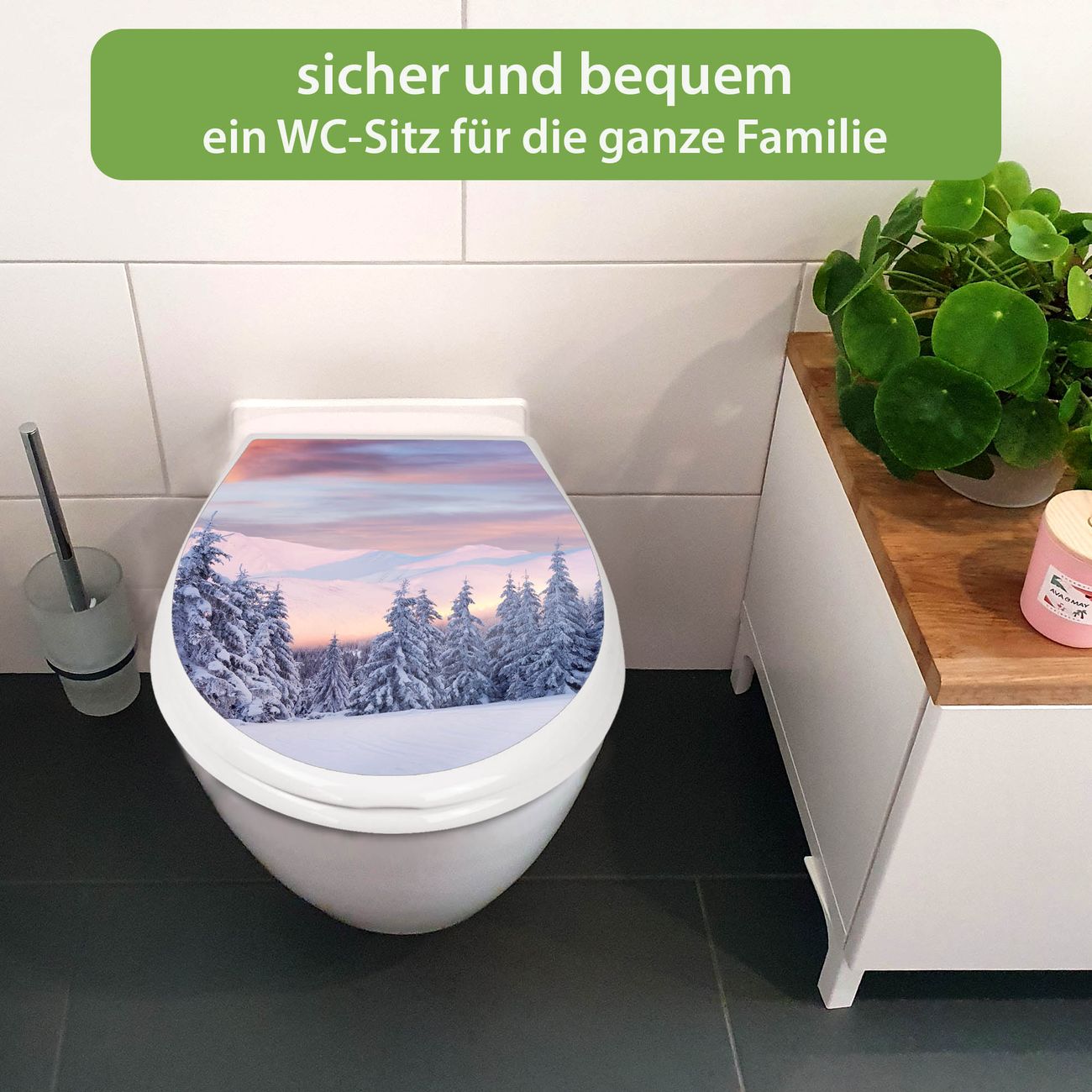 FUNKTION:Mit dem banjado Familien WC Sitz mit Absenkautomatik und dem Motiv Motiv Verschneite Berge verbinden Sie Design mit Funktionalität. Sie erhalten den Toilettendeckel in bewährt guter Qualität mit Montagematerial passend auf alle Euro-WC-Becken. Die Gesamtgröße beträgt 37,1cm x 44,9cm x 5cm, die Grundfarbe ist weiß.</p> DESIGN:Der Klodeckel in weiß mit Motiv Motiv Verschneite Berge hat eine ansprechende Optik, eine besondere Form und ist sehr stabil. Das Motiv besteht aus einer farbbrillianten Motivfolie, die durch ein Schutzlaminat zusätzlich vor Kratzern schützt. Der integrierte Kindersitz fügt sich harmonisch ein. DETAILS:Der Toilettensitz mit Soft Close besteht aus hochwertigem Polypropylen, ist geruchlos, ungiftig und kann mit handelsüblicher Seife gereinigt werden. Die Montage kann von von oben oder von unten erfolgen und ist kinderleicht. NUTZEN:Mit Hilfe der detaillierten Aufbauanleitung ermöglichen wir eine schnelle und unkomplizierte Montage. Die banjado Klobrille ist universell geeignet für alle Euro-WC-Schüsseln. Der Kindersitz kann unkompliziert entfernt werden. BANJADO:Ihr WC-Deckel wird in Sachsen in einer kleinen Manufaktur von Hand veredelt. Die Motivfolie ist lösungsmittelfrei und schutzlaminiert für einen langen Halt. Wir wünschen viel Freude bei der Auswahl eines schönen Motivs.