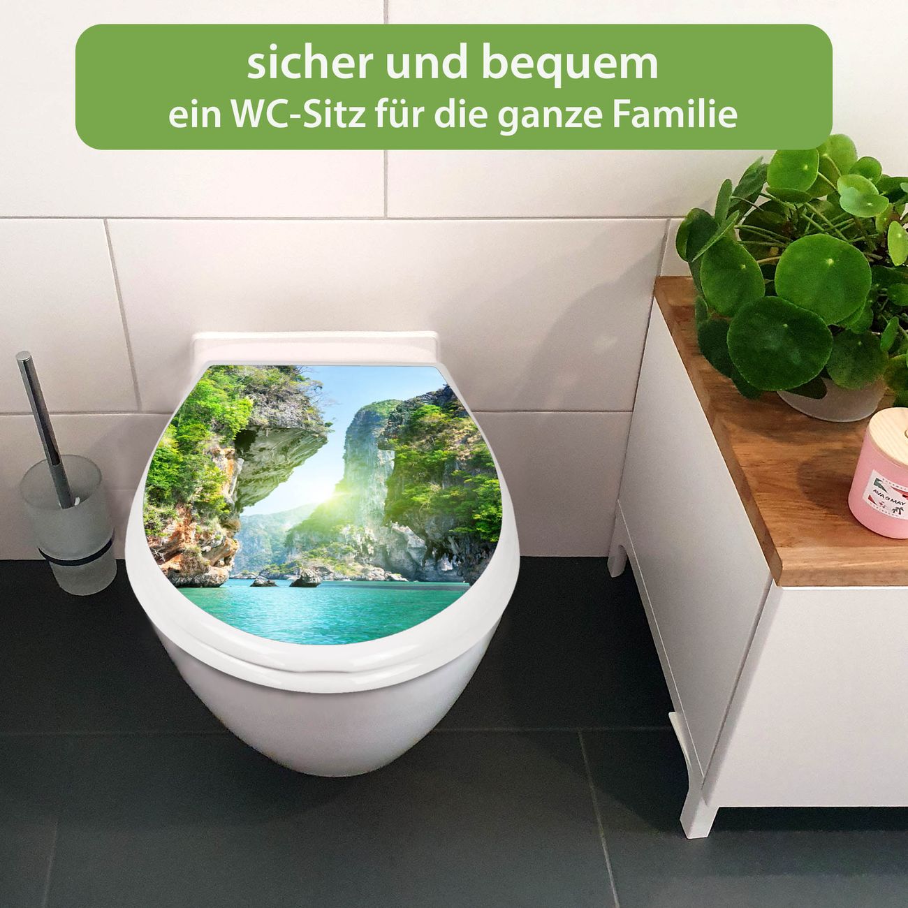 FUNKTION:Mit dem banjado Familien WC Sitz mit Absenkautomatik und dem Motiv Motiv Versteckte Bucht verbinden Sie Design mit Funktionalität. Sie erhalten den Toilettendeckel in bewährt guter Qualität mit Montagematerial passend auf alle Euro-WC-Becken. Die Gesamtgröße beträgt 37,1cm x 44,9cm x 5cm, die Grundfarbe ist weiß.</p> DESIGN:Der Klodeckel in weiß mit Motiv Motiv Versteckte Bucht hat eine ansprechende Optik, eine besondere Form und ist sehr stabil. Das Motiv besteht aus einer farbbrillianten Motivfolie, die durch ein Schutzlaminat zusätzlich vor Kratzern schützt. Der integrierte Kindersitz fügt sich harmonisch ein. DETAILS:Der Toilettensitz mit Soft Close besteht aus hochwertigem Polypropylen, ist geruchlos, ungiftig und kann mit handelsüblicher Seife gereinigt werden. Die Montage kann von von oben oder von unten erfolgen und ist kinderleicht. NUTZEN:Mit Hilfe der detaillierten Aufbauanleitung ermöglichen wir eine schnelle und unkomplizierte Montage. Die banjado Klobrille ist universell geeignet für alle Euro-WC-Schüsseln. Der Kindersitz kann unkompliziert entfernt werden. BANJADO:Ihr WC-Deckel wird in Sachsen in einer kleinen Manufaktur von Hand veredelt. Die Motivfolie ist lösungsmittelfrei und schutzlaminiert für einen langen Halt. Wir wünschen viel Freude bei der Auswahl eines schönen Motivs.