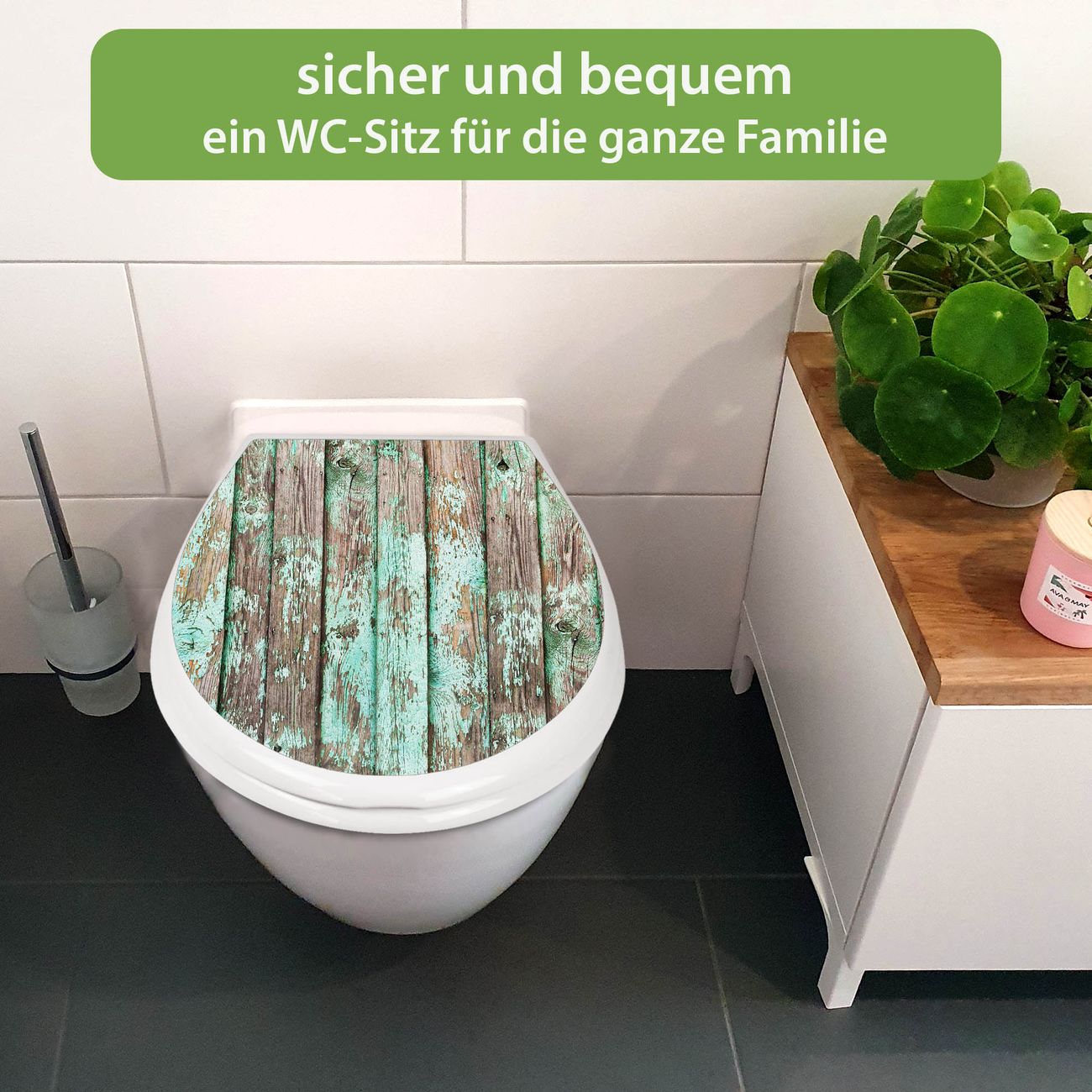 FUNKTION:Mit dem banjado Familien WC Sitz mit Absenkautomatik und dem Motiv Motiv Verwittertes Holz verbinden Sie Design mit Funktionalität. Sie erhalten den Toilettendeckel in bewährt guter Qualität mit Montagematerial passend auf alle Euro-WC-Becken. Die Gesamtgröße beträgt 37,1cm x 44,9cm x 5cm, die Grundfarbe ist weiß.</p> DESIGN:Der Klodeckel in weiß mit Motiv Motiv Verwittertes Holz hat eine ansprechende Optik, eine besondere Form und ist sehr stabil. Das Motiv besteht aus einer farbbrillianten Motivfolie, die durch ein Schutzlaminat zusätzlich vor Kratzern schützt. Der integrierte Kindersitz fügt sich harmonisch ein. DETAILS:Der Toilettensitz mit Soft Close besteht aus hochwertigem Polypropylen, ist geruchlos, ungiftig und kann mit handelsüblicher Seife gereinigt werden. Die Montage kann von von oben oder von unten erfolgen und ist kinderleicht. NUTZEN:Mit Hilfe der detaillierten Aufbauanleitung ermöglichen wir eine schnelle und unkomplizierte Montage. Die banjado Klobrille ist universell geeignet für alle Euro-WC-Schüsseln. Der Kindersitz kann unkompliziert entfernt werden. BANJADO:Ihr WC-Deckel wird in Sachsen in einer kleinen Manufaktur von Hand veredelt. Die Motivfolie ist lösungsmittelfrei und schutzlaminiert für einen langen Halt. Wir wünschen viel Freude bei der Auswahl eines schönen Motivs.
