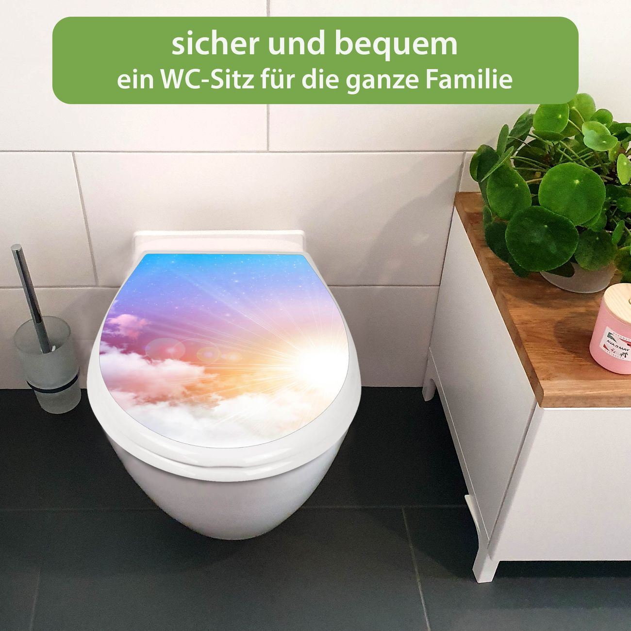 FUNKTION:Mit dem banjado Familien WC Sitz mit Absenkautomatik und dem Motiv Motiv Vögel am Himmel verbinden Sie Design mit Funktionalität. Sie erhalten den Toilettendeckel in bewährt guter Qualität mit Montagematerial passend auf alle Euro-WC-Becken. Die Gesamtgröße beträgt 37,1cm x 44,9cm x 5cm, die Grundfarbe ist weiß.</p> DESIGN:Der Klodeckel in weiß mit Motiv Motiv Vögel am Himmel hat eine ansprechende Optik, eine besondere Form und ist sehr stabil. Das Motiv besteht aus einer farbbrillianten Motivfolie, die durch ein Schutzlaminat zusätzlich vor Kratzern schützt. Der integrierte Kindersitz fügt sich harmonisch ein. DETAILS:Der Toilettensitz mit Soft Close besteht aus hochwertigem Polypropylen, ist geruchlos, ungiftig und kann mit handelsüblicher Seife gereinigt werden. Die Montage kann von von oben oder von unten erfolgen und ist kinderleicht. NUTZEN:Mit Hilfe der detaillierten Aufbauanleitung ermöglichen wir eine schnelle und unkomplizierte Montage. Die banjado Klobrille ist universell geeignet für alle Euro-WC-Schüsseln. Der Kindersitz kann unkompliziert entfernt werden. BANJADO:Ihr WC-Deckel wird in Sachsen in einer kleinen Manufaktur von Hand veredelt. Die Motivfolie ist lösungsmittelfrei und schutzlaminiert für einen langen Halt. Wir wünschen viel Freude bei der Auswahl eines schönen Motivs.