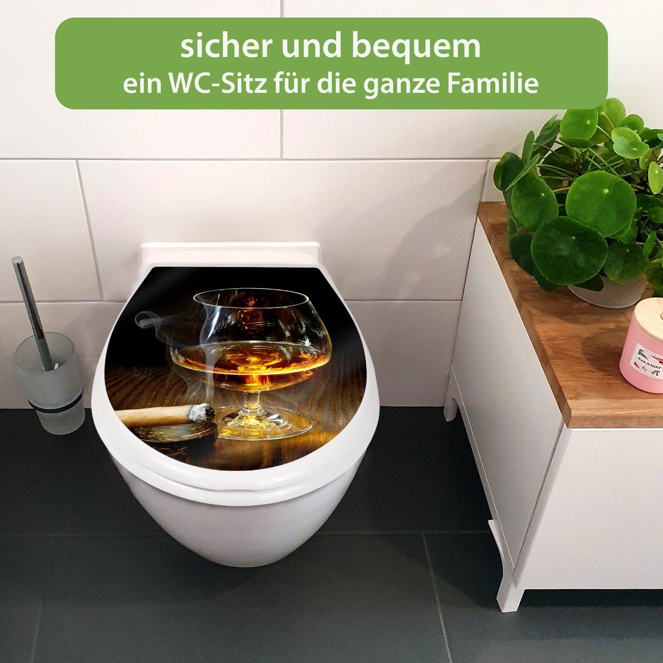 FUNKTION:Mit dem banjado Familien WC Sitz mit Absenkautomatik und dem Motiv Motiv Whiskey & Cigar verbinden Sie Design mit Funktionalität. Sie erhalten den Toilettendeckel in bewährt guter Qualität mit Montagematerial passend auf alle Euro-WC-Becken. Die Gesamtgröße beträgt 37,1cm x 44,9cm x 5cm, die Grundfarbe ist weiß.</p> DESIGN:Der Klodeckel in weiß mit Motiv Motiv Whiskey & Cigar hat eine ansprechende Optik, eine besondere Form und ist sehr stabil. Das Motiv besteht aus einer farbbrillianten Motivfolie, die durch ein Schutzlaminat zusätzlich vor Kratzern schützt. Der integrierte Kindersitz fügt sich harmonisch ein. DETAILS:Der Toilettensitz mit Soft Close besteht aus hochwertigem Polypropylen, ist geruchlos, ungiftig und kann mit handelsüblicher Seife gereinigt werden. Die Montage kann von von oben oder von unten erfolgen und ist kinderleicht. NUTZEN:Mit Hilfe der detaillierten Aufbauanleitung ermöglichen wir eine schnelle und unkomplizierte Montage. Die banjado Klobrille ist universell geeignet für alle Euro-WC-Schüsseln. Der Kindersitz kann unkompliziert entfernt werden. BANJADO:Ihr WC-Deckel wird in Sachsen in einer kleinen Manufaktur von Hand veredelt. Die Motivfolie ist lösungsmittelfrei und schutzlaminiert für einen langen Halt. Wir wünschen viel Freude bei der Auswahl eines schönen Motivs.