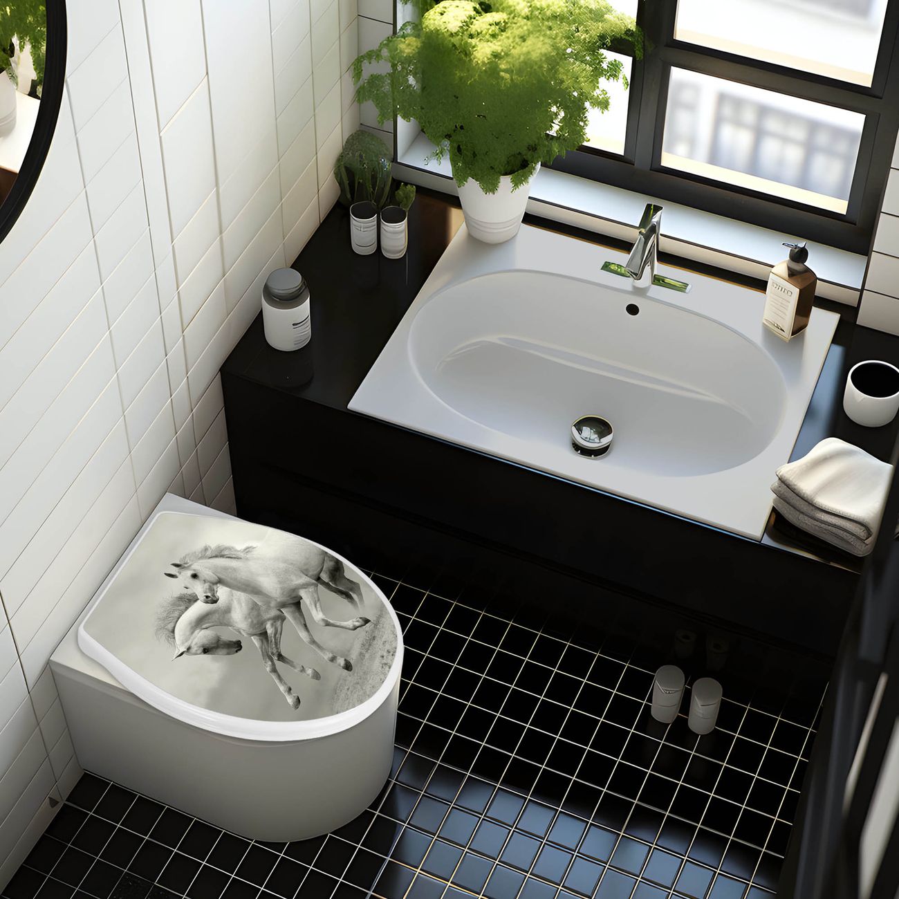 FUNKTION:Mit dem banjado Familien WC Sitz mit Absenkautomatik und dem Motiv Wilde Pferde SW verbinden Sie Design mit Funktionalität. Sie erhalten den Toilettendeckel in bewährt guter Qualität mit Montagematerial passend auf alle Euro-WC-Becken. Die Gesamtgröße beträgt 37cm x 44,5cm x 5cm, die Grundfarbe ist weiß.</p> DESIGN:Der Klodeckel in weiß mit Motiv Wilde Pferde SW hat eine ansprechende Optik, eine besondere Form und ist sehr stabil. Das Motiv besteht aus einer farbbrillianten Motivfolie, die durch ein Schutzlaminat zusätzlich vor Kratzern schützt. Der integrierte Kindersitz fügt sich harmonisch ein. DETAILS:Der Toilettensitz mit Soft Close besteht aus hochwertigem Polypropylen, ist geruchlos, ungiftig und kann mit handelsüblicher Seife gereinigt werden. Die Montage kann von von oben oder von unten erfolgen und ist kinderleicht. NUTZEN:Mit Hilfe der detaillierten Aufbauanleitung ermöglichen wir eine schnelle und unkomplizierte Montage. Die banjado Klobrille ist universell geeignet für alle Euro-WC-Schüsseln. Der Kindersitz kann unkompliziert entfernt werden. BANJADO:Ihr WC-Deckel wird in Sachsen in einer kleinen Manufaktur von Hand veredelt. Die Motivfolie ist lösungsmittelfrei und schutzlaminiert für einen langen Halt. Wir wünschen viel Freude bei der Auswahl eines schönen Motivs.