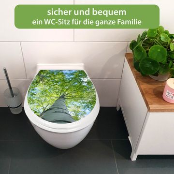 FUNKTION:Mit dem banjado Familien WC Sitz mit Absenkautomatik und dem Motiv Motiv Zwischen Bäumen 5 verbinden Sie Design mit Funktionalität. Sie erhalten den Toilettendeckel in bewährt guter Qualität mit Montagematerial passend auf alle Euro-WC-Becken. Die Gesamtgröße beträgt 37,1cm x 44,9cm x 5cm, die Grundfarbe ist weiß.</p> DESIGN:Der Klodeckel in weiß mit Motiv Motiv Zwischen Bäumen 5 hat eine ansprechende Optik, eine besondere Form und ist sehr stabil. Das Motiv besteht aus einer farbbrillianten Motivfolie, die durch ein Schutzlaminat zusätzlich vor Kratzern schützt. Der integrierte Kindersitz fügt sich harmonisch ein. DETAILS:Der Toilettensitz mit Soft Close besteht aus hochwertigem Polypropylen, ist geruchlos, ungiftig und kann mit handelsüblicher Seife gereinigt werden. Die Montage kann von von oben oder von unten erfolgen und ist kinderleicht. NUTZEN:Mit Hilfe der detaillierten Aufbauanleitung ermöglichen wir eine schnelle und unkomplizierte Montage. Die banjado Klobrille ist universell geeignet für alle Euro-WC-Schüsseln. Der Kindersitz kann unkompliziert entfernt werden. BANJADO:Ihr WC-Deckel wird in Sachsen in einer kleinen Manufaktur von Hand veredelt. Die Motivfolie ist lösungsmittelfrei und schutzlaminiert für einen langen Halt. Wir wünschen viel Freude bei der Auswahl eines schönen Motivs.