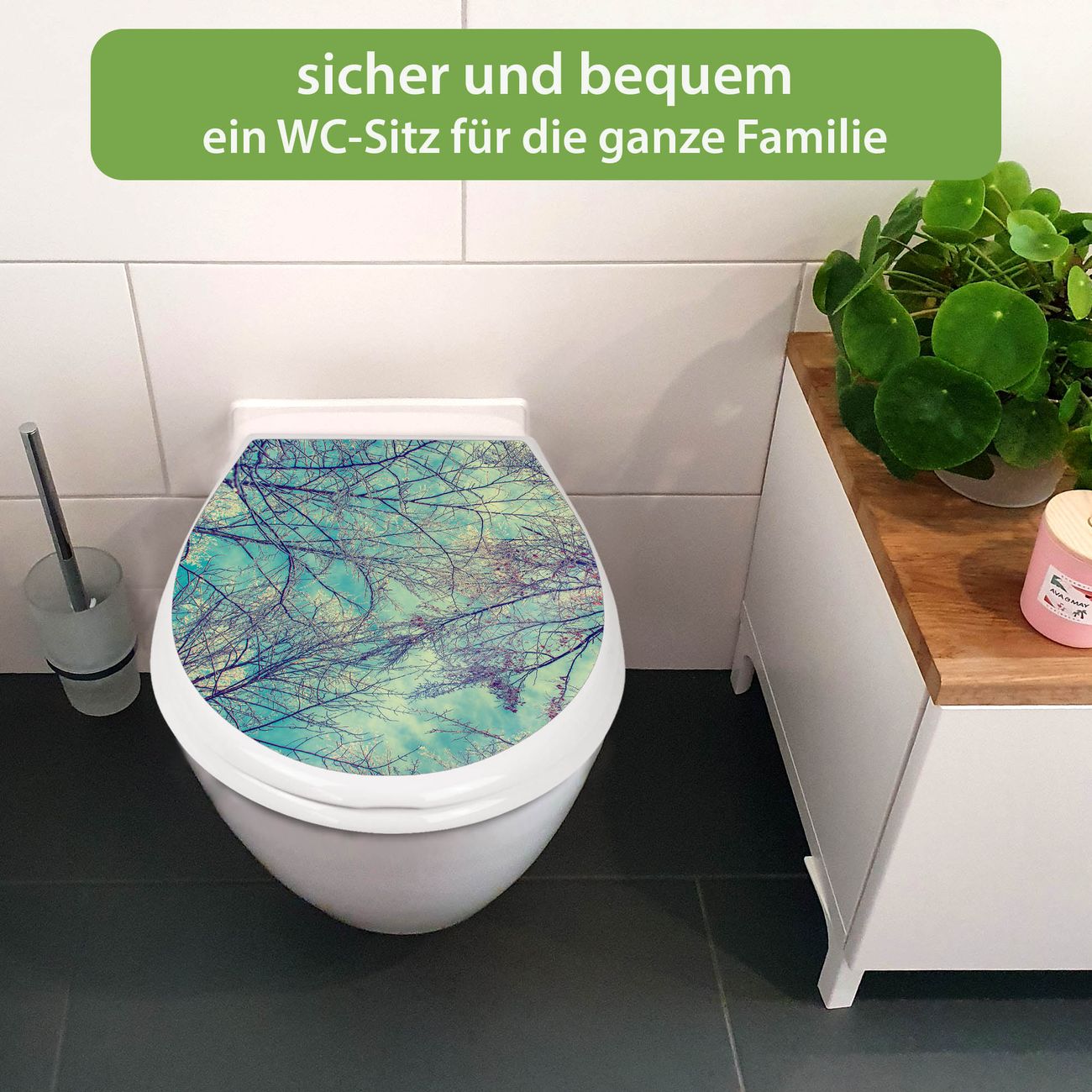 FUNKTION:Mit dem banjado Familien WC Sitz mit Absenkautomatik und dem Motiv Motiv Zwischen Bäumen 8 verbinden Sie Design mit Funktionalität. Sie erhalten den Toilettendeckel in bewährt guter Qualität mit Montagematerial passend auf alle Euro-WC-Becken. Die Gesamtgröße beträgt 37,1cm x 44,9cm x 5cm, die Grundfarbe ist weiß.</p> DESIGN:Der Klodeckel in weiß mit Motiv Motiv Zwischen Bäumen 8 hat eine ansprechende Optik, eine besondere Form und ist sehr stabil. Das Motiv besteht aus einer farbbrillianten Motivfolie, die durch ein Schutzlaminat zusätzlich vor Kratzern schützt. Der integrierte Kindersitz fügt sich harmonisch ein. DETAILS:Der Toilettensitz mit Soft Close besteht aus hochwertigem Polypropylen, ist geruchlos, ungiftig und kann mit handelsüblicher Seife gereinigt werden. Die Montage kann von von oben oder von unten erfolgen und ist kinderleicht. NUTZEN:Mit Hilfe der detaillierten Aufbauanleitung ermöglichen wir eine schnelle und unkomplizierte Montage. Die banjado Klobrille ist universell geeignet für alle Euro-WC-Schüsseln. Der Kindersitz kann unkompliziert entfernt werden. BANJADO:Ihr WC-Deckel wird in Sachsen in einer kleinen Manufaktur von Hand veredelt. Die Motivfolie ist lösungsmittelfrei und schutzlaminiert für einen langen Halt. Wir wünschen viel Freude bei der Auswahl eines schönen Motivs.
