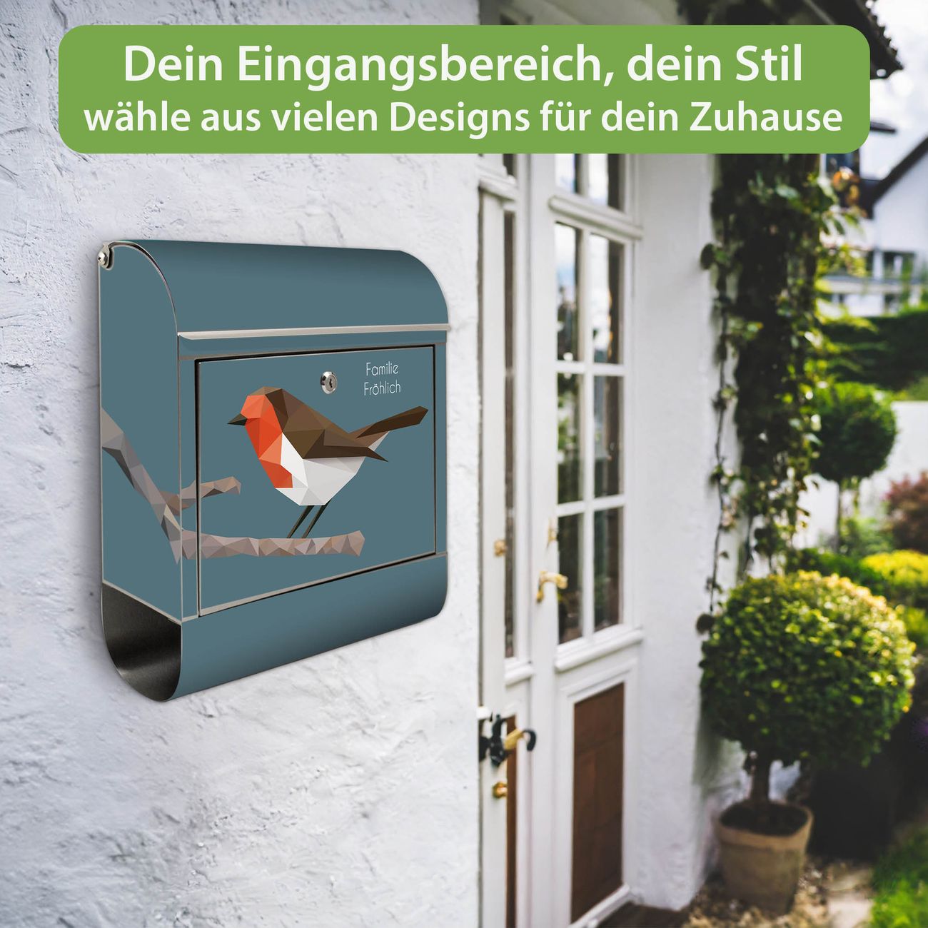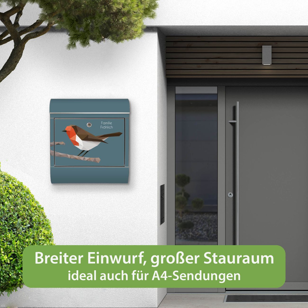 FUNKTION: Der banjado Edelstahl Briefkasten mit Motiv Motiv abstrakter Vogel bietet Ihnen mit seinem Fassungsvermögen genügend Platz auch für große A4 Sendungen. Das integrierte Zeitungsfach eignet sich hervorragend um unkompliziert die Tageszeitung zu fassen. Auf Wunsch können Sie bei uns den passenden Ständer kaufen und so aus dem Wandbriefkasten einen Standbriefkasten machen. DESIGN: Der Motivbriefkasten hat ein sehr ansprechendes und ausgefallenes Design, damit entlocken Sie Ihren Nachbarn und dem Postboten ein Lächeln. Heben Sie Sich ab von der tristen grauen Masse ohne auf Funktionalität zu verzichten. DETAILS: Der Design Briefkasten mit Motiv Motiv abstrakter Vogel besteht aus hochwertigem 18/0 Edelstahl. Das Motiv besteht aus einer wetter- und UV-resistenten Folie, die mit einem Schutzlaminat überzogen ist. Der Briefkasten wird mit Montagematerial und zwei Schlüsseln geliefert. NUTZEN: Sie können diesen Briefkasten sowohl als Wandbriefkasten montieren oder einen passenden Ständer auswählen und als Standbriefkasten einbetonieren. Die Größe bietet genügend Platz für Sendungen aller Art, das hochwertige Edelstahl ist rostfrei und die Motivfolie absolut wetterfest. SCHUTZ: Um Ihre Post optimal vor Witterungseinflüssen wie Starkregen zu schützen, empfehlen wir, den Briefkasten geschützt anzubringen. BANJADO: Ihr Briefkasten wird in Sachsen in einer kleinen Manufaktur von Hand veredelt. Die Motivfolie ist lösungsmittelfrei und schutzlaminiert, dies sorgt für einen langen Halt. Wir legen großen Wert auf die Verbindung von Funktionalität und Design. Sie erhalten Handarbeit aus Sachsen.