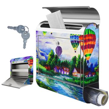 FUNKTION: Der banjado Edelstahl Briefkasten mit Motiv Motiv Ballons In Lila Wolken bietet Ihnen mit seinem Fassungsvermögen genügend Platz auch für große A4 Sendungen. Das integrierte Zeitungsfach eignet sich hervorragend um unkompliziert die Tageszeitung zu fassen. Auf Wunsch können Sie bei uns den passenden Ständer kaufen und so aus dem Wandbriefkasten einen Standbriefkasten machen. DESIGN: Der Motivbriefkasten hat ein sehr ansprechendes und ausgefallenes Design, damit entlocken Sie Ihren Nachbarn und dem Postboten ein Lächeln. Heben Sie Sich ab von der tristen grauen Masse ohne auf Funktionalität zu verzichten. DETAILS: Der Design Briefkasten mit Motiv Motiv Ballons In Lila Wolken besteht aus hochwertigem 18/0 Edelstahl. Das Motiv besteht aus einer wetter- und UV-resistenten Folie, die mit einem Schutzlaminat überzogen ist. Der Briefkasten wird mit Montagematerial und zwei Schlüsseln geliefert. NUTZEN: Sie können diesen Briefkasten sowohl als Wandbriefkasten montieren oder einen passenden Ständer auswählen und als Standbriefkasten einbetonieren. Die Größe bietet genügend Platz für Sendungen aller Art, das hochwertige Edelstahl ist rostfrei und die Motivfolie absolut wetterfest. SCHUTZ: Um Ihre Post optimal vor Witterungseinflüssen wie Starkregen zu schützen, empfehlen wir, den Briefkasten geschützt anzubringen. BANJADO: Ihr Briefkasten wird in Sachsen in einer kleinen Manufaktur von Hand veredelt. Die Motivfolie ist lösungsmittelfrei und schutzlaminiert, dies sorgt für einen langen Halt. Wir legen großen Wert auf die Verbindung von Funktionalität und Design. Sie erhalten Handarbeit aus Sachsen.