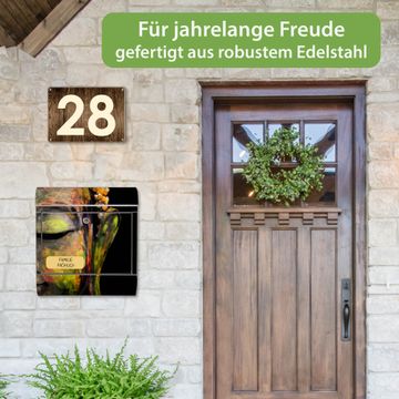 FUNKTION: Der banjado Edelstahl Briefkasten mit Motiv Motiv Bunter Buddha bietet Ihnen mit seinem Fassungsvermögen genügend Platz auch für große A4 Sendungen. Das integrierte Zeitungsfach eignet sich hervorragend um unkompliziert die Tageszeitung zu fassen. Auf Wunsch können Sie bei uns den passenden Ständer kaufen und so aus dem Wandbriefkasten einen Standbriefkasten machen. DESIGN: Der Motivbriefkasten hat ein sehr ansprechendes und ausgefallenes Design, damit entlocken Sie Ihren Nachbarn und dem Postboten ein Lächeln. Heben Sie Sich ab von der tristen grauen Masse ohne auf Funktionalität zu verzichten. DETAILS: Der Design Briefkasten mit Motiv Motiv Bunter Buddha besteht aus hochwertigem 18/0 Edelstahl. Das Motiv besteht aus einer wetter- und UV-resistenten Folie, die mit einem Schutzlaminat überzogen ist. Der Briefkasten wird mit Montagematerial und zwei Schlüsseln geliefert. NUTZEN: Sie können diesen Briefkasten sowohl als Wandbriefkasten montieren oder einen passenden Ständer auswählen und als Standbriefkasten einbetonieren. Die Größe bietet genügend Platz für Sendungen aller Art, das hochwertige Edelstahl ist rostfrei und die Motivfolie absolut wetterfest. SCHUTZ: Um Ihre Post optimal vor Witterungseinflüssen wie Starkregen zu schützen, empfehlen wir, den Briefkasten geschützt anzubringen. BANJADO: Ihr Briefkasten wird in Sachsen in einer kleinen Manufaktur von Hand veredelt. Die Motivfolie ist lösungsmittelfrei und schutzlaminiert, dies sorgt für einen langen Halt. Wir legen großen Wert auf die Verbindung von Funktionalität und Design. Sie erhalten Handarbeit aus Sachsen.