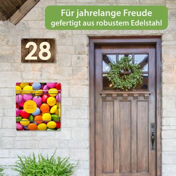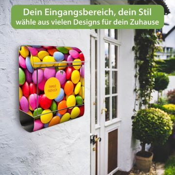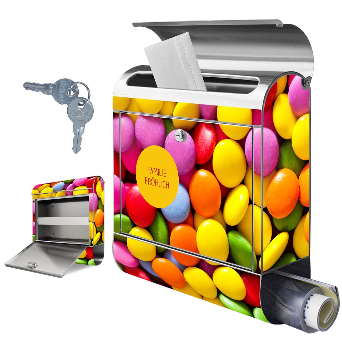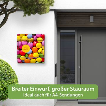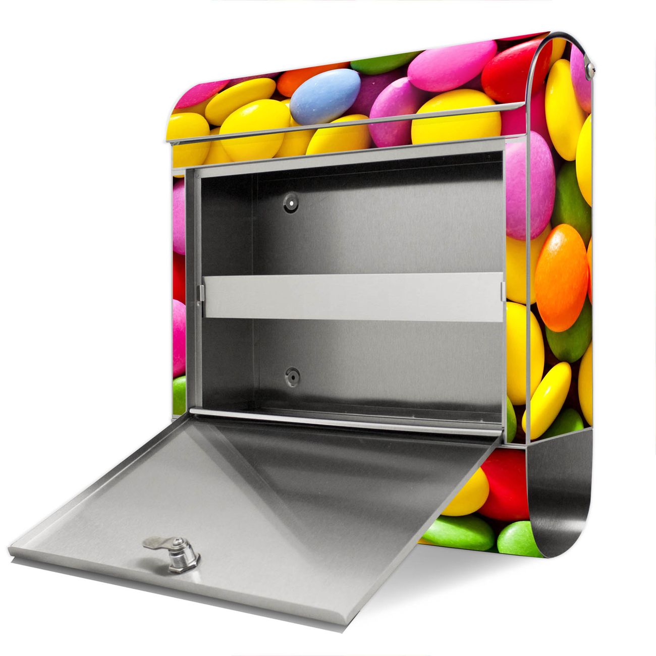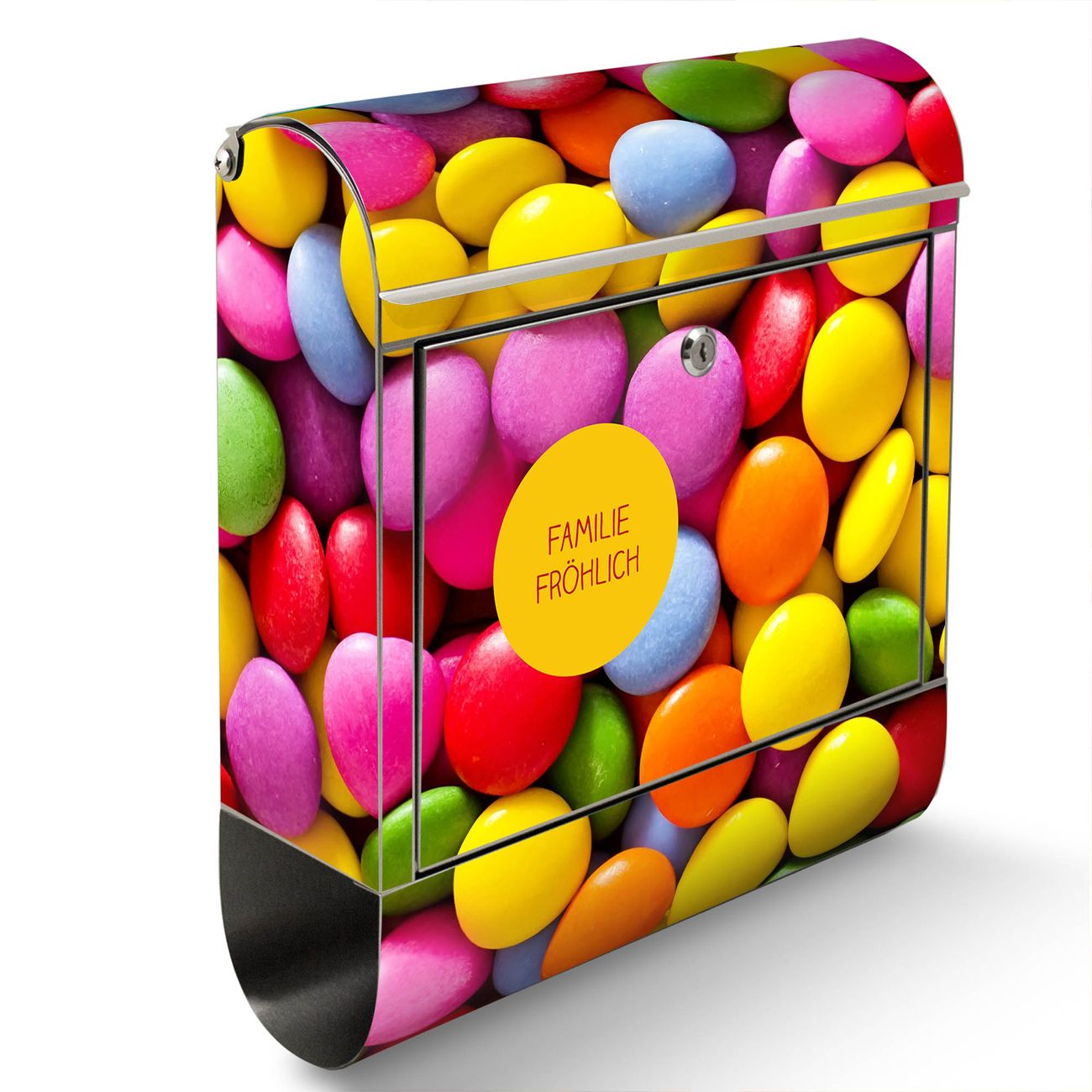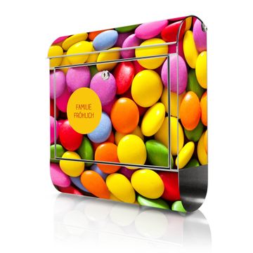 FUNKTION: Der banjado Edelstahl Briefkasten mit Motiv Motiv Dragees bietet Ihnen mit seinem Fassungsvermögen genügend Platz auch für große A4 Sendungen. Das integrierte Zeitungsfach eignet sich hervorragend um unkompliziert die Tageszeitung zu fassen. Auf Wunsch können Sie bei uns den passenden Ständer kaufen und so aus dem Wandbriefkasten einen Standbriefkasten machen. DESIGN: Der Motivbriefkasten hat ein sehr ansprechendes und ausgefallenes Design, damit entlocken Sie Ihren Nachbarn und dem Postboten ein Lächeln. Heben Sie Sich ab von der tristen grauen Masse ohne auf Funktionalität zu verzichten. DETAILS: Der Design Briefkasten mit Motiv Motiv Dragees besteht aus hochwertigem 18/0 Edelstahl. Das Motiv besteht aus einer wetter- und UV-resistenten Folie, die mit einem Schutzlaminat überzogen ist. Der Briefkasten wird mit Montagematerial und zwei Schlüsseln geliefert. NUTZEN: Sie können diesen Briefkasten sowohl als Wandbriefkasten montieren oder einen passenden Ständer auswählen und als Standbriefkasten einbetonieren. Die Größe bietet genügend Platz für Sendungen aller Art, das hochwertige Edelstahl ist rostfrei und die Motivfolie absolut wetterfest. SCHUTZ: Um Ihre Post optimal vor Witterungseinflüssen wie Starkregen zu schützen, empfehlen wir, den Briefkasten geschützt anzubringen. BANJADO: Ihr Briefkasten wird in Sachsen in einer kleinen Manufaktur von Hand veredelt. Die Motivfolie ist lösungsmittelfrei und schutzlaminiert, dies sorgt für einen langen Halt. Wir legen großen Wert auf die Verbindung von Funktionalität und Design. Sie erhalten Handarbeit aus Sachsen.