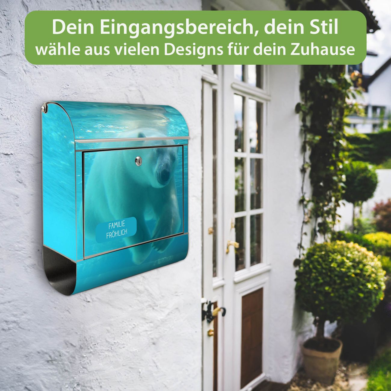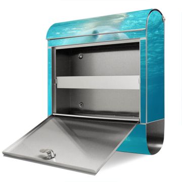 FUNKTION: Der banjado Edelstahl Briefkasten mit Motiv Motiv Eisbär unter Wasser bietet Ihnen mit seinem Fassungsvermögen genügend Platz auch für große A4 Sendungen. Das integrierte Zeitungsfach eignet sich hervorragend um unkompliziert die Tageszeitung zu fassen. Auf Wunsch können Sie bei uns den passenden Ständer kaufen und so aus dem Wandbriefkasten einen Standbriefkasten machen. DESIGN: Der Motivbriefkasten hat ein sehr ansprechendes und ausgefallenes Design, damit entlocken Sie Ihren Nachbarn und dem Postboten ein Lächeln. Heben Sie Sich ab von der tristen grauen Masse ohne auf Funktionalität zu verzichten. DETAILS: Der Design Briefkasten mit Motiv Motiv Eisbär unter Wasser besteht aus hochwertigem 18/0 Edelstahl. Das Motiv besteht aus einer wetter- und UV-resistenten Folie, die mit einem Schutzlaminat überzogen ist. Der Briefkasten wird mit Montagematerial und zwei Schlüsseln geliefert. NUTZEN: Sie können diesen Briefkasten sowohl als Wandbriefkasten montieren oder einen passenden Ständer auswählen und als Standbriefkasten einbetonieren. Die Größe bietet genügend Platz für Sendungen aller Art, das hochwertige Edelstahl ist rostfrei und die Motivfolie absolut wetterfest. SCHUTZ: Um Ihre Post optimal vor Witterungseinflüssen wie Starkregen zu schützen, empfehlen wir, den Briefkasten geschützt anzubringen. BANJADO: Ihr Briefkasten wird in Sachsen in einer kleinen Manufaktur von Hand veredelt. Die Motivfolie ist lösungsmittelfrei und schutzlaminiert, dies sorgt für einen langen Halt. Wir legen großen Wert auf die Verbindung von Funktionalität und Design. Sie erhalten Handarbeit aus Sachsen.