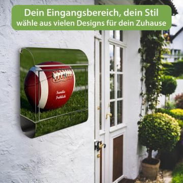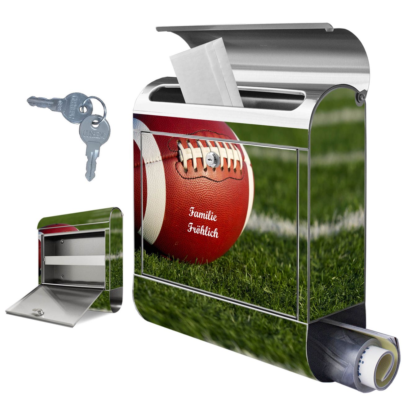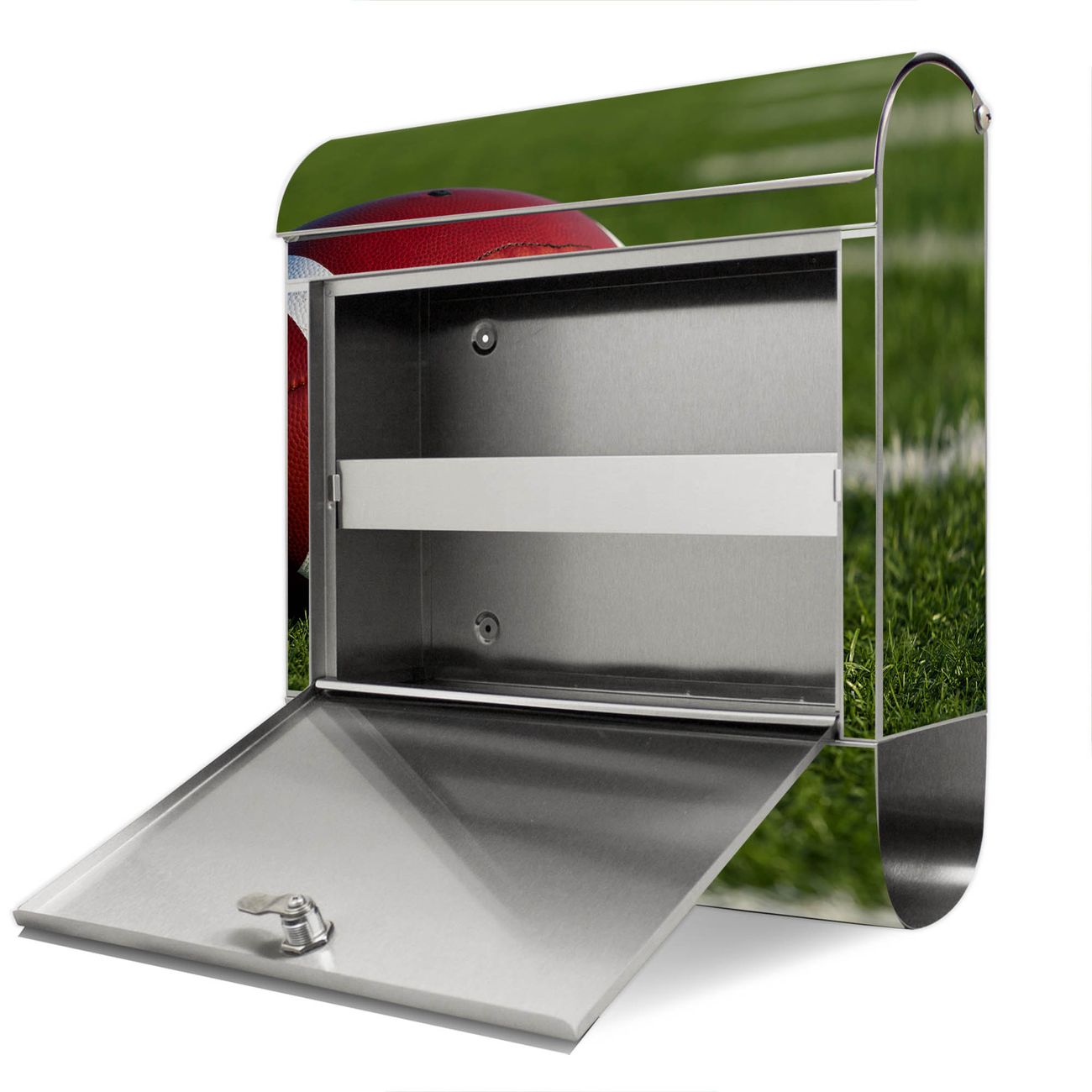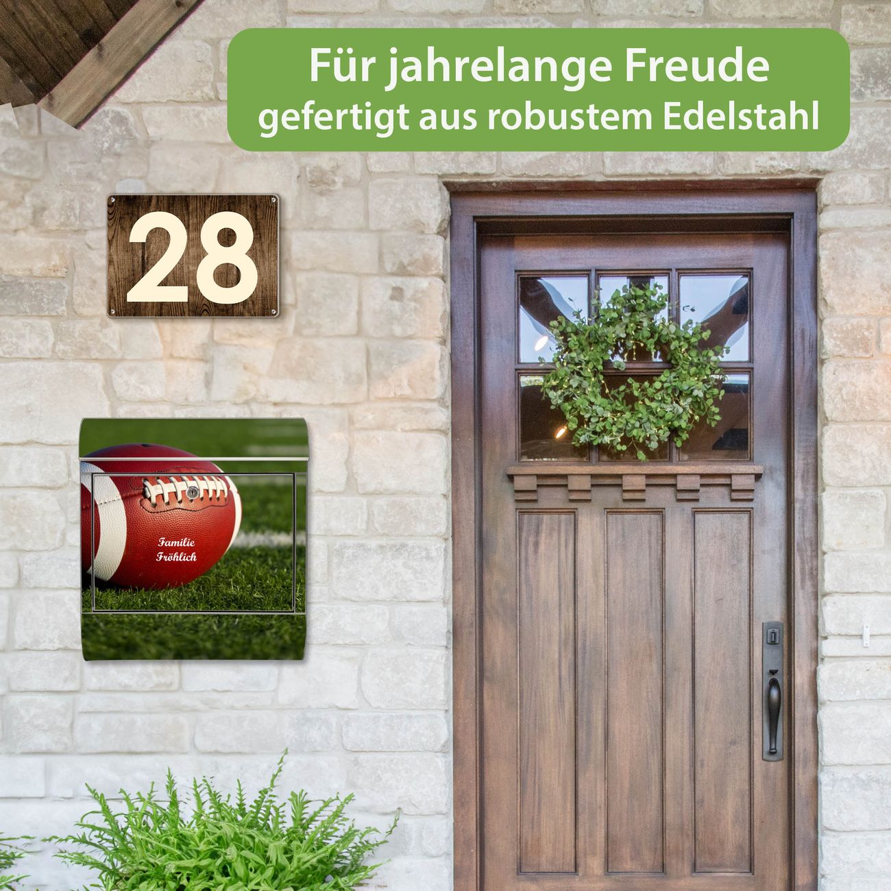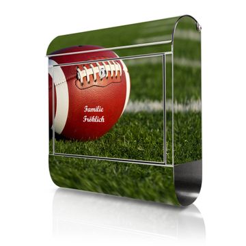 FUNKTION: Der banjado Edelstahl Briefkasten mit Motiv Motiv Football bietet Ihnen mit seinem Fassungsvermögen genügend Platz auch für große A4 Sendungen. Das integrierte Zeitungsfach eignet sich hervorragend um unkompliziert die Tageszeitung zu fassen. Auf Wunsch können Sie bei uns den passenden Ständer kaufen und so aus dem Wandbriefkasten einen Standbriefkasten machen. DESIGN: Der Motivbriefkasten hat ein sehr ansprechendes und ausgefallenes Design, damit entlocken Sie Ihren Nachbarn und dem Postboten ein Lächeln. Heben Sie Sich ab von der tristen grauen Masse ohne auf Funktionalität zu verzichten. DETAILS: Der Design Briefkasten mit Motiv Motiv Football besteht aus hochwertigem 18/0 Edelstahl. Das Motiv besteht aus einer wetter- und UV-resistenten Folie, die mit einem Schutzlaminat überzogen ist. Der Briefkasten wird mit Montagematerial und zwei Schlüsseln geliefert. NUTZEN: Sie können diesen Briefkasten sowohl als Wandbriefkasten montieren oder einen passenden Ständer auswählen und als Standbriefkasten einbetonieren. Die Größe bietet genügend Platz für Sendungen aller Art, das hochwertige Edelstahl ist rostfrei und die Motivfolie absolut wetterfest. SCHUTZ: Um Ihre Post optimal vor Witterungseinflüssen wie Starkregen zu schützen, empfehlen wir, den Briefkasten geschützt anzubringen. BANJADO: Ihr Briefkasten wird in Sachsen in einer kleinen Manufaktur von Hand veredelt. Die Motivfolie ist lösungsmittelfrei und schutzlaminiert, dies sorgt für einen langen Halt. Wir legen großen Wert auf die Verbindung von Funktionalität und Design. Sie erhalten Handarbeit aus Sachsen.