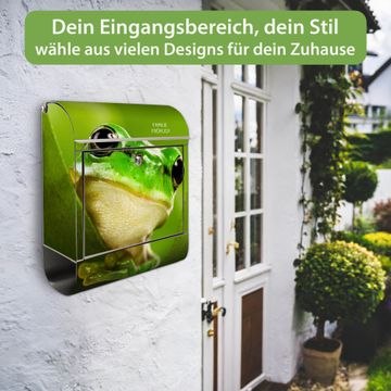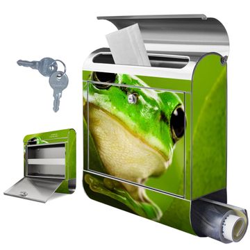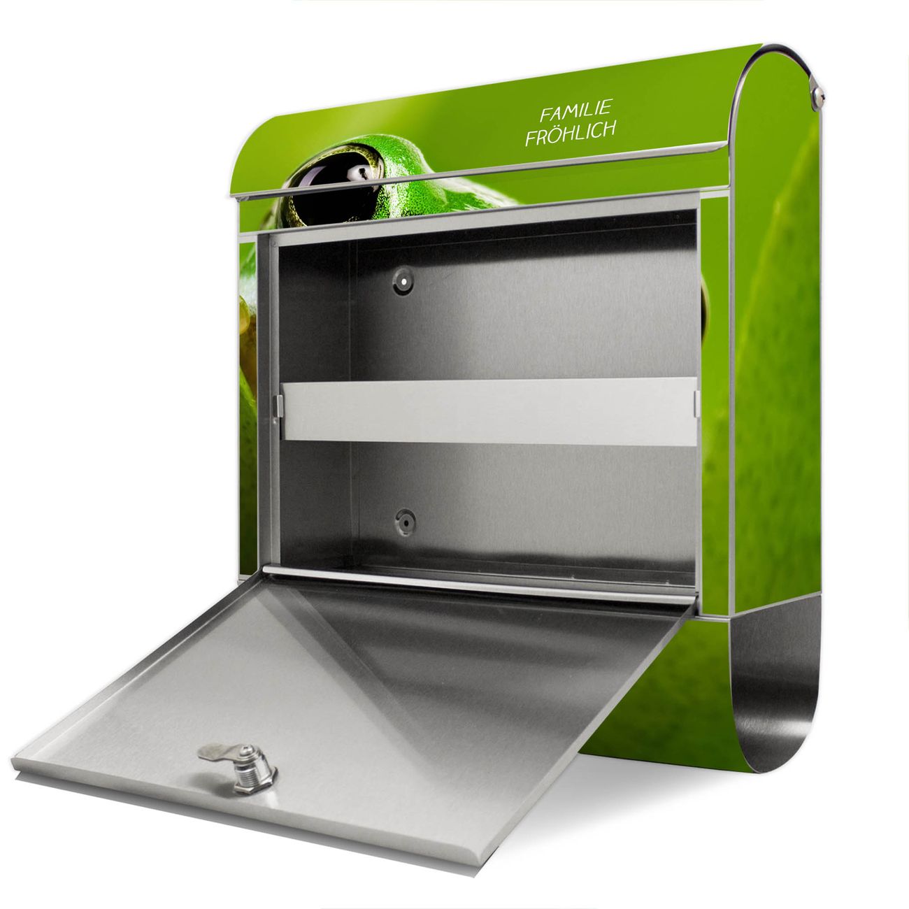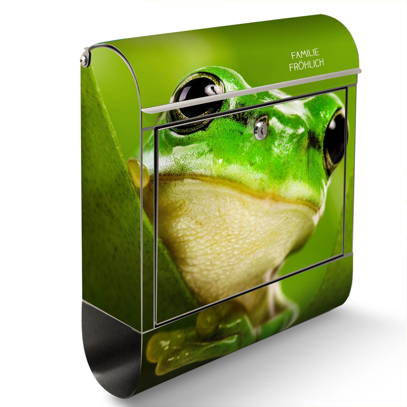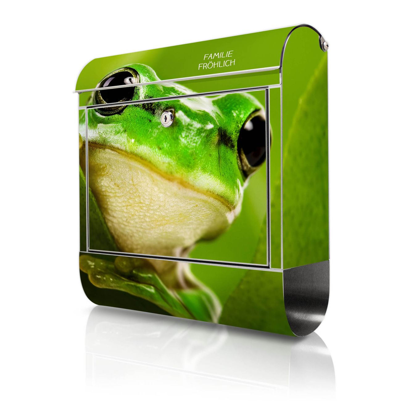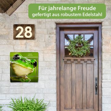 FUNKTION: Der banjado Edelstahl Briefkasten mit Motiv Motiv Frosch bietet Ihnen mit seinem Fassungsvermögen genügend Platz auch für große A4 Sendungen. Das integrierte Zeitungsfach eignet sich hervorragend um unkompliziert die Tageszeitung zu fassen. Auf Wunsch können Sie bei uns den passenden Ständer kaufen und so aus dem Wandbriefkasten einen Standbriefkasten machen. DESIGN: Der Motivbriefkasten hat ein sehr ansprechendes und ausgefallenes Design, damit entlocken Sie Ihren Nachbarn und dem Postboten ein Lächeln. Heben Sie Sich ab von der tristen grauen Masse ohne auf Funktionalität zu verzichten. DETAILS: Der Design Briefkasten mit Motiv Motiv Frosch besteht aus hochwertigem 18/0 Edelstahl. Das Motiv besteht aus einer wetter- und UV-resistenten Folie, die mit einem Schutzlaminat überzogen ist. Der Briefkasten wird mit Montagematerial und zwei Schlüsseln geliefert. NUTZEN: Sie können diesen Briefkasten sowohl als Wandbriefkasten montieren oder einen passenden Ständer auswählen und als Standbriefkasten einbetonieren. Die Größe bietet genügend Platz für Sendungen aller Art, das hochwertige Edelstahl ist rostfrei und die Motivfolie absolut wetterfest. SCHUTZ: Um Ihre Post optimal vor Witterungseinflüssen wie Starkregen zu schützen, empfehlen wir, den Briefkasten geschützt anzubringen. BANJADO: Ihr Briefkasten wird in Sachsen in einer kleinen Manufaktur von Hand veredelt. Die Motivfolie ist lösungsmittelfrei und schutzlaminiert, dies sorgt für einen langen Halt. Wir legen großen Wert auf die Verbindung von Funktionalität und Design. Sie erhalten Handarbeit aus Sachsen.