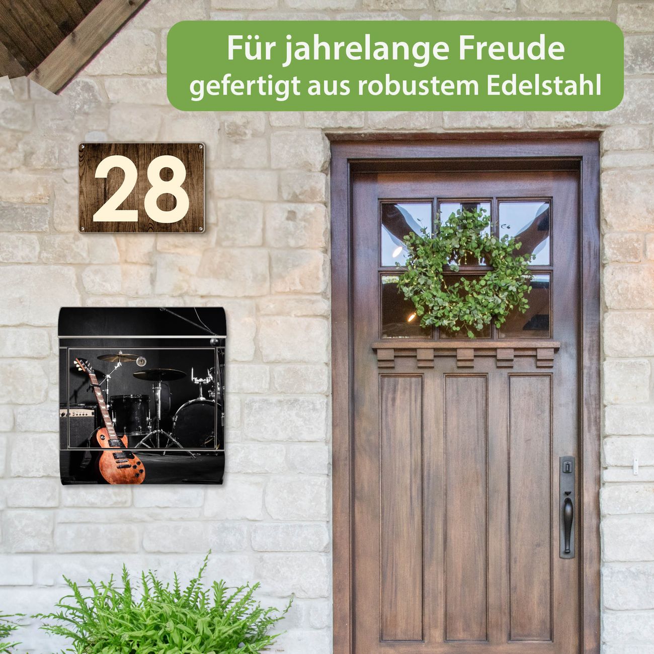FUNKTION: Der banjado Edelstahl Briefkasten mit Motiv Motiv Jam Session bietet Ihnen mit seinem Fassungsvermögen genügend Platz auch für große A4 Sendungen. Das integrierte Zeitungsfach eignet sich hervorragend um unkompliziert die Tageszeitung zu fassen. Auf Wunsch können Sie bei uns den passenden Ständer kaufen und so aus dem Wandbriefkasten einen Standbriefkasten machen. DESIGN: Der Motivbriefkasten hat ein sehr ansprechendes und ausgefallenes Design, damit entlocken Sie Ihren Nachbarn und dem Postboten ein Lächeln. Heben Sie Sich ab von der tristen grauen Masse ohne auf Funktionalität zu verzichten. DETAILS: Der Design Briefkasten mit Motiv Motiv Jam Session besteht aus hochwertigem 18/0 Edelstahl. Das Motiv besteht aus einer wetter- und UV-resistenten Folie, die mit einem Schutzlaminat überzogen ist. Der Briefkasten wird mit Montagematerial und zwei Schlüsseln geliefert. NUTZEN: Sie können diesen Briefkasten sowohl als Wandbriefkasten montieren oder einen passenden Ständer auswählen und als Standbriefkasten einbetonieren. Die Größe bietet genügend Platz für Sendungen aller Art, das hochwertige Edelstahl ist rostfrei und die Motivfolie absolut wetterfest. SCHUTZ: Um Ihre Post optimal vor Witterungseinflüssen wie Starkregen zu schützen, empfehlen wir, den Briefkasten geschützt anzubringen. BANJADO: Ihr Briefkasten wird in Sachsen in einer kleinen Manufaktur von Hand veredelt. Die Motivfolie ist lösungsmittelfrei und schutzlaminiert, dies sorgt für einen langen Halt. Wir legen großen Wert auf die Verbindung von Funktionalität und Design. Sie erhalten Handarbeit aus Sachsen.