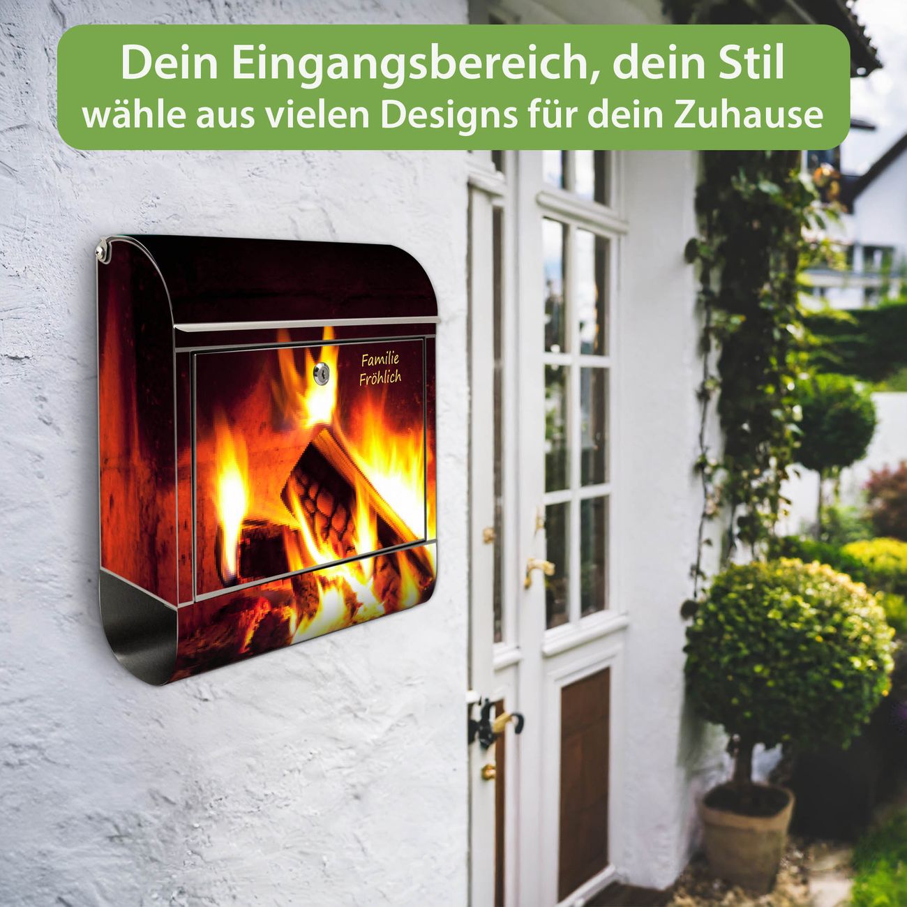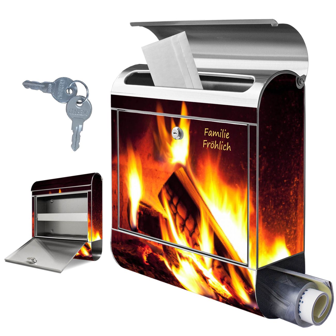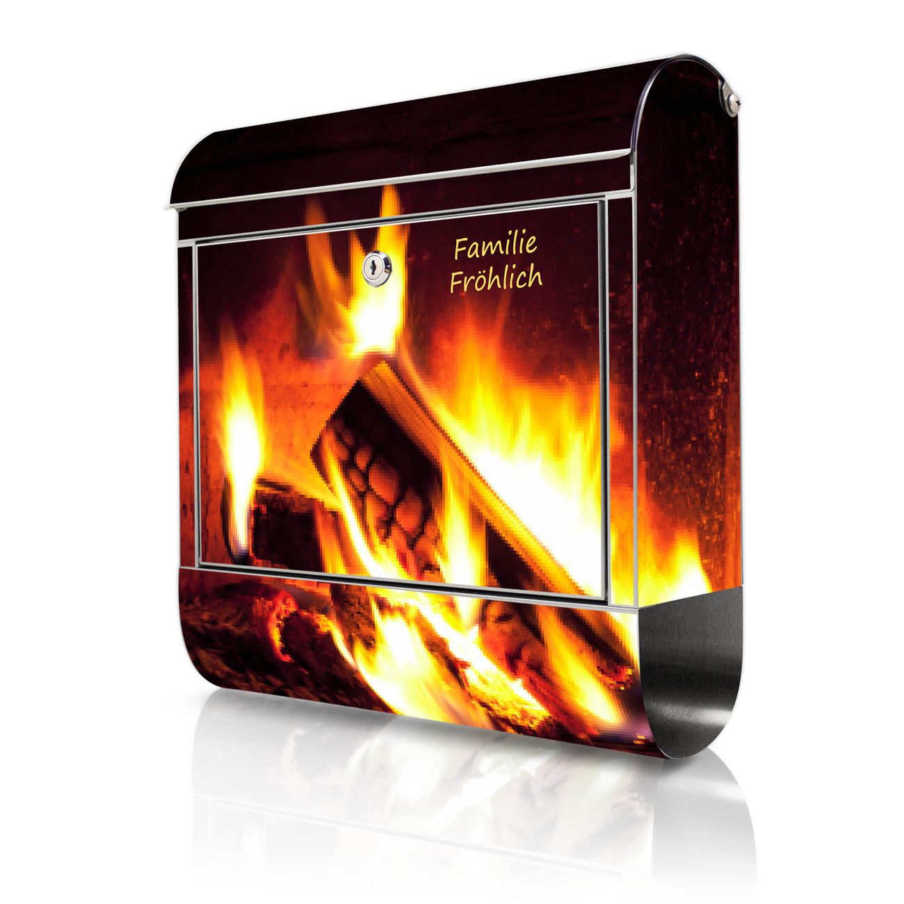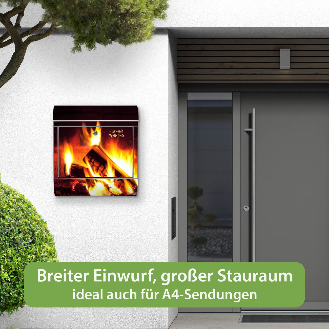 Wandbriefkasten Edelstahl Motiv Kaminfeuer