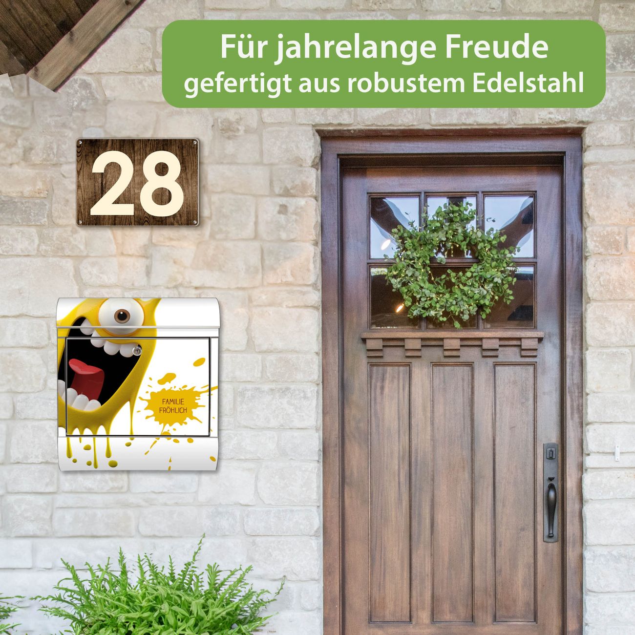 Der Vorschau-Text Familie Fröhlich wird durch Ihren persönlichen Wunschtext ersetzt. Die Schriftart und Farbe bleiben gleich wie in der Vorschau.