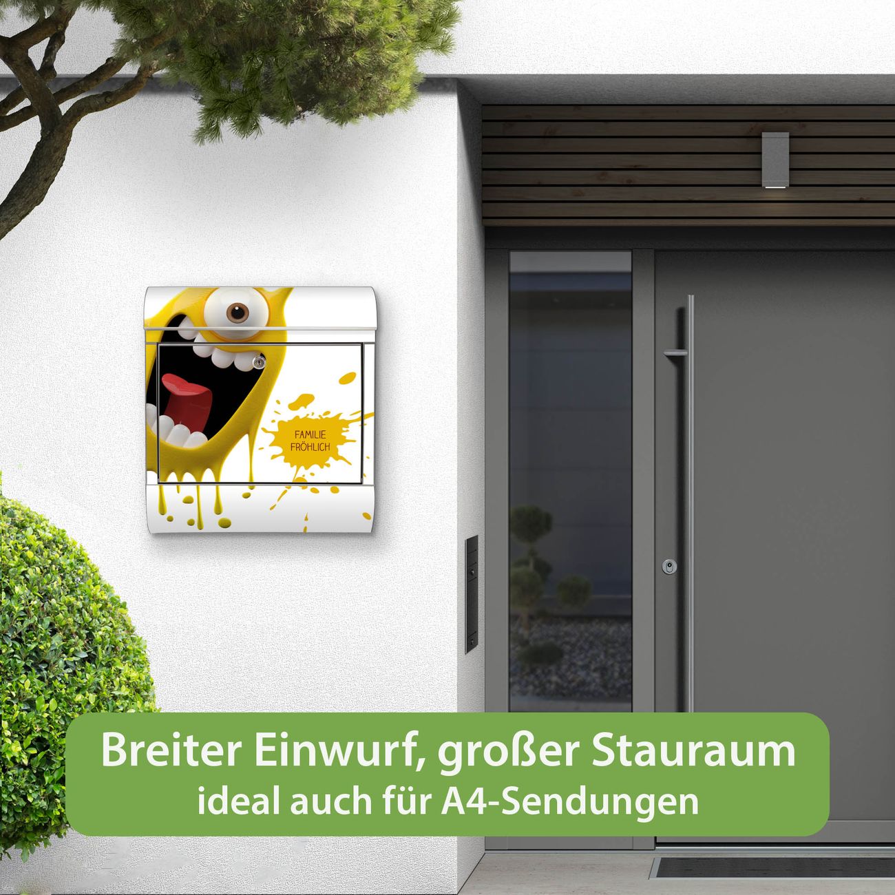 FUNKTION: Der banjado Edelstahl Briefkasten mit Motiv Motiv Karl Splash bietet Ihnen mit seinem Fassungsvermögen genügend Platz auch für große A4 Sendungen. Das integrierte Zeitungsfach eignet sich hervorragend um unkompliziert die Tageszeitung zu fassen. Auf Wunsch können Sie bei uns den passenden Ständer kaufen und so aus dem Wandbriefkasten einen Standbriefkasten machen. DESIGN: Der Motivbriefkasten hat ein sehr ansprechendes und ausgefallenes Design, damit entlocken Sie Ihren Nachbarn und dem Postboten ein Lächeln. Heben Sie Sich ab von der tristen grauen Masse ohne auf Funktionalität zu verzichten. DETAILS: Der Design Briefkasten mit Motiv Motiv Karl Splash besteht aus hochwertigem 18/0 Edelstahl. Das Motiv besteht aus einer wetter- und UV-resistenten Folie, die mit einem Schutzlaminat überzogen ist. Der Briefkasten wird mit Montagematerial und zwei Schlüsseln geliefert. NUTZEN: Sie können diesen Briefkasten sowohl als Wandbriefkasten montieren oder einen passenden Ständer auswählen und als Standbriefkasten einbetonieren. Die Größe bietet genügend Platz für Sendungen aller Art, das hochwertige Edelstahl ist rostfrei und die Motivfolie absolut wetterfest. SCHUTZ: Um Ihre Post optimal vor Witterungseinflüssen wie Starkregen zu schützen, empfehlen wir, den Briefkasten geschützt anzubringen. BANJADO: Ihr Briefkasten wird in Sachsen in einer kleinen Manufaktur von Hand veredelt. Die Motivfolie ist lösungsmittelfrei und schutzlaminiert, dies sorgt für einen langen Halt. Wir legen großen Wert auf die Verbindung von Funktionalität und Design. Sie erhalten Handarbeit aus Sachsen.