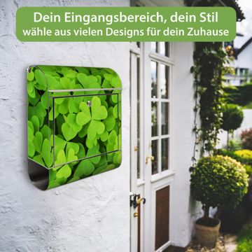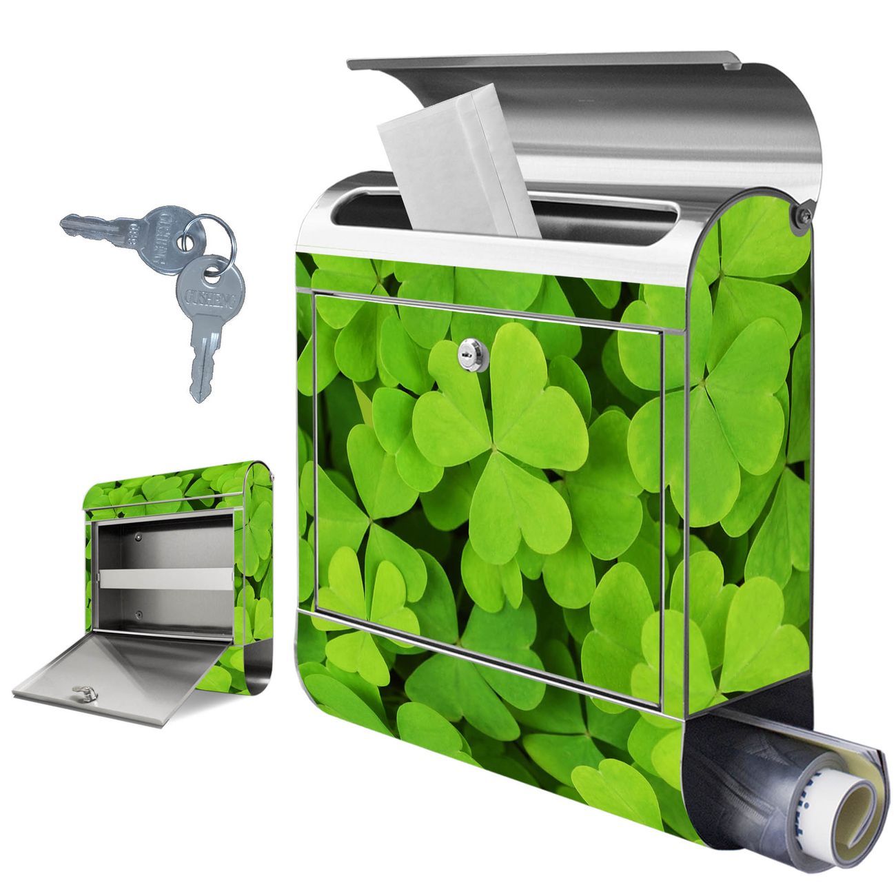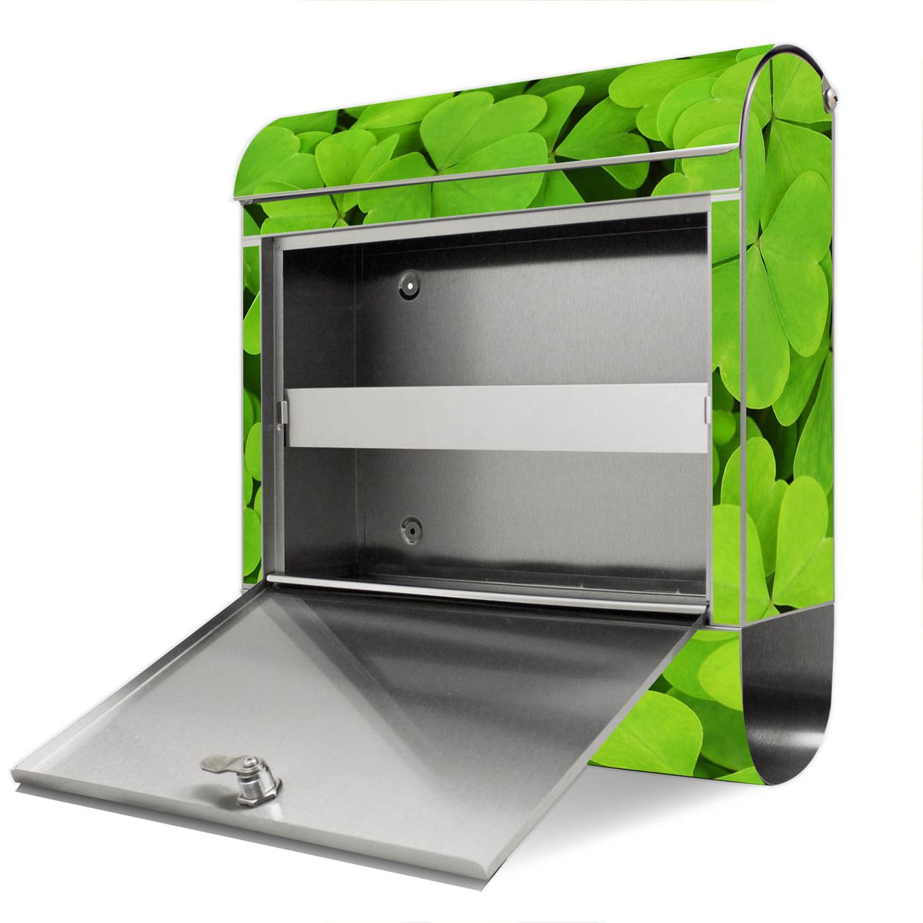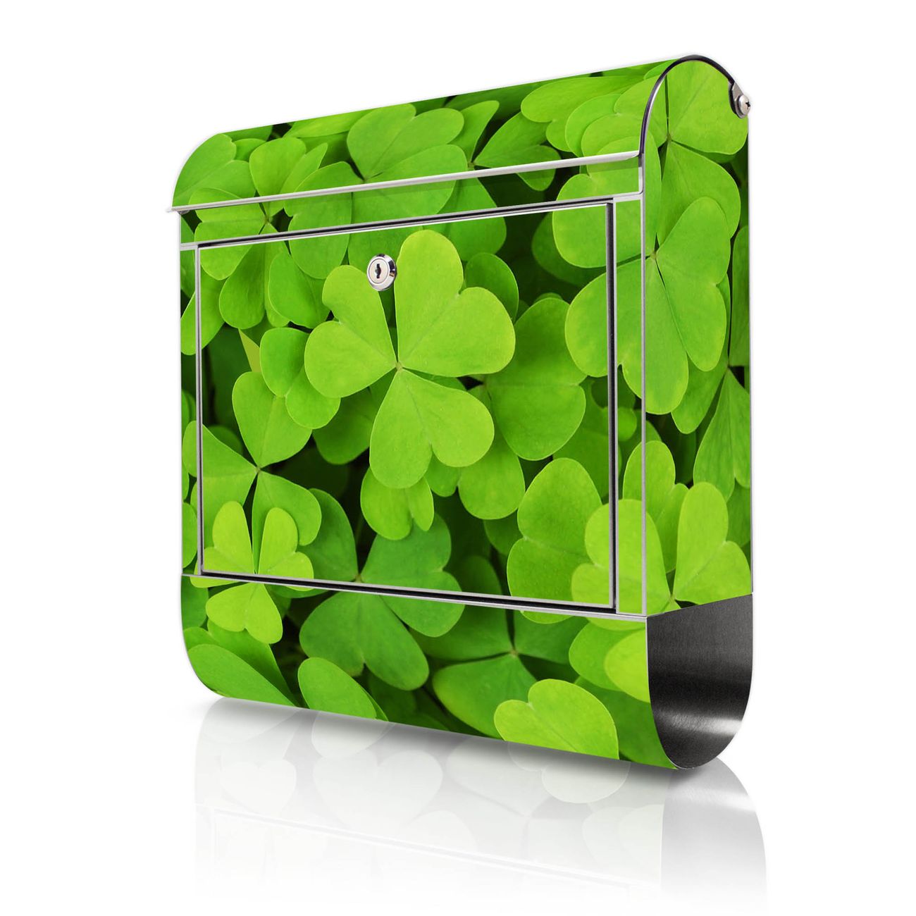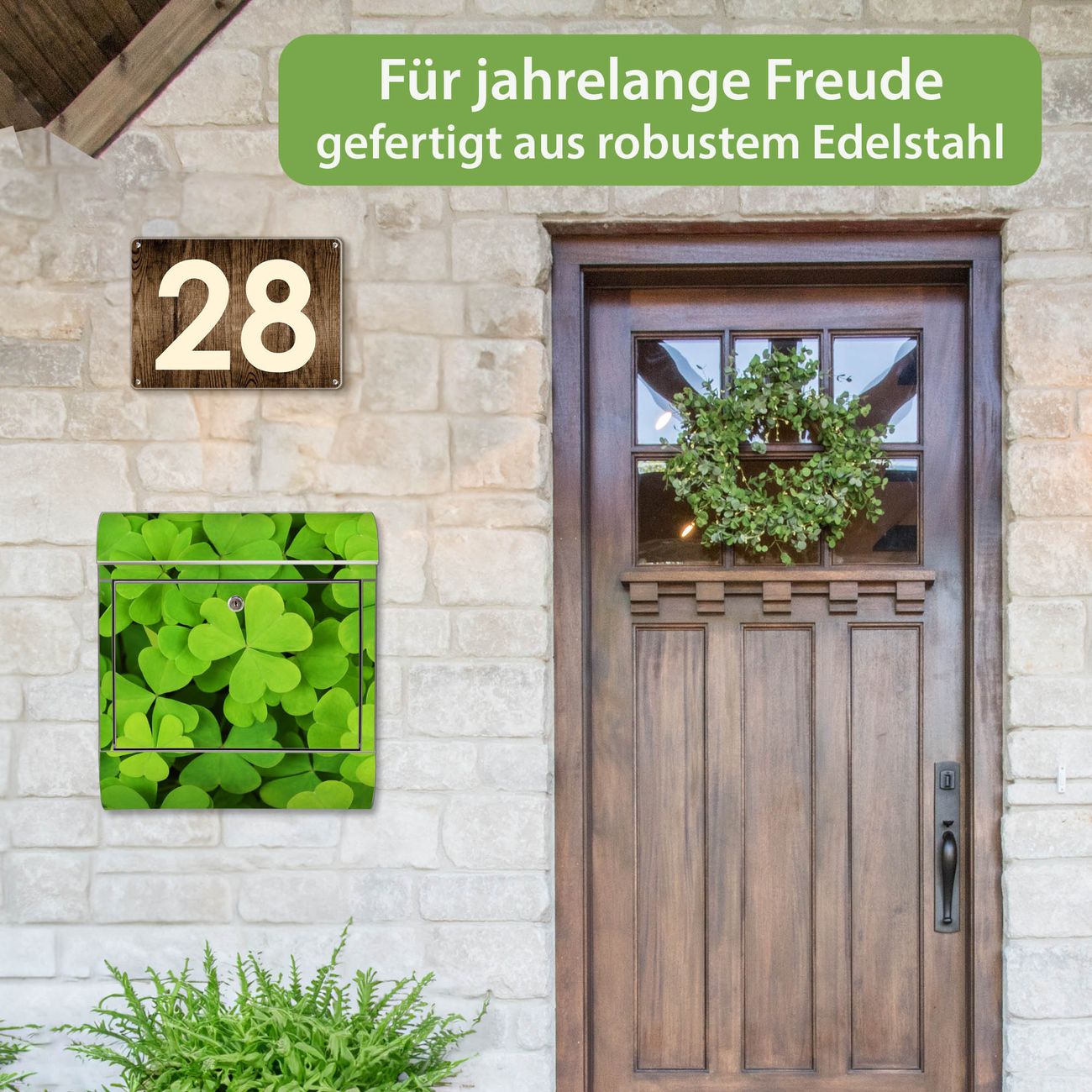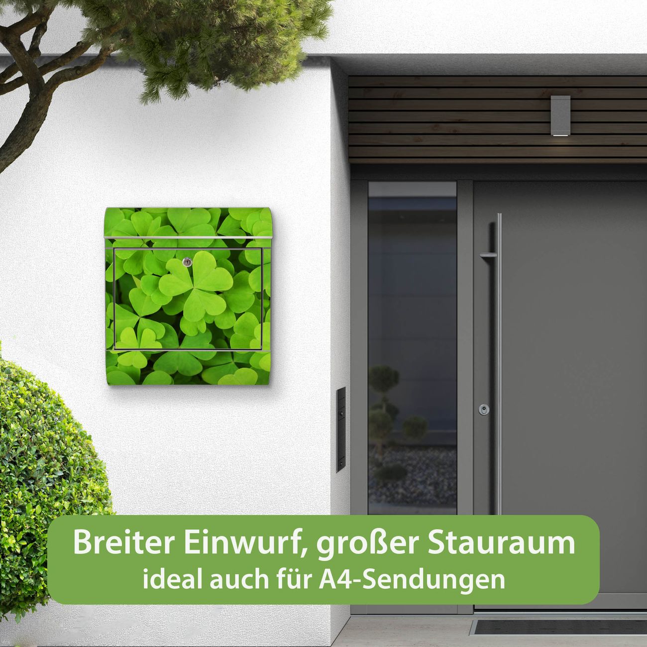 FUNKTION: Der banjado Edelstahl Briefkasten mit Motiv Motiv Klee bietet Ihnen mit seinem Fassungsvermögen genügend Platz auch für große A4 Sendungen. Das integrierte Zeitungsfach eignet sich hervorragend um unkompliziert die Tageszeitung zu fassen. Auf Wunsch können Sie bei uns den passenden Ständer kaufen und so aus dem Wandbriefkasten einen Standbriefkasten machen. DESIGN: Der Motivbriefkasten hat ein sehr ansprechendes und ausgefallenes Design, damit entlocken Sie Ihren Nachbarn und dem Postboten ein Lächeln. Heben Sie Sich ab von der tristen grauen Masse ohne auf Funktionalität zu verzichten. DETAILS: Der Design Briefkasten mit Motiv Motiv Klee besteht aus hochwertigem 18/0 Edelstahl. Das Motiv besteht aus einer wetter- und UV-resistenten Folie, die mit einem Schutzlaminat überzogen ist. Der Briefkasten wird mit Montagematerial und zwei Schlüsseln geliefert. NUTZEN: Sie können diesen Briefkasten sowohl als Wandbriefkasten montieren oder einen passenden Ständer auswählen und als Standbriefkasten einbetonieren. Die Größe bietet genügend Platz für Sendungen aller Art, das hochwertige Edelstahl ist rostfrei und die Motivfolie absolut wetterfest. SCHUTZ: Um Ihre Post optimal vor Witterungseinflüssen wie Starkregen zu schützen, empfehlen wir, den Briefkasten geschützt anzubringen. BANJADO: Ihr Briefkasten wird in Sachsen in einer kleinen Manufaktur von Hand veredelt. Die Motivfolie ist lösungsmittelfrei und schutzlaminiert, dies sorgt für einen langen Halt. Wir legen großen Wert auf die Verbindung von Funktionalität und Design. Sie erhalten Handarbeit aus Sachsen.