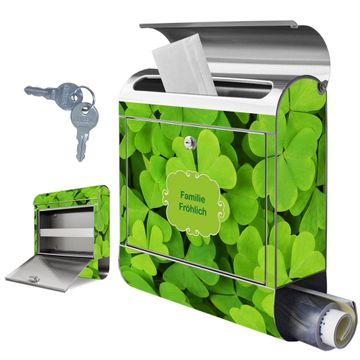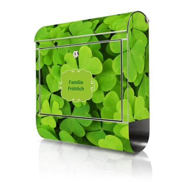 FUNKTION: Der banjado Edelstahl Briefkasten mit Motiv Motiv Klee bietet Ihnen mit seinem Fassungsvermögen genügend Platz auch für große A4 Sendungen. Das integrierte Zeitungsfach eignet sich hervorragend um unkompliziert die Tageszeitung zu fassen. Auf Wunsch können Sie bei uns den passenden Ständer kaufen und so aus dem Wandbriefkasten einen Standbriefkasten machen. DESIGN: Der Motivbriefkasten hat ein sehr ansprechendes und ausgefallenes Design, damit entlocken Sie Ihren Nachbarn und dem Postboten ein Lächeln. Heben Sie Sich ab von der tristen grauen Masse ohne auf Funktionalität zu verzichten. DETAILS: Der Design Briefkasten mit Motiv Motiv Klee besteht aus hochwertigem 18/0 Edelstahl. Das Motiv besteht aus einer wetter- und UV-resistenten Folie, die mit einem Schutzlaminat überzogen ist. Der Briefkasten wird mit Montagematerial und zwei Schlüsseln geliefert. NUTZEN: Sie können diesen Briefkasten sowohl als Wandbriefkasten montieren oder einen passenden Ständer auswählen und als Standbriefkasten einbetonieren. Die Größe bietet genügend Platz für Sendungen aller Art, das hochwertige Edelstahl ist rostfrei und die Motivfolie absolut wetterfest. SCHUTZ: Um Ihre Post optimal vor Witterungseinflüssen wie Starkregen zu schützen, empfehlen wir, den Briefkasten geschützt anzubringen. BANJADO: Ihr Briefkasten wird in Sachsen in einer kleinen Manufaktur von Hand veredelt. Die Motivfolie ist lösungsmittelfrei und schutzlaminiert, dies sorgt für einen langen Halt. Wir legen großen Wert auf die Verbindung von Funktionalität und Design. Sie erhalten Handarbeit aus Sachsen.