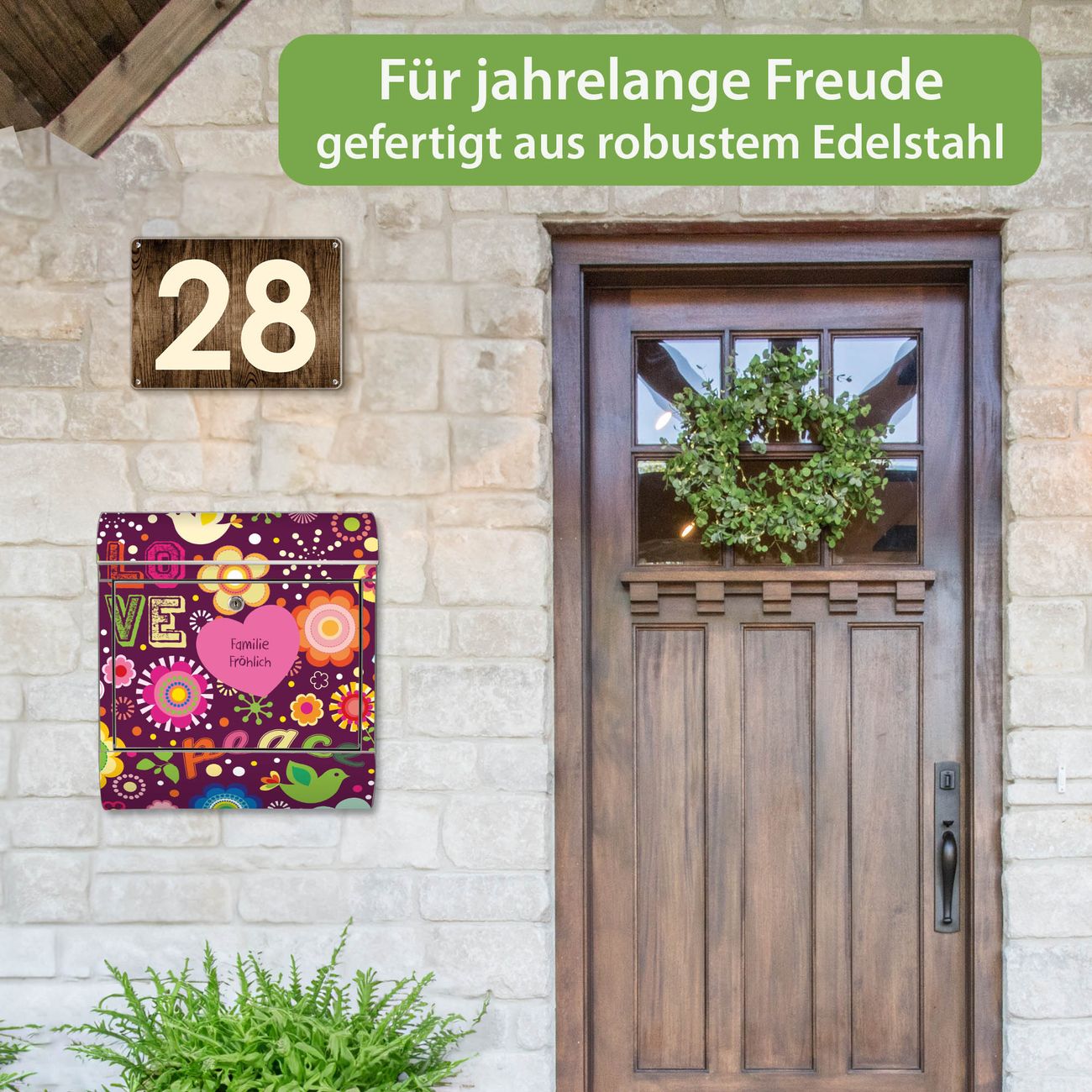 Der Vorschau-Text Familie Fröhlich wird durch Ihren persönlichen Wunschtext ersetzt. Die Schriftart und Farbe bleiben gleich wie in der Vorschau.