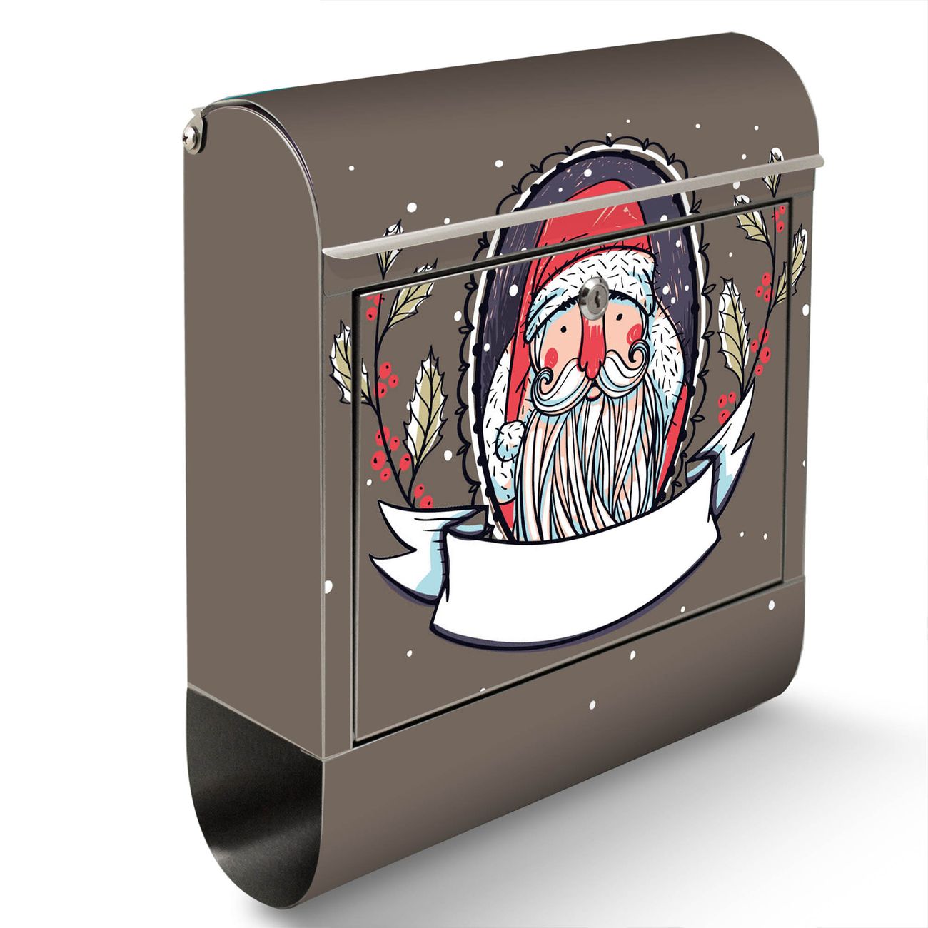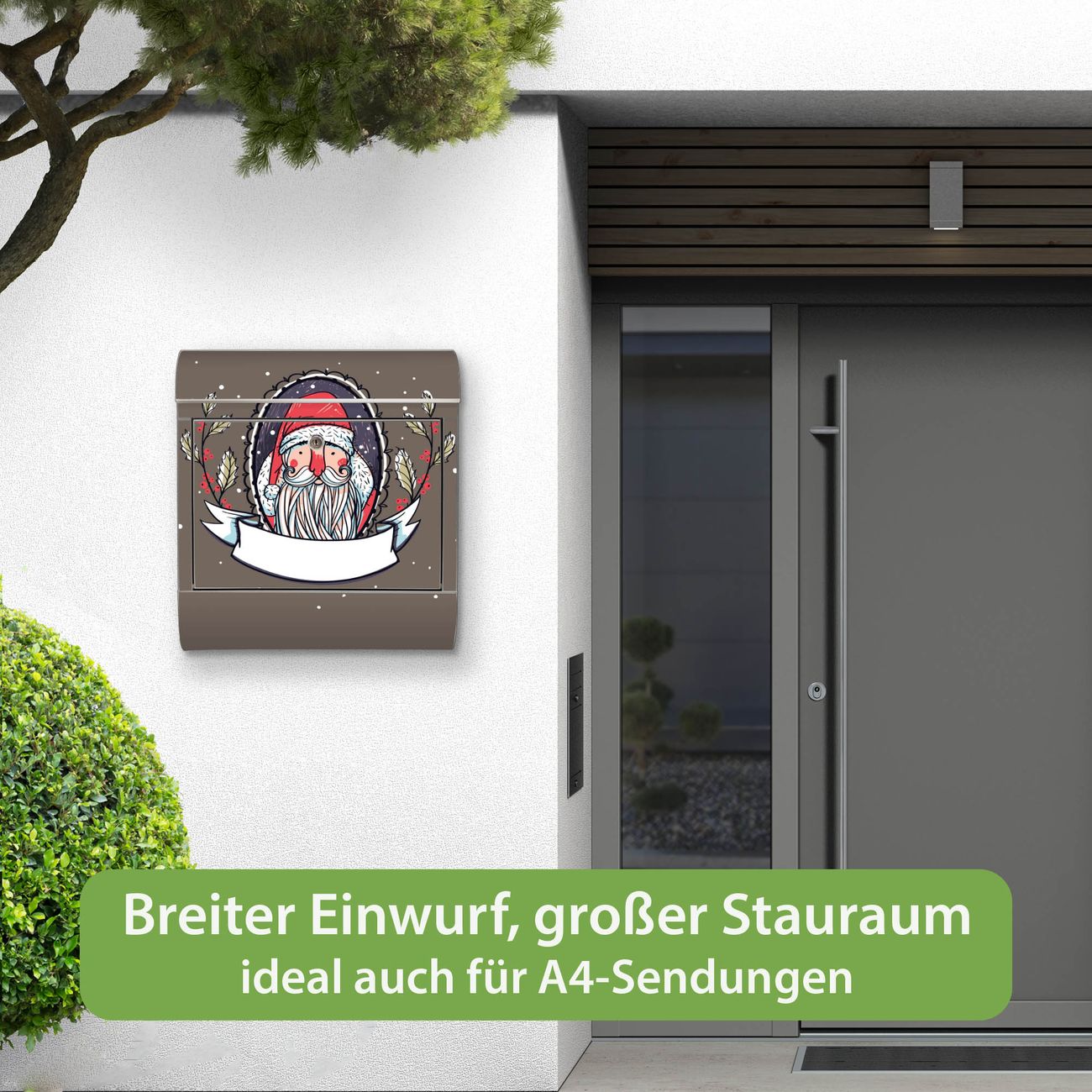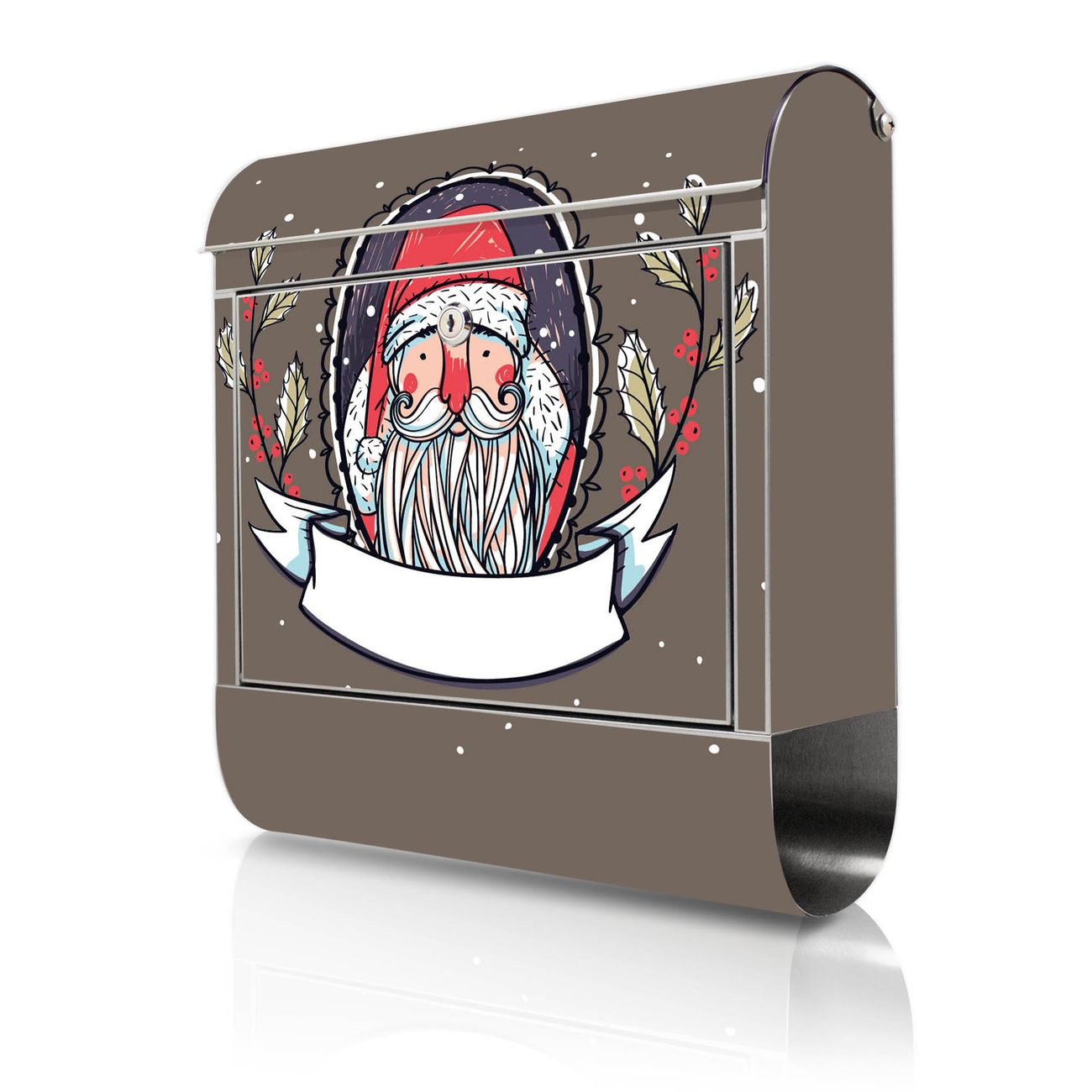 FUNKTION: Der banjado Edelstahl Briefkasten mit Motiv Motiv Merry XMAS bietet Ihnen mit seinem Fassungsvermögen genügend Platz auch für große A4 Sendungen. Das integrierte Zeitungsfach eignet sich hervorragend um unkompliziert die Tageszeitung zu fassen. Auf Wunsch können Sie bei uns den passenden Ständer kaufen und so aus dem Wandbriefkasten einen Standbriefkasten machen. DESIGN: Der Motivbriefkasten hat ein sehr ansprechendes und ausgefallenes Design, damit entlocken Sie Ihren Nachbarn und dem Postboten ein Lächeln. Heben Sie Sich ab von der tristen grauen Masse ohne auf Funktionalität zu verzichten. DETAILS: Der Design Briefkasten mit Motiv Motiv Merry XMAS besteht aus hochwertigem 18/0 Edelstahl. Das Motiv besteht aus einer wetter- und UV-resistenten Folie, die mit einem Schutzlaminat überzogen ist. Der Briefkasten wird mit Montagematerial und zwei Schlüsseln geliefert. NUTZEN: Sie können diesen Briefkasten sowohl als Wandbriefkasten montieren oder einen passenden Ständer auswählen und als Standbriefkasten einbetonieren. Die Größe bietet genügend Platz für Sendungen aller Art, das hochwertige Edelstahl ist rostfrei und die Motivfolie absolut wetterfest. SCHUTZ: Um Ihre Post optimal vor Witterungseinflüssen wie Starkregen zu schützen, empfehlen wir, den Briefkasten geschützt anzubringen. BANJADO: Ihr Briefkasten wird in Sachsen in einer kleinen Manufaktur von Hand veredelt. Die Motivfolie ist lösungsmittelfrei und schutzlaminiert, dies sorgt für einen langen Halt. Wir legen großen Wert auf die Verbindung von Funktionalität und Design. Sie erhalten Handarbeit aus Sachsen.