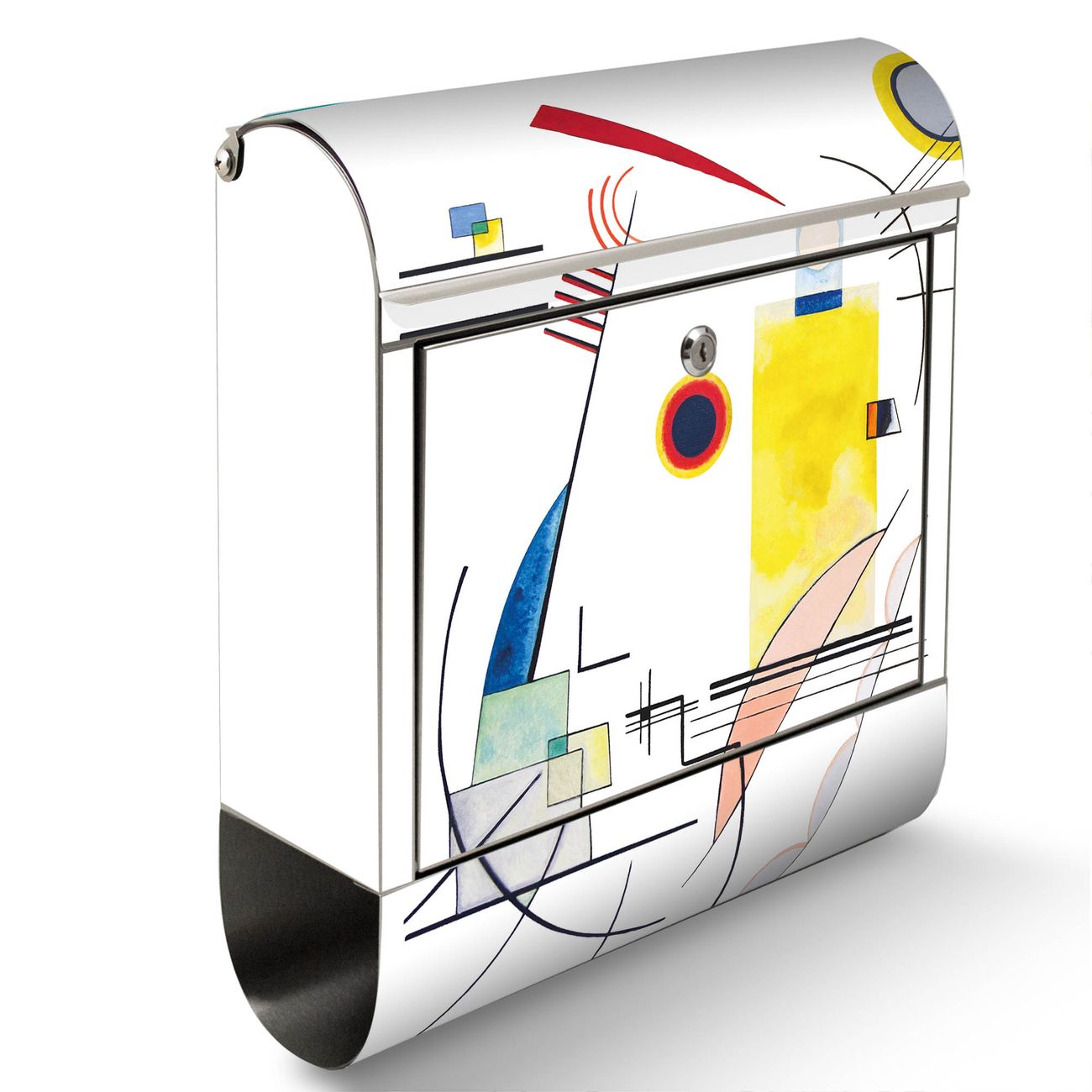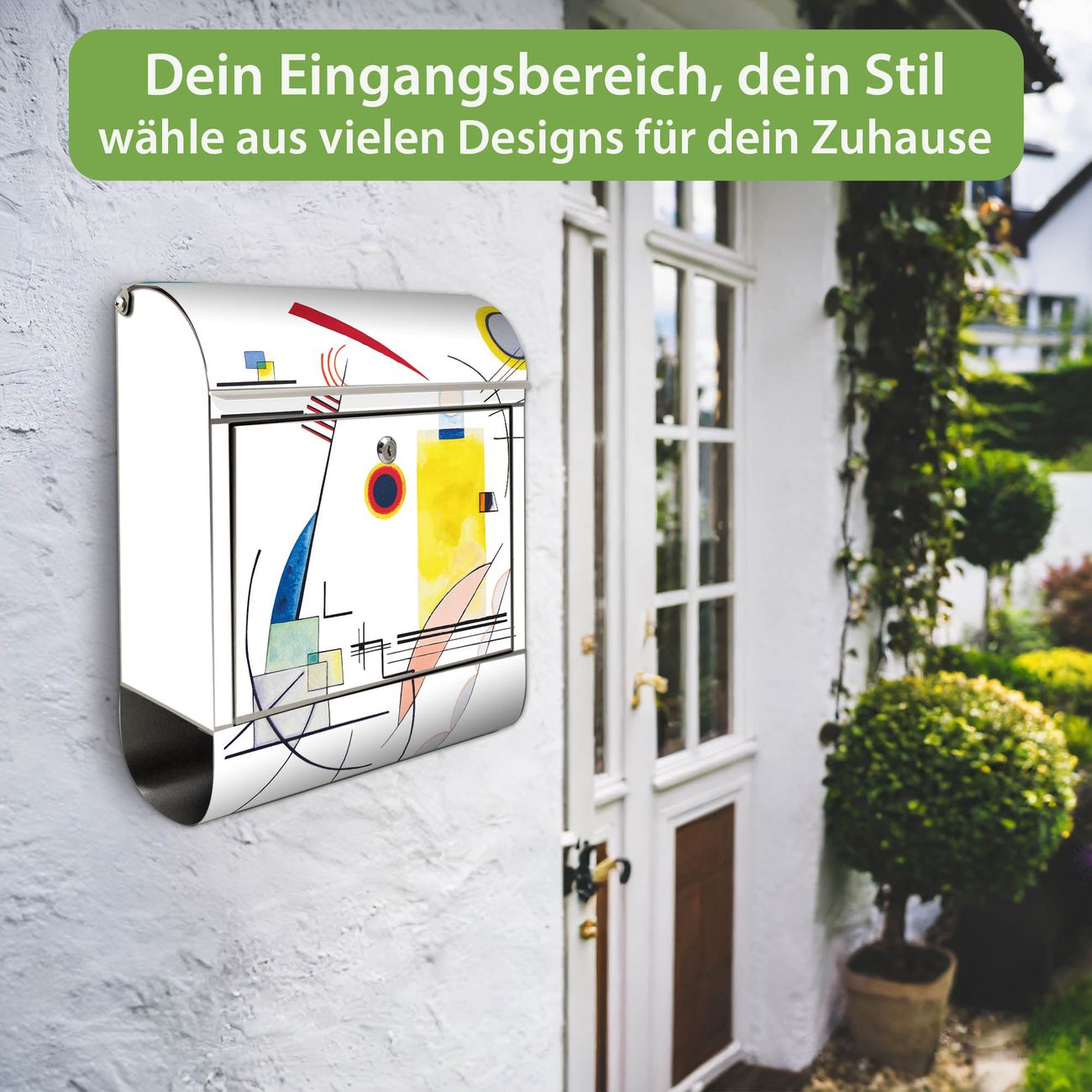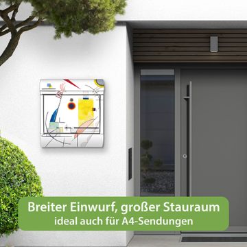 FUNKTION: Der banjado Edelstahl Briefkasten mit Motiv Motiv Abstrakte Komposition bietet Ihnen mit seinem Fassungsvermögen genügend Platz auch für große A4 Sendungen. Das integrierte Zeitungsfach eignet sich hervorragend um unkompliziert die Tageszeitung zu fassen. Auf Wunsch können Sie bei uns den passenden Ständer kaufen und so aus dem Wandbriefkasten einen Standbriefkasten machen. DESIGN: Der Motivbriefkasten hat ein sehr ansprechendes und ausgefallenes Design, damit entlocken Sie Ihren Nachbarn und dem Postboten ein Lächeln. Heben Sie Sich ab von der tristen grauen Masse ohne auf Funktionalität zu verzichten. DETAILS: Der Design Briefkasten mit Motiv Motiv Abstrakte Komposition besteht aus hochwertigem 18/0 Edelstahl. Das Motiv besteht aus einer wetter- und UV-resistenten Folie, die mit einem Schutzlaminat überzogen ist. Der Briefkasten wird mit Montagematerial und zwei Schlüsseln geliefert. NUTZEN: Sie können diesen Briefkasten sowohl als Wandbriefkasten montieren oder einen passenden Ständer auswählen und als Standbriefkasten einbetonieren. Die Größe bietet genügend Platz für Sendungen aller Art, das hochwertige Edelstahl ist rostfrei und die Motivfolie absolut wetterfest. SCHUTZ: Um Ihre Post optimal vor Witterungseinflüssen wie Starkregen zu schützen, empfehlen wir, den Briefkasten geschützt anzubringen. BANJADO: Ihr Briefkasten wird in Sachsen in einer kleinen Manufaktur von Hand veredelt. Die Motivfolie ist lösungsmittelfrei und schutzlaminiert, dies sorgt für einen langen Halt. Wir legen großen Wert auf die Verbindung von Funktionalität und Design. Sie erhalten Handarbeit aus Sachsen.