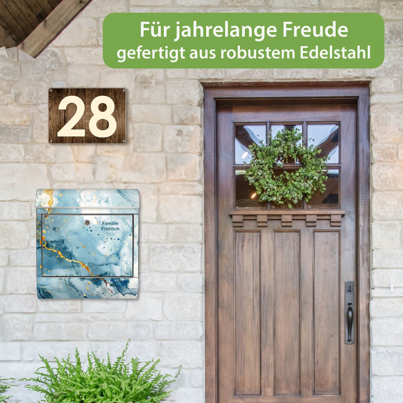 Der Vorschau-Text Familie Fröhlich wird durch Ihren persönlichen Wunschtext ersetzt. Die Schriftart und Farbe bleiben gleich wie in der Vorschau.