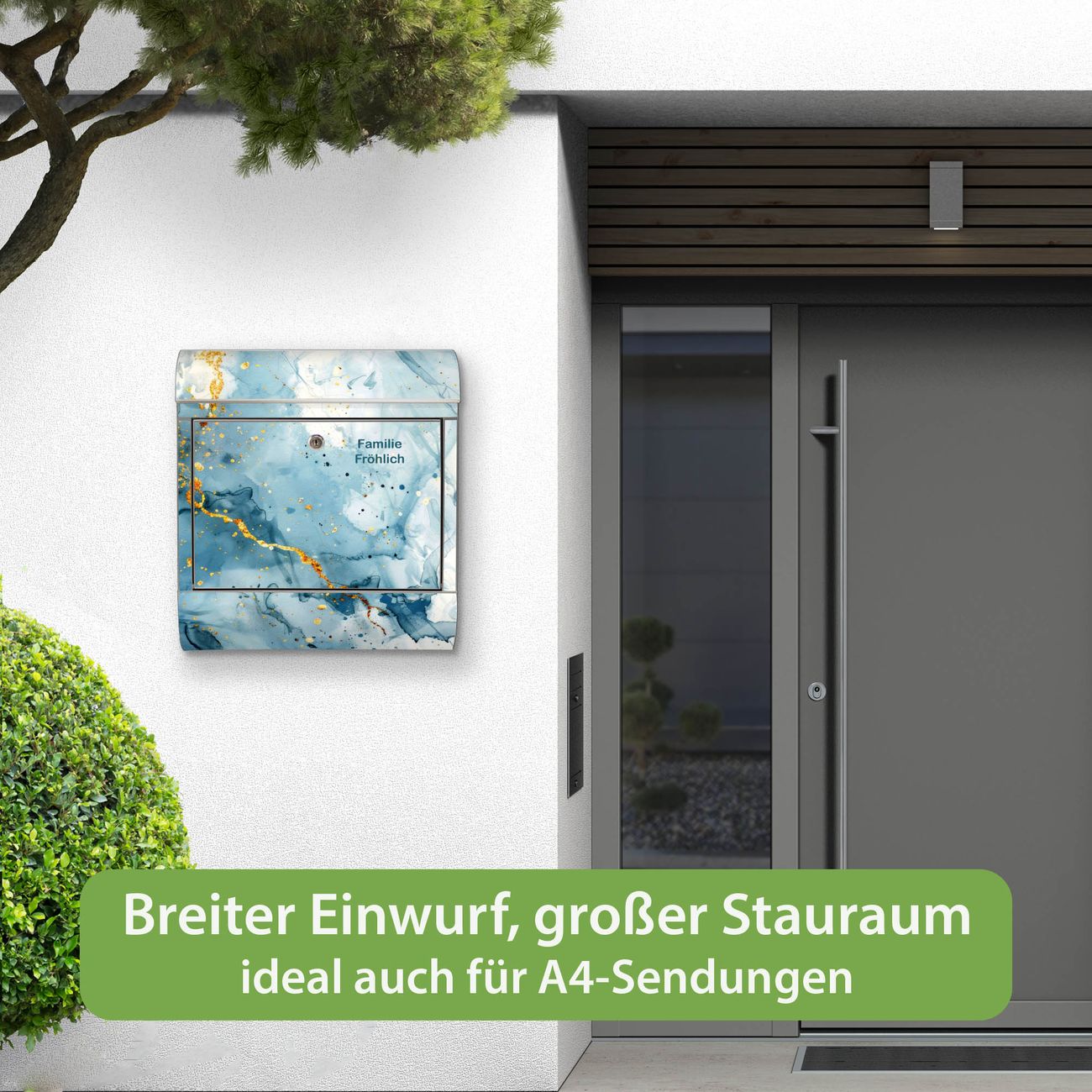 FUNKTION: Der banjado Edelstahl Briefkasten mit Motiv Motiv Blauer Marmor mit Gold 3 bietet Ihnen mit seinem Fassungsvermögen genügend Platz auch für große A4 Sendungen. Das integrierte Zeitungsfach eignet sich hervorragend um unkompliziert die Tageszeitung zu fassen. Auf Wunsch können Sie bei uns den passenden Ständer kaufen und so aus dem Wandbriefkasten einen Standbriefkasten machen. DESIGN: Der Motivbriefkasten hat ein sehr ansprechendes und ausgefallenes Design, damit entlocken Sie Ihren Nachbarn und dem Postboten ein Lächeln. Heben Sie Sich ab von der tristen grauen Masse ohne auf Funktionalität zu verzichten. DETAILS: Der Design Briefkasten mit Motiv Motiv Blauer Marmor mit Gold 3 besteht aus hochwertigem 18/0 Edelstahl. Das Motiv besteht aus einer wetter- und UV-resistenten Folie, die mit einem Schutzlaminat überzogen ist. Der Briefkasten wird mit Montagematerial und zwei Schlüsseln geliefert. NUTZEN: Sie können diesen Briefkasten sowohl als Wandbriefkasten montieren oder einen passenden Ständer auswählen und als Standbriefkasten einbetonieren. Die Größe bietet genügend Platz für Sendungen aller Art, das hochwertige Edelstahl ist rostfrei und die Motivfolie absolut wetterfest. SCHUTZ: Um Ihre Post optimal vor Witterungseinflüssen wie Starkregen zu schützen, empfehlen wir, den Briefkasten geschützt anzubringen. BANJADO: Ihr Briefkasten wird in Sachsen in einer kleinen Manufaktur von Hand veredelt. Die Motivfolie ist lösungsmittelfrei und schutzlaminiert, dies sorgt für einen langen Halt. Wir legen großen Wert auf die Verbindung von Funktionalität und Design. Sie erhalten Handarbeit aus Sachsen.