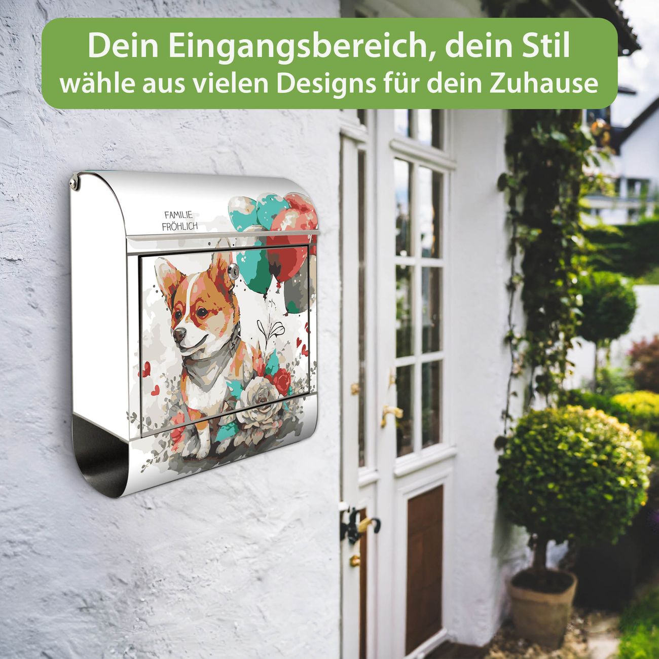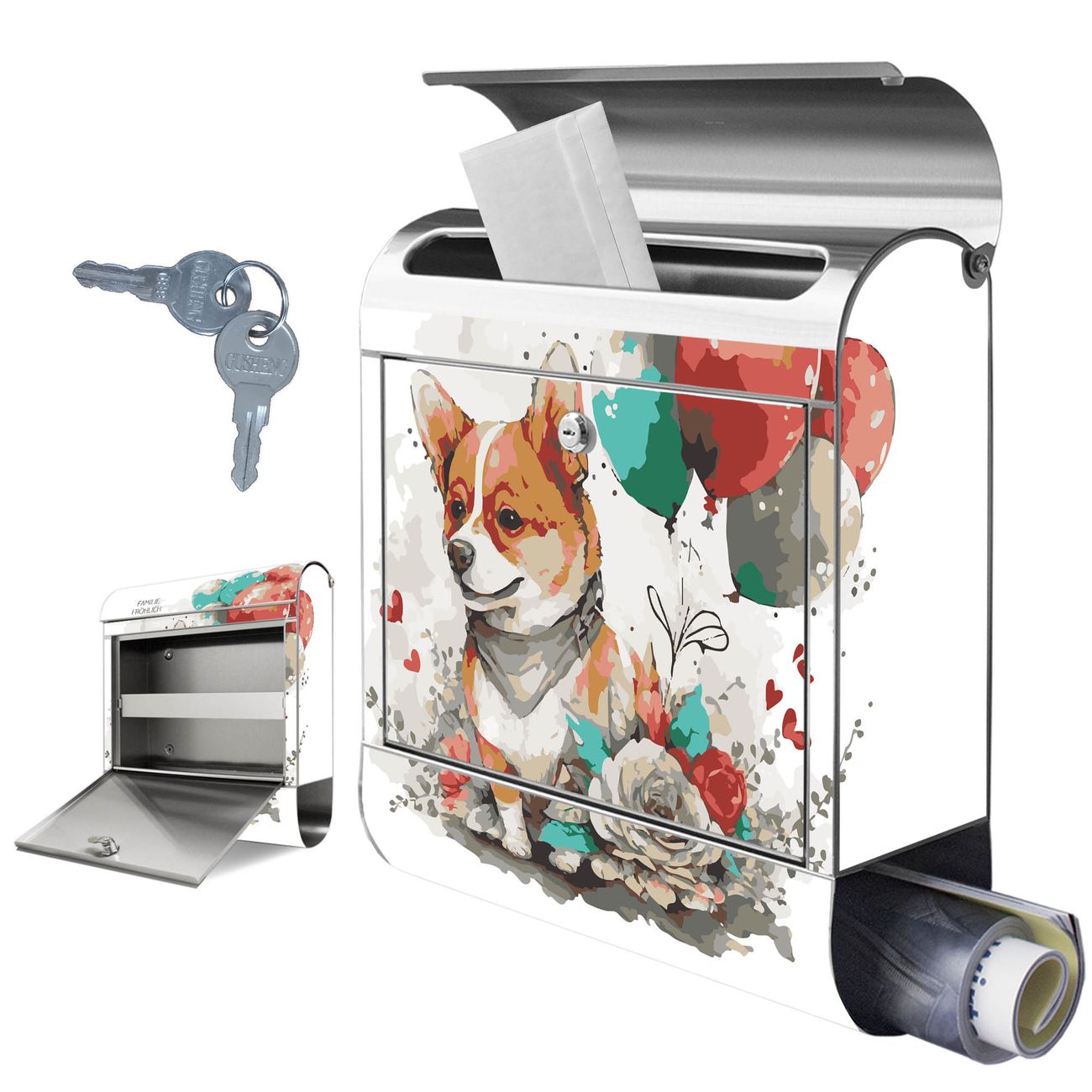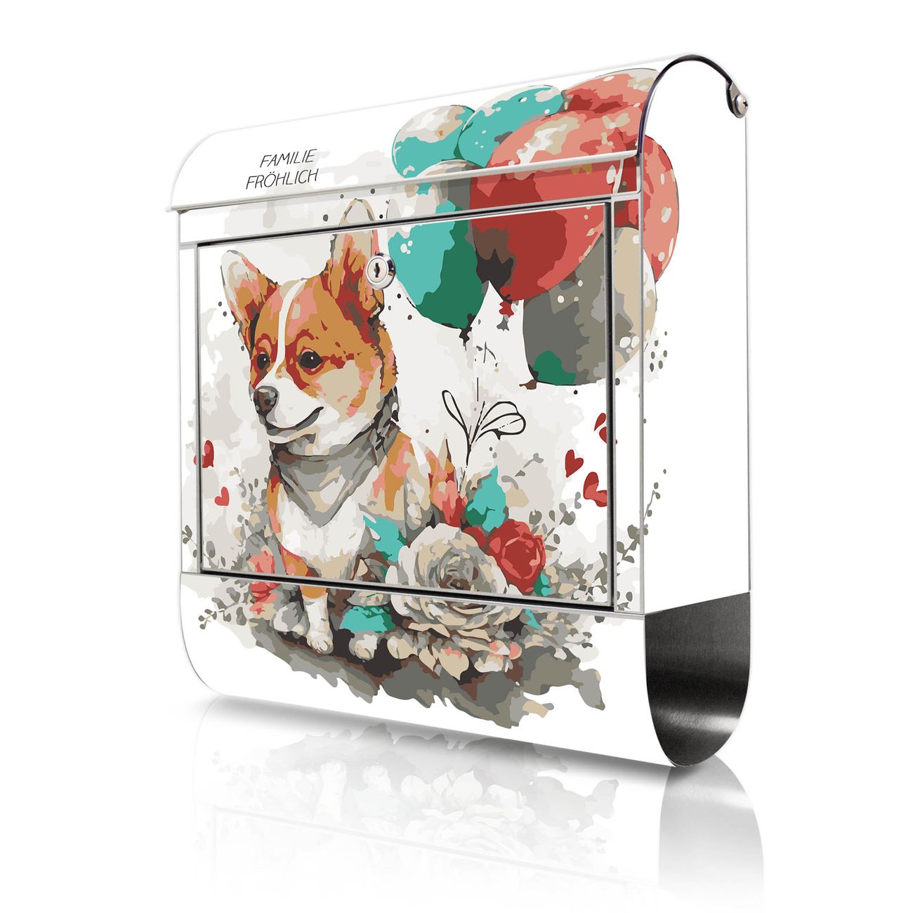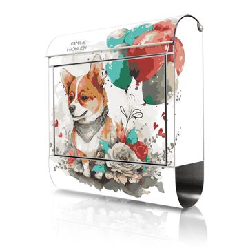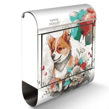 Wandbriefkasten Edelstahl Motiv Corgi mit Ballons Aquarell