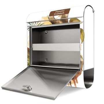 FUNKTION: Der banjado Edelstahl Briefkasten mit Motiv Motiv Faultier mit Blütenmähne bietet Ihnen mit seinem Fassungsvermögen genügend Platz auch für große A4 Sendungen. Das integrierte Zeitungsfach eignet sich hervorragend um unkompliziert die Tageszeitung zu fassen. Auf Wunsch können Sie bei uns den passenden Ständer kaufen und so aus dem Wandbriefkasten einen Standbriefkasten machen. DESIGN: Der Motivbriefkasten hat ein sehr ansprechendes und ausgefallenes Design, damit entlocken Sie Ihren Nachbarn und dem Postboten ein Lächeln. Heben Sie Sich ab von der tristen grauen Masse ohne auf Funktionalität zu verzichten. DETAILS: Der Design Briefkasten mit Motiv Motiv Faultier mit Blütenmähne besteht aus hochwertigem 18/0 Edelstahl. Das Motiv besteht aus einer wetter- und UV-resistenten Folie, die mit einem Schutzlaminat überzogen ist. Der Briefkasten wird mit Montagematerial und zwei Schlüsseln geliefert. NUTZEN: Sie können diesen Briefkasten sowohl als Wandbriefkasten montieren oder einen passenden Ständer auswählen und als Standbriefkasten einbetonieren. Die Größe bietet genügend Platz für Sendungen aller Art, das hochwertige Edelstahl ist rostfrei und die Motivfolie absolut wetterfest. SCHUTZ: Um Ihre Post optimal vor Witterungseinflüssen wie Starkregen zu schützen, empfehlen wir, den Briefkasten geschützt anzubringen. BANJADO: Ihr Briefkasten wird in Sachsen in einer kleinen Manufaktur von Hand veredelt. Die Motivfolie ist lösungsmittelfrei und schutzlaminiert, dies sorgt für einen langen Halt. Wir legen großen Wert auf die Verbindung von Funktionalität und Design. Sie erhalten Handarbeit aus Sachsen.