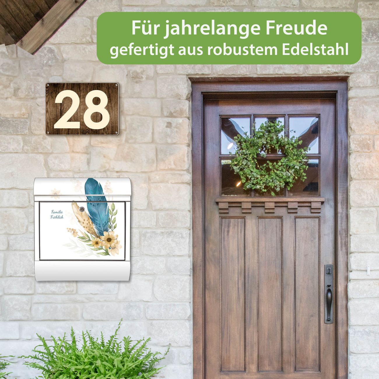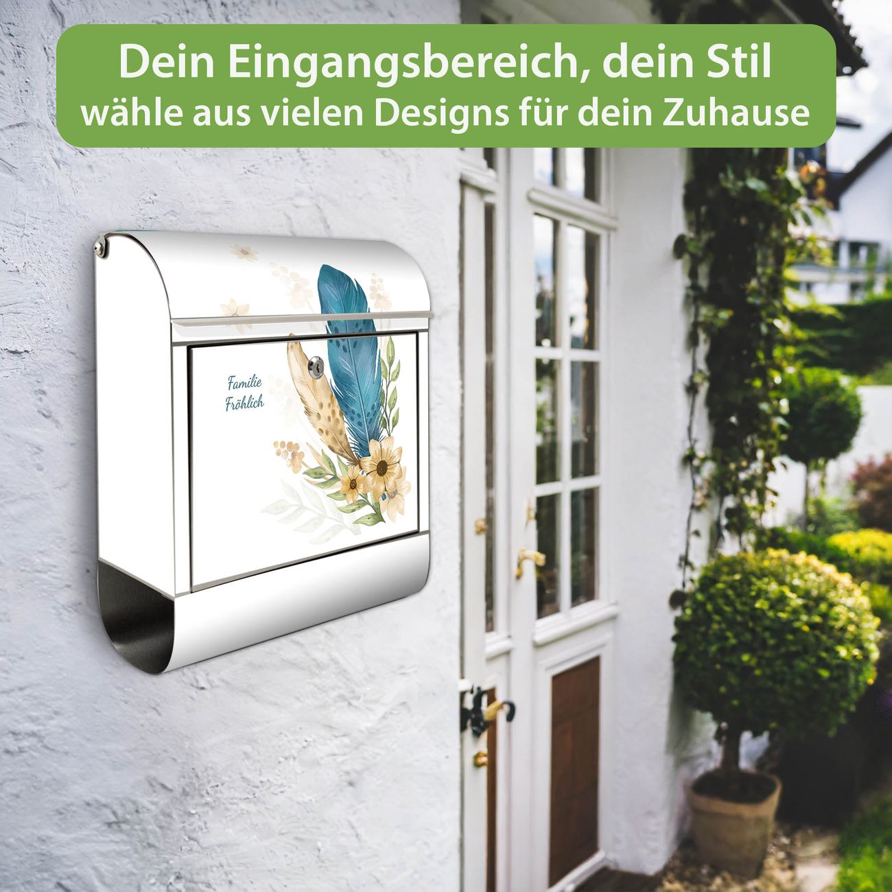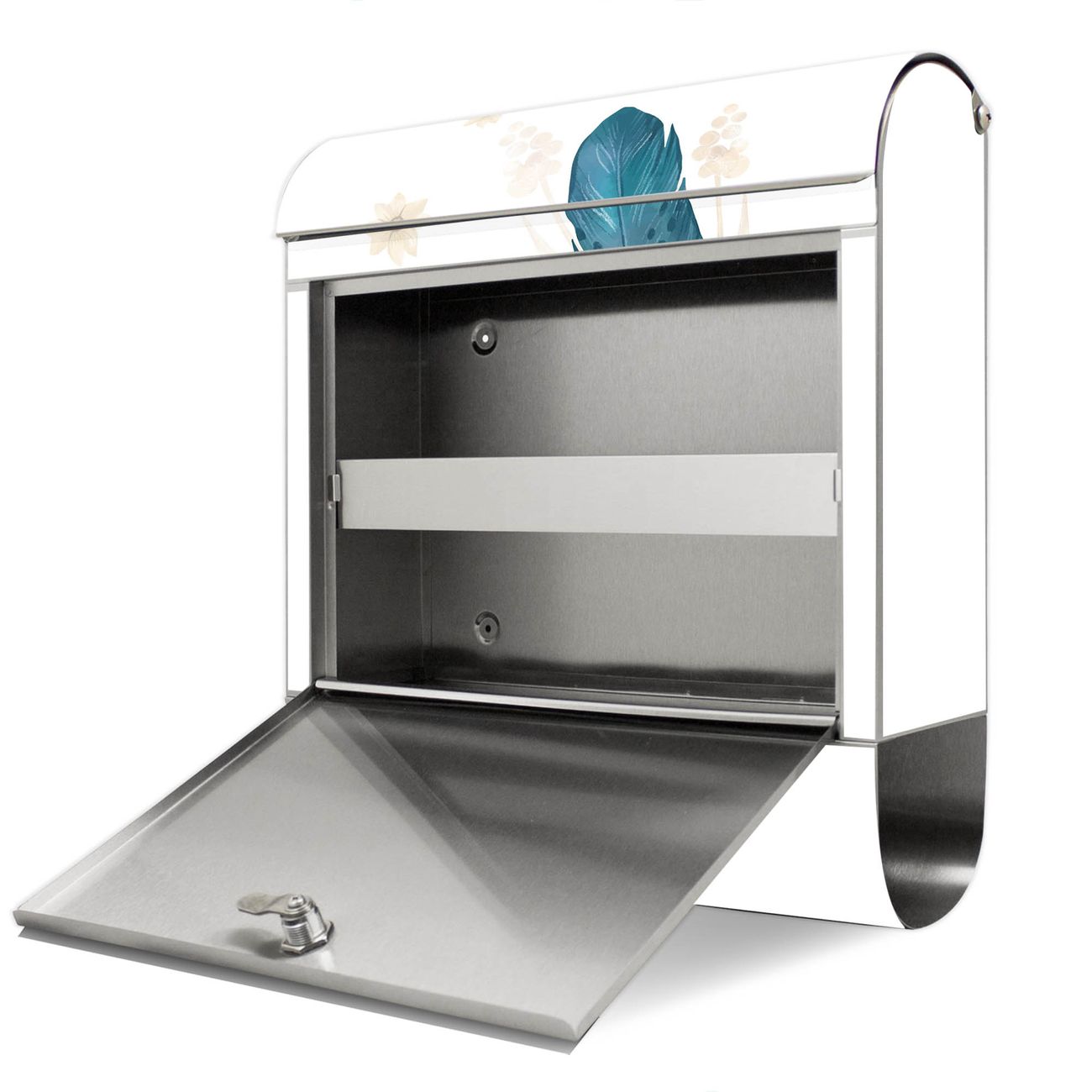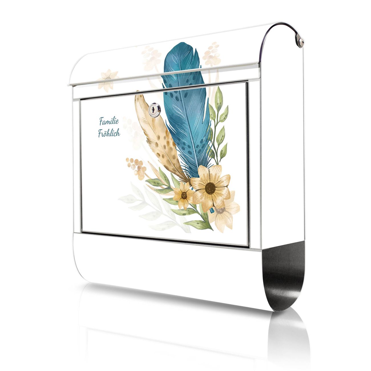 Wandbriefkasten Edelstahl Motiv Federn und Blüten Boho