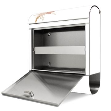 FUNKTION: Der banjado Edelstahl Briefkasten mit Motiv Motiv Floraler Kranz bietet Ihnen mit seinem Fassungsvermögen genügend Platz auch für große A4 Sendungen. Das integrierte Zeitungsfach eignet sich hervorragend um unkompliziert die Tageszeitung zu fassen. Auf Wunsch können Sie bei uns den passenden Ständer kaufen und so aus dem Wandbriefkasten einen Standbriefkasten machen. DESIGN: Der Motivbriefkasten hat ein sehr ansprechendes und ausgefallenes Design, damit entlocken Sie Ihren Nachbarn und dem Postboten ein Lächeln. Heben Sie Sich ab von der tristen grauen Masse ohne auf Funktionalität zu verzichten. DETAILS: Der Design Briefkasten mit Motiv Motiv Floraler Kranz besteht aus hochwertigem 18/0 Edelstahl. Das Motiv besteht aus einer wetter- und UV-resistenten Folie, die mit einem Schutzlaminat überzogen ist. Der Briefkasten wird mit Montagematerial und zwei Schlüsseln geliefert. NUTZEN: Sie können diesen Briefkasten sowohl als Wandbriefkasten montieren oder einen passenden Ständer auswählen und als Standbriefkasten einbetonieren. Die Größe bietet genügend Platz für Sendungen aller Art, das hochwertige Edelstahl ist rostfrei und die Motivfolie absolut wetterfest. SCHUTZ: Um Ihre Post optimal vor Witterungseinflüssen wie Starkregen zu schützen, empfehlen wir, den Briefkasten geschützt anzubringen. BANJADO: Ihr Briefkasten wird in Sachsen in einer kleinen Manufaktur von Hand veredelt. Die Motivfolie ist lösungsmittelfrei und schutzlaminiert, dies sorgt für einen langen Halt. Wir legen großen Wert auf die Verbindung von Funktionalität und Design. Sie erhalten Handarbeit aus Sachsen.