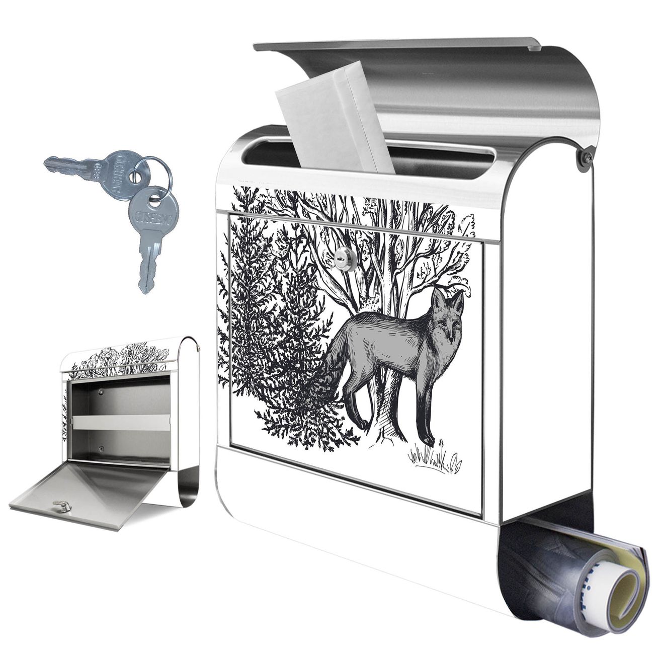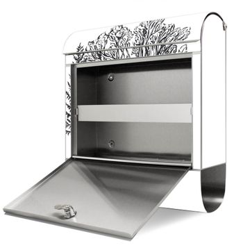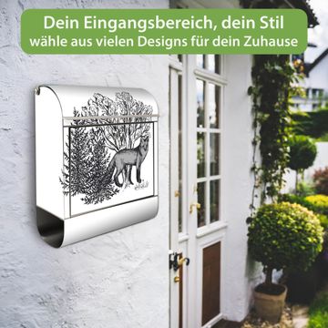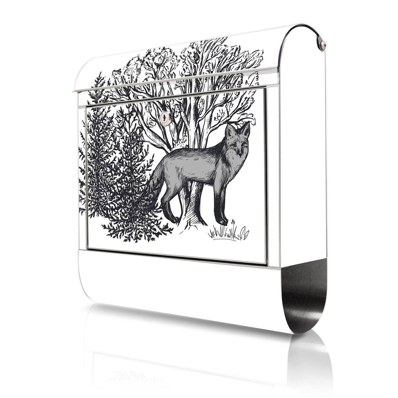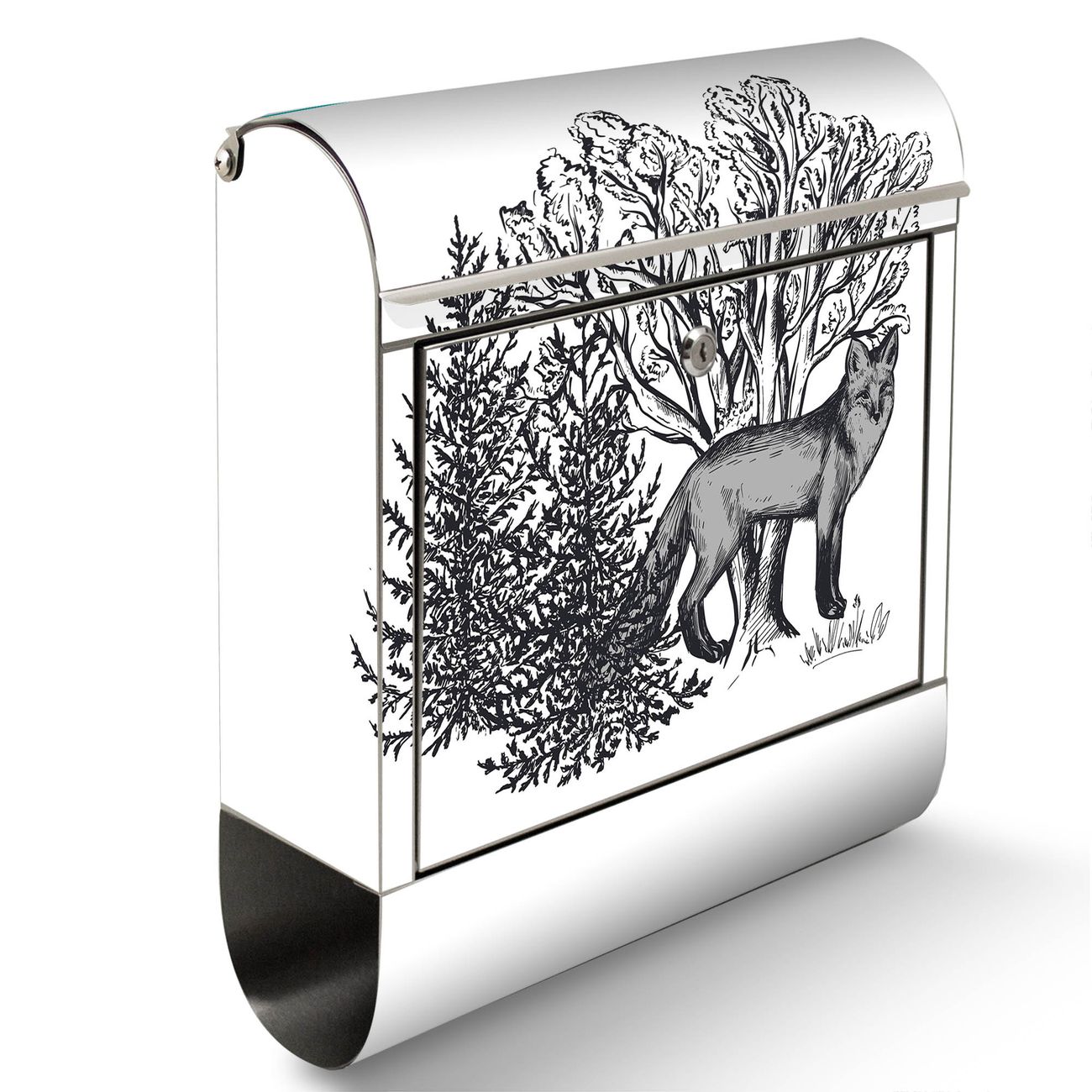 Wandbriefkasten Edelstahl Motiv Fuchs in Schwarz-Weiß