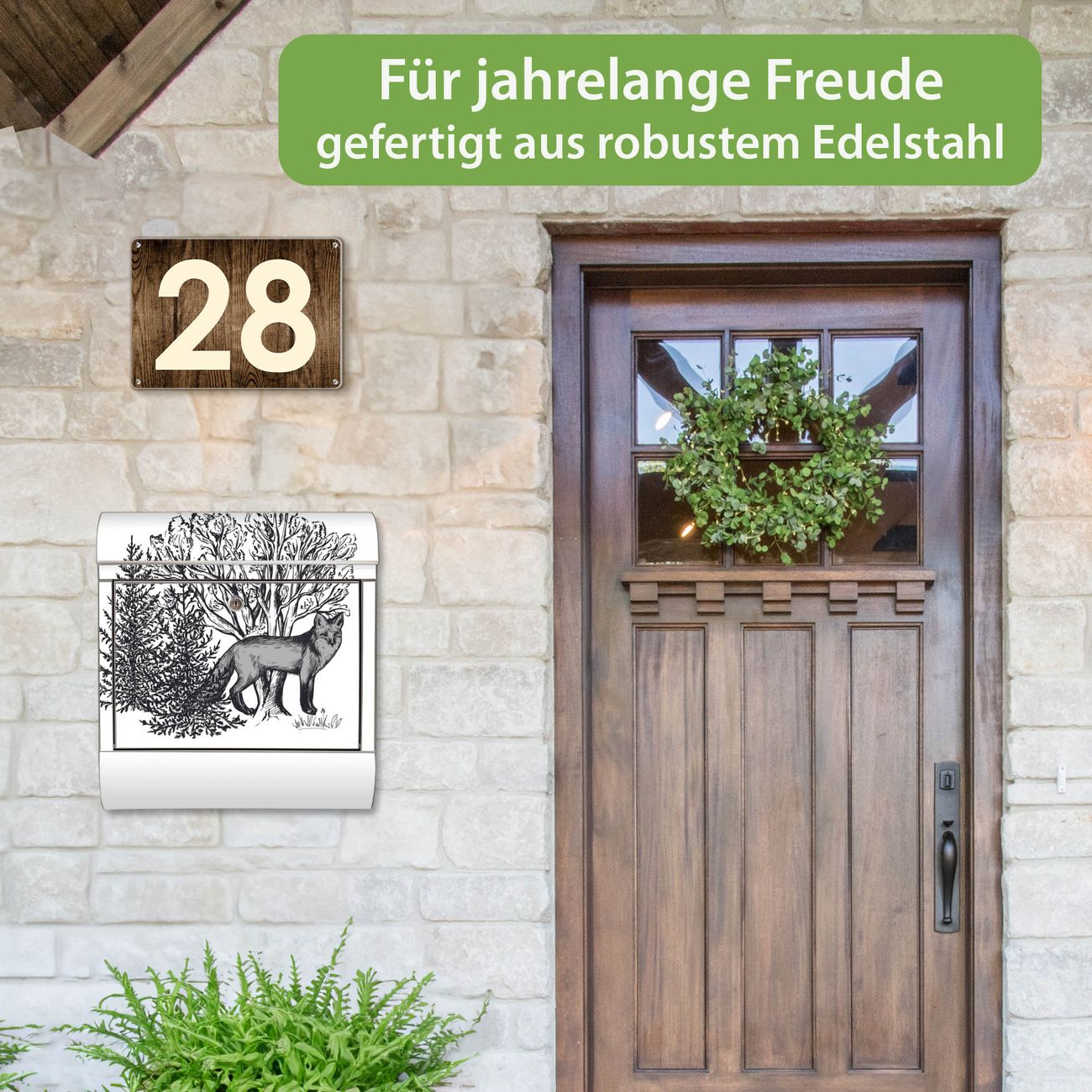 FUNKTION: Der banjado Edelstahl Briefkasten mit Motiv Motiv Fuchs in Schwarz-Weiß bietet Ihnen mit seinem Fassungsvermögen genügend Platz auch für große A4 Sendungen. Das integrierte Zeitungsfach eignet sich hervorragend um unkompliziert die Tageszeitung zu fassen. Auf Wunsch können Sie bei uns den passenden Ständer kaufen und so aus dem Wandbriefkasten einen Standbriefkasten machen. DESIGN: Der Motivbriefkasten hat ein sehr ansprechendes und ausgefallenes Design, damit entlocken Sie Ihren Nachbarn und dem Postboten ein Lächeln. Heben Sie Sich ab von der tristen grauen Masse ohne auf Funktionalität zu verzichten. DETAILS: Der Design Briefkasten mit Motiv Motiv Fuchs in Schwarz-Weiß besteht aus hochwertigem 18/0 Edelstahl. Das Motiv besteht aus einer wetter- und UV-resistenten Folie, die mit einem Schutzlaminat überzogen ist. Der Briefkasten wird mit Montagematerial und zwei Schlüsseln geliefert. NUTZEN: Sie können diesen Briefkasten sowohl als Wandbriefkasten montieren oder einen passenden Ständer auswählen und als Standbriefkasten einbetonieren. Die Größe bietet genügend Platz für Sendungen aller Art, das hochwertige Edelstahl ist rostfrei und die Motivfolie absolut wetterfest. SCHUTZ: Um Ihre Post optimal vor Witterungseinflüssen wie Starkregen zu schützen, empfehlen wir, den Briefkasten geschützt anzubringen. BANJADO: Ihr Briefkasten wird in Sachsen in einer kleinen Manufaktur von Hand veredelt. Die Motivfolie ist lösungsmittelfrei und schutzlaminiert, dies sorgt für einen langen Halt. Wir legen großen Wert auf die Verbindung von Funktionalität und Design. Sie erhalten Handarbeit aus Sachsen.