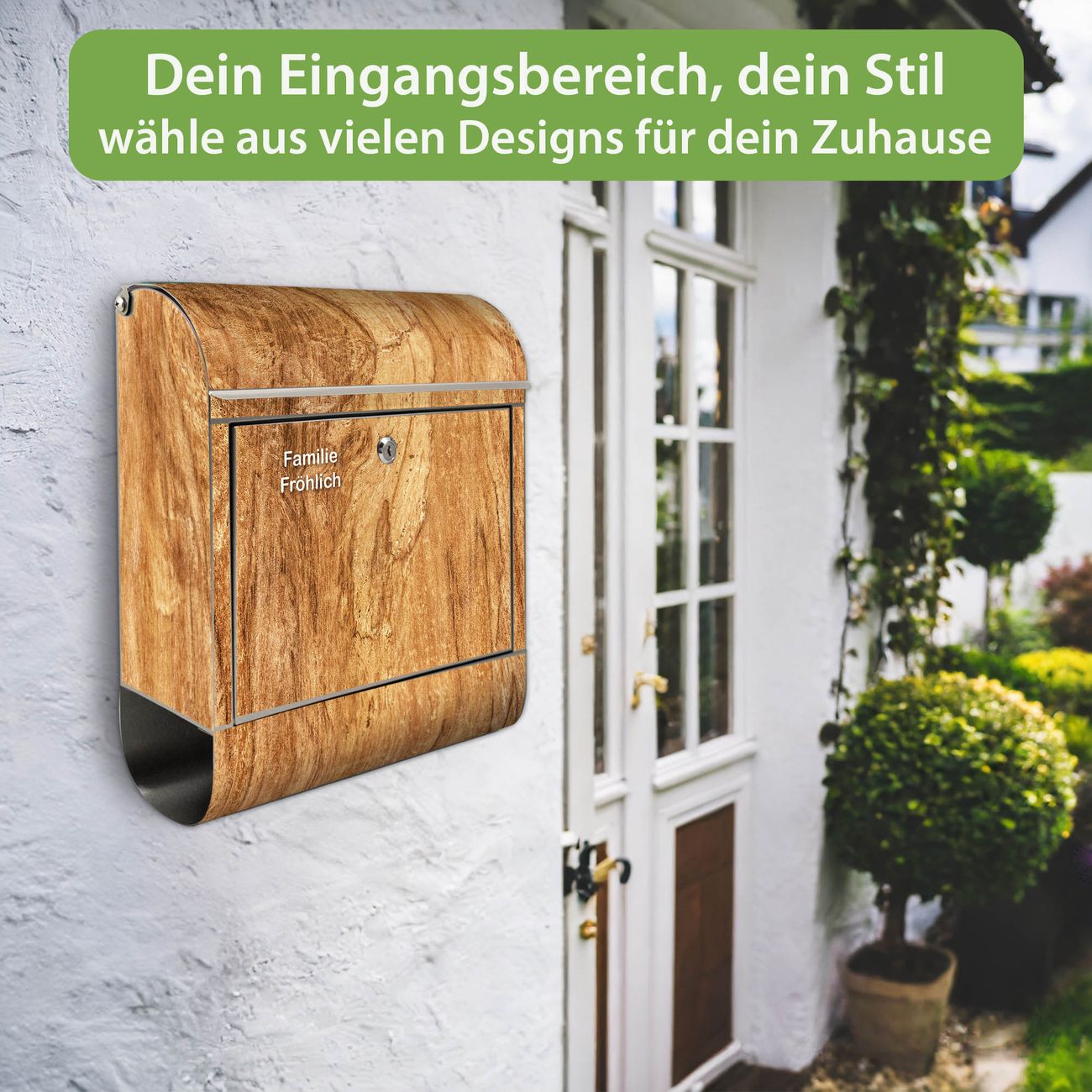 FUNKTION: Der banjado Edelstahl Briefkasten mit Motiv Motiv Holz Struktur mit Astloch bietet Ihnen mit seinem Fassungsvermögen genügend Platz auch für große A4 Sendungen. Das integrierte Zeitungsfach eignet sich hervorragend um unkompliziert die Tageszeitung zu fassen. Auf Wunsch können Sie bei uns den passenden Ständer kaufen und so aus dem Wandbriefkasten einen Standbriefkasten machen. DESIGN: Der Motivbriefkasten hat ein sehr ansprechendes und ausgefallenes Design, damit entlocken Sie Ihren Nachbarn und dem Postboten ein Lächeln. Heben Sie Sich ab von der tristen grauen Masse ohne auf Funktionalität zu verzichten. DETAILS: Der Design Briefkasten mit Motiv Motiv Holz Struktur mit Astloch besteht aus hochwertigem 18/0 Edelstahl. Das Motiv besteht aus einer wetter- und UV-resistenten Folie, die mit einem Schutzlaminat überzogen ist. Der Briefkasten wird mit Montagematerial und zwei Schlüsseln geliefert. NUTZEN: Sie können diesen Briefkasten sowohl als Wandbriefkasten montieren oder einen passenden Ständer auswählen und als Standbriefkasten einbetonieren. Die Größe bietet genügend Platz für Sendungen aller Art, das hochwertige Edelstahl ist rostfrei und die Motivfolie absolut wetterfest. SCHUTZ: Um Ihre Post optimal vor Witterungseinflüssen wie Starkregen zu schützen, empfehlen wir, den Briefkasten geschützt anzubringen. BANJADO: Ihr Briefkasten wird in Sachsen in einer kleinen Manufaktur von Hand veredelt. Die Motivfolie ist lösungsmittelfrei und schutzlaminiert, dies sorgt für einen langen Halt. Wir legen großen Wert auf die Verbindung von Funktionalität und Design. Sie erhalten Handarbeit aus Sachsen.