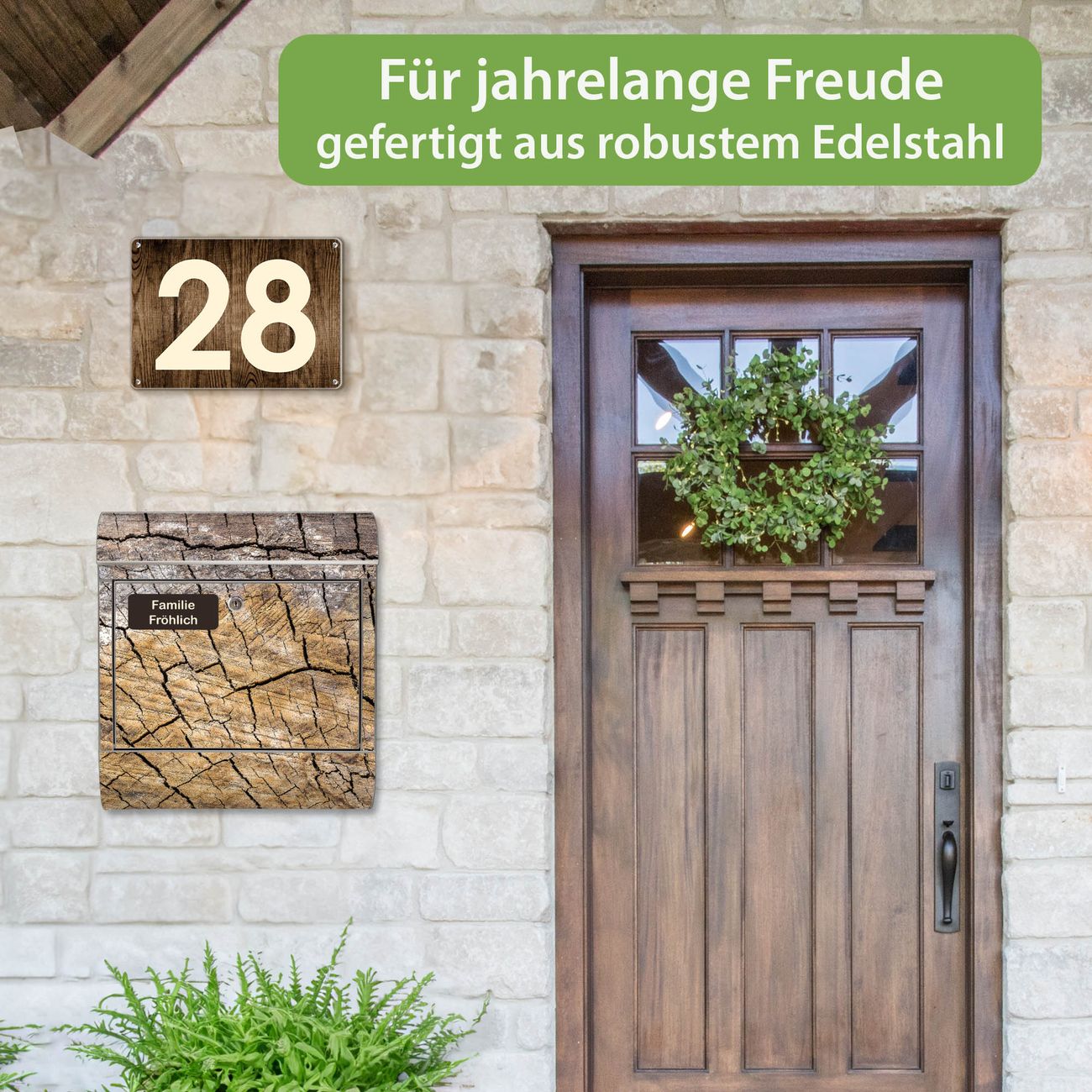 FUNKTION: Der banjado Edelstahl Briefkasten mit Motiv Motiv Holzrisse bietet Ihnen mit seinem Fassungsvermögen genügend Platz auch für große A4 Sendungen. Das integrierte Zeitungsfach eignet sich hervorragend um unkompliziert die Tageszeitung zu fassen. Auf Wunsch können Sie bei uns den passenden Ständer kaufen und so aus dem Wandbriefkasten einen Standbriefkasten machen. DESIGN: Der Motivbriefkasten hat ein sehr ansprechendes und ausgefallenes Design, damit entlocken Sie Ihren Nachbarn und dem Postboten ein Lächeln. Heben Sie Sich ab von der tristen grauen Masse ohne auf Funktionalität zu verzichten. DETAILS: Der Design Briefkasten mit Motiv Motiv Holzrisse besteht aus hochwertigem 18/0 Edelstahl. Das Motiv besteht aus einer wetter- und UV-resistenten Folie, die mit einem Schutzlaminat überzogen ist. Der Briefkasten wird mit Montagematerial und zwei Schlüsseln geliefert. NUTZEN: Sie können diesen Briefkasten sowohl als Wandbriefkasten montieren oder einen passenden Ständer auswählen und als Standbriefkasten einbetonieren. Die Größe bietet genügend Platz für Sendungen aller Art, das hochwertige Edelstahl ist rostfrei und die Motivfolie absolut wetterfest. SCHUTZ: Um Ihre Post optimal vor Witterungseinflüssen wie Starkregen zu schützen, empfehlen wir, den Briefkasten geschützt anzubringen. BANJADO: Ihr Briefkasten wird in Sachsen in einer kleinen Manufaktur von Hand veredelt. Die Motivfolie ist lösungsmittelfrei und schutzlaminiert, dies sorgt für einen langen Halt. Wir legen großen Wert auf die Verbindung von Funktionalität und Design. Sie erhalten Handarbeit aus Sachsen.