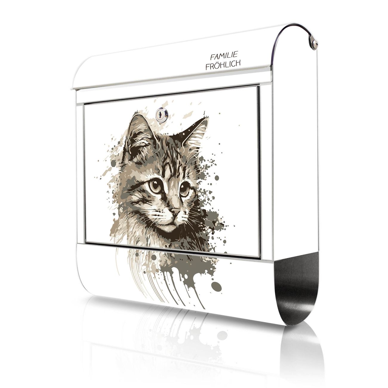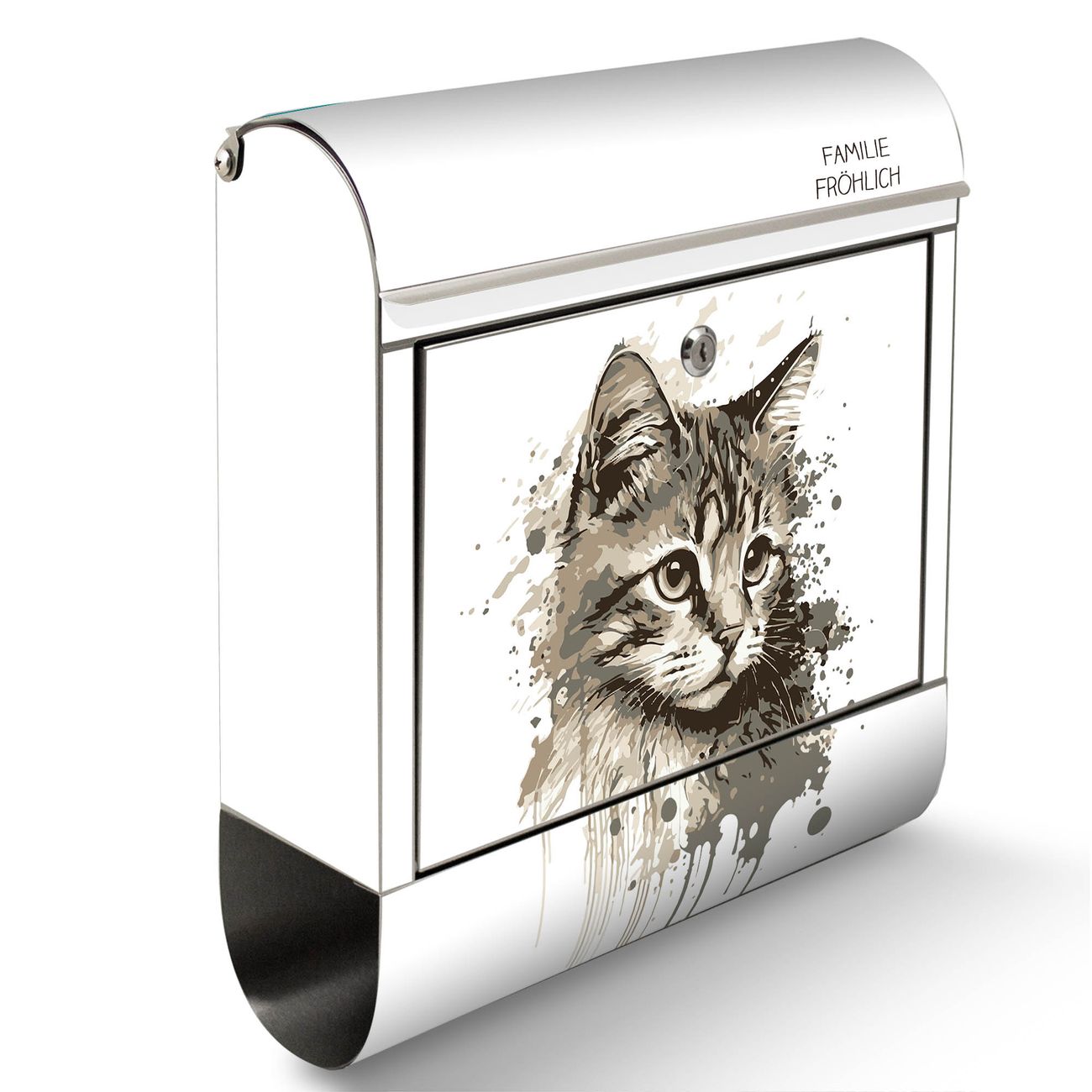 Wandbriefkasten Edelstahl Motiv Katzenportrait in Aquarell 3