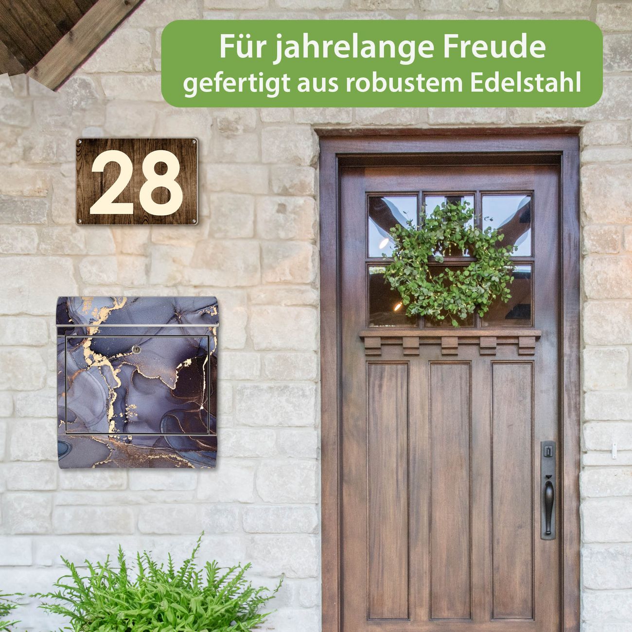 FUNKTION: Der banjado Edelstahl Briefkasten mit Motiv Motiv Lila Marmor mit Gold 1 bietet Ihnen mit seinem Fassungsvermögen genügend Platz auch für große A4 Sendungen. Das integrierte Zeitungsfach eignet sich hervorragend um unkompliziert die Tageszeitung zu fassen. Auf Wunsch können Sie bei uns den passenden Ständer kaufen und so aus dem Wandbriefkasten einen Standbriefkasten machen. DESIGN: Der Motivbriefkasten hat ein sehr ansprechendes und ausgefallenes Design, damit entlocken Sie Ihren Nachbarn und dem Postboten ein Lächeln. Heben Sie Sich ab von der tristen grauen Masse ohne auf Funktionalität zu verzichten. DETAILS: Der Design Briefkasten mit Motiv Motiv Lila Marmor mit Gold 1 besteht aus hochwertigem 18/0 Edelstahl. Das Motiv besteht aus einer wetter- und UV-resistenten Folie, die mit einem Schutzlaminat überzogen ist. Der Briefkasten wird mit Montagematerial und zwei Schlüsseln geliefert. NUTZEN: Sie können diesen Briefkasten sowohl als Wandbriefkasten montieren oder einen passenden Ständer auswählen und als Standbriefkasten einbetonieren. Die Größe bietet genügend Platz für Sendungen aller Art, das hochwertige Edelstahl ist rostfrei und die Motivfolie absolut wetterfest. SCHUTZ: Um Ihre Post optimal vor Witterungseinflüssen wie Starkregen zu schützen, empfehlen wir, den Briefkasten geschützt anzubringen. BANJADO: Ihr Briefkasten wird in Sachsen in einer kleinen Manufaktur von Hand veredelt. Die Motivfolie ist lösungsmittelfrei und schutzlaminiert, dies sorgt für einen langen Halt. Wir legen großen Wert auf die Verbindung von Funktionalität und Design. Sie erhalten Handarbeit aus Sachsen.