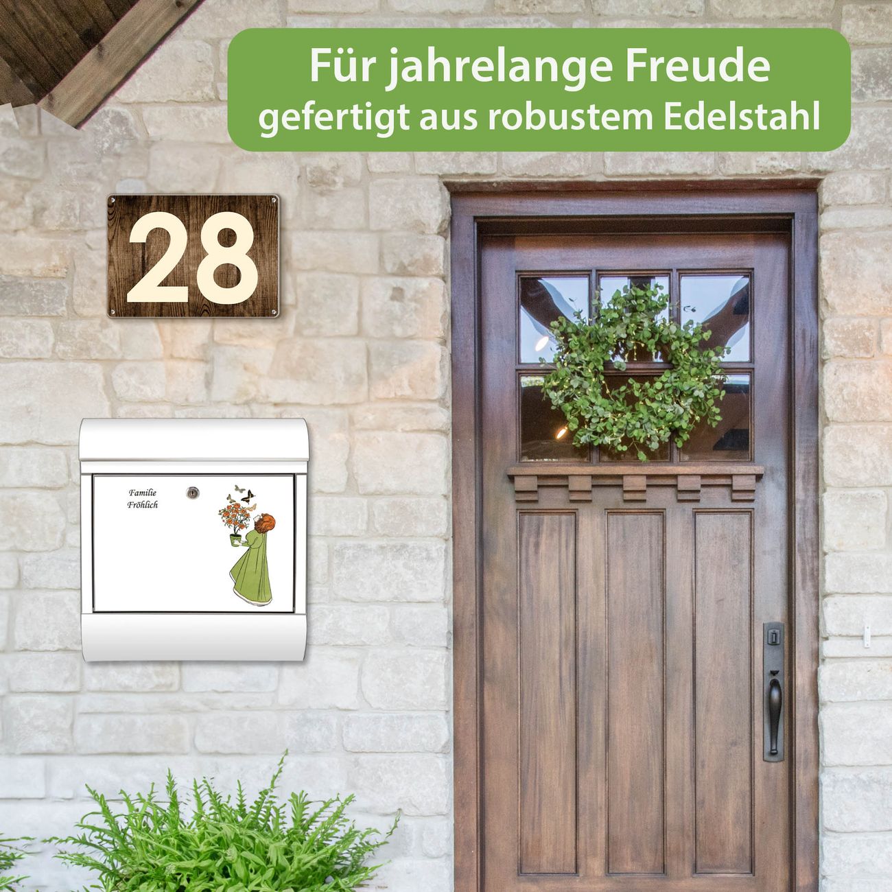 FUNKTION: Der banjado Edelstahl Briefkasten mit Motiv Motiv Mädchen mit Blumentopf Vintage bietet Ihnen mit seinem Fassungsvermögen genügend Platz auch für große A4 Sendungen. Das integrierte Zeitungsfach eignet sich hervorragend um unkompliziert die Tageszeitung zu fassen. Auf Wunsch können Sie bei uns den passenden Ständer kaufen und so aus dem Wandbriefkasten einen Standbriefkasten machen. DESIGN: Der Motivbriefkasten hat ein sehr ansprechendes und ausgefallenes Design, damit entlocken Sie Ihren Nachbarn und dem Postboten ein Lächeln. Heben Sie Sich ab von der tristen grauen Masse ohne auf Funktionalität zu verzichten. DETAILS: Der Design Briefkasten mit Motiv Motiv Mädchen mit Blumentopf Vintage besteht aus hochwertigem 18/0 Edelstahl. Das Motiv besteht aus einer wetter- und UV-resistenten Folie, die mit einem Schutzlaminat überzogen ist. Der Briefkasten wird mit Montagematerial und zwei Schlüsseln geliefert. NUTZEN: Sie können diesen Briefkasten sowohl als Wandbriefkasten montieren oder einen passenden Ständer auswählen und als Standbriefkasten einbetonieren. Die Größe bietet genügend Platz für Sendungen aller Art, das hochwertige Edelstahl ist rostfrei und die Motivfolie absolut wetterfest. SCHUTZ: Um Ihre Post optimal vor Witterungseinflüssen wie Starkregen zu schützen, empfehlen wir, den Briefkasten geschützt anzubringen. BANJADO: Ihr Briefkasten wird in Sachsen in einer kleinen Manufaktur von Hand veredelt. Die Motivfolie ist lösungsmittelfrei und schutzlaminiert, dies sorgt für einen langen Halt. Wir legen großen Wert auf die Verbindung von Funktionalität und Design. Sie erhalten Handarbeit aus Sachsen.