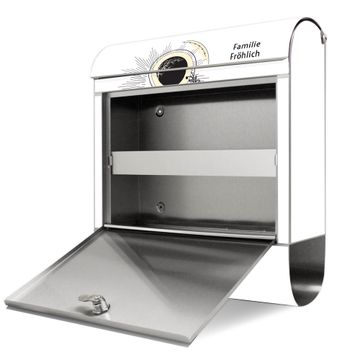 FUNKTION: Der banjado Edelstahl Briefkasten mit Motiv Motiv Mystischer Wolf bietet Ihnen mit seinem Fassungsvermögen genügend Platz auch für große A4 Sendungen. Das integrierte Zeitungsfach eignet sich hervorragend um unkompliziert die Tageszeitung zu fassen. Auf Wunsch können Sie bei uns den passenden Ständer kaufen und so aus dem Wandbriefkasten einen Standbriefkasten machen. DESIGN: Der Motivbriefkasten hat ein sehr ansprechendes und ausgefallenes Design, damit entlocken Sie Ihren Nachbarn und dem Postboten ein Lächeln. Heben Sie Sich ab von der tristen grauen Masse ohne auf Funktionalität zu verzichten. DETAILS: Der Design Briefkasten mit Motiv Motiv Mystischer Wolf besteht aus hochwertigem 18/0 Edelstahl. Das Motiv besteht aus einer wetter- und UV-resistenten Folie, die mit einem Schutzlaminat überzogen ist. Der Briefkasten wird mit Montagematerial und zwei Schlüsseln geliefert. NUTZEN: Sie können diesen Briefkasten sowohl als Wandbriefkasten montieren oder einen passenden Ständer auswählen und als Standbriefkasten einbetonieren. Die Größe bietet genügend Platz für Sendungen aller Art, das hochwertige Edelstahl ist rostfrei und die Motivfolie absolut wetterfest. SCHUTZ: Um Ihre Post optimal vor Witterungseinflüssen wie Starkregen zu schützen, empfehlen wir, den Briefkasten geschützt anzubringen. BANJADO: Ihr Briefkasten wird in Sachsen in einer kleinen Manufaktur von Hand veredelt. Die Motivfolie ist lösungsmittelfrei und schutzlaminiert, dies sorgt für einen langen Halt. Wir legen großen Wert auf die Verbindung von Funktionalität und Design. Sie erhalten Handarbeit aus Sachsen.