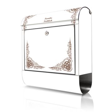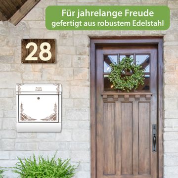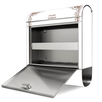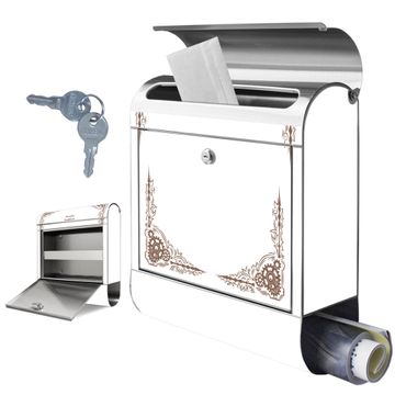 FUNKTION: Der banjado Edelstahl Briefkasten mit Motiv Motiv Ornamentaler Zahnräderrahmen bietet Ihnen mit seinem Fassungsvermögen genügend Platz auch für große A4 Sendungen. Das integrierte Zeitungsfach eignet sich hervorragend um unkompliziert die Tageszeitung zu fassen. Auf Wunsch können Sie bei uns den passenden Ständer kaufen und so aus dem Wandbriefkasten einen Standbriefkasten machen. DESIGN: Der Motivbriefkasten hat ein sehr ansprechendes und ausgefallenes Design, damit entlocken Sie Ihren Nachbarn und dem Postboten ein Lächeln. Heben Sie Sich ab von der tristen grauen Masse ohne auf Funktionalität zu verzichten. DETAILS: Der Design Briefkasten mit Motiv Motiv Ornamentaler Zahnräderrahmen besteht aus hochwertigem 18/0 Edelstahl. Das Motiv besteht aus einer wetter- und UV-resistenten Folie, die mit einem Schutzlaminat überzogen ist. Der Briefkasten wird mit Montagematerial und zwei Schlüsseln geliefert. NUTZEN: Sie können diesen Briefkasten sowohl als Wandbriefkasten montieren oder einen passenden Ständer auswählen und als Standbriefkasten einbetonieren. Die Größe bietet genügend Platz für Sendungen aller Art, das hochwertige Edelstahl ist rostfrei und die Motivfolie absolut wetterfest. SCHUTZ: Um Ihre Post optimal vor Witterungseinflüssen wie Starkregen zu schützen, empfehlen wir, den Briefkasten geschützt anzubringen. BANJADO: Ihr Briefkasten wird in Sachsen in einer kleinen Manufaktur von Hand veredelt. Die Motivfolie ist lösungsmittelfrei und schutzlaminiert, dies sorgt für einen langen Halt. Wir legen großen Wert auf die Verbindung von Funktionalität und Design. Sie erhalten Handarbeit aus Sachsen.