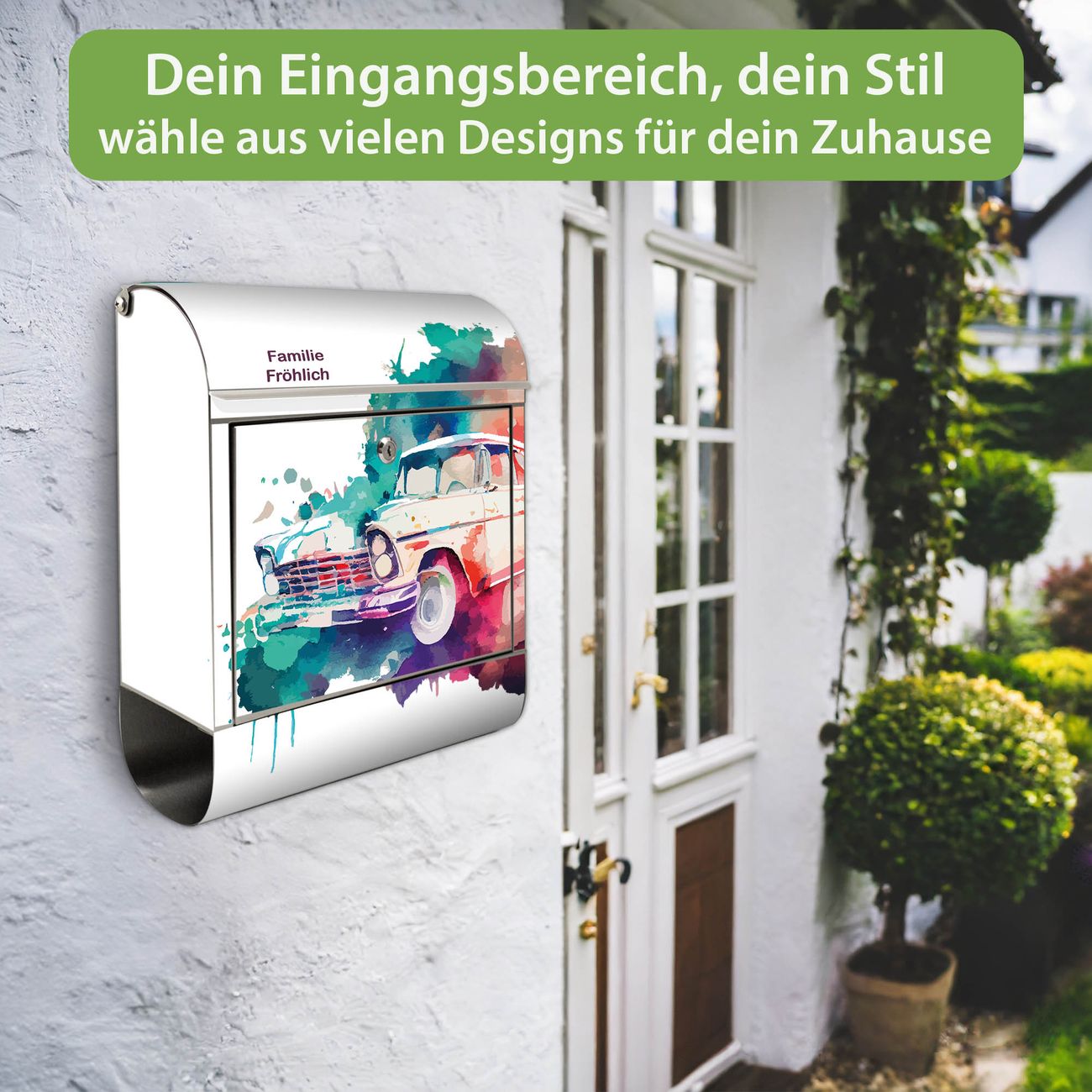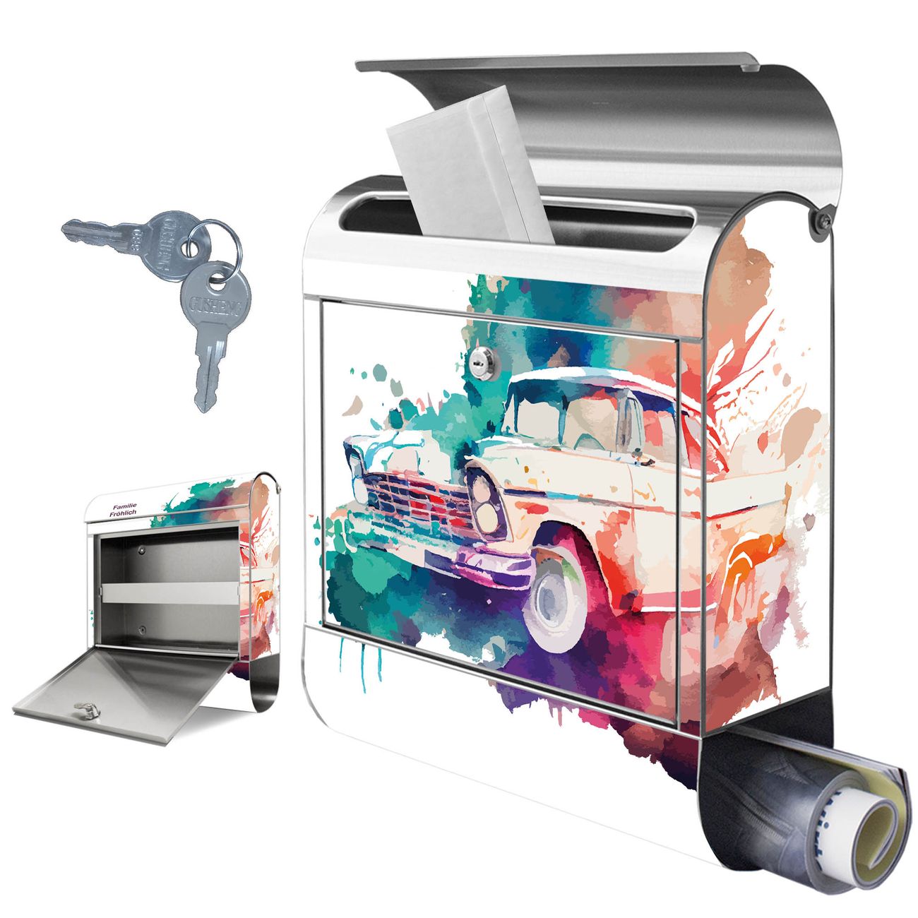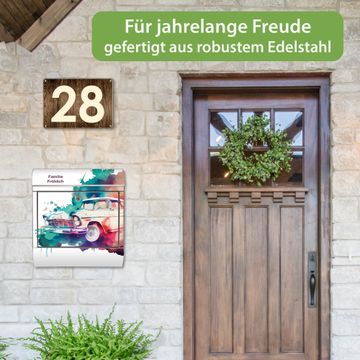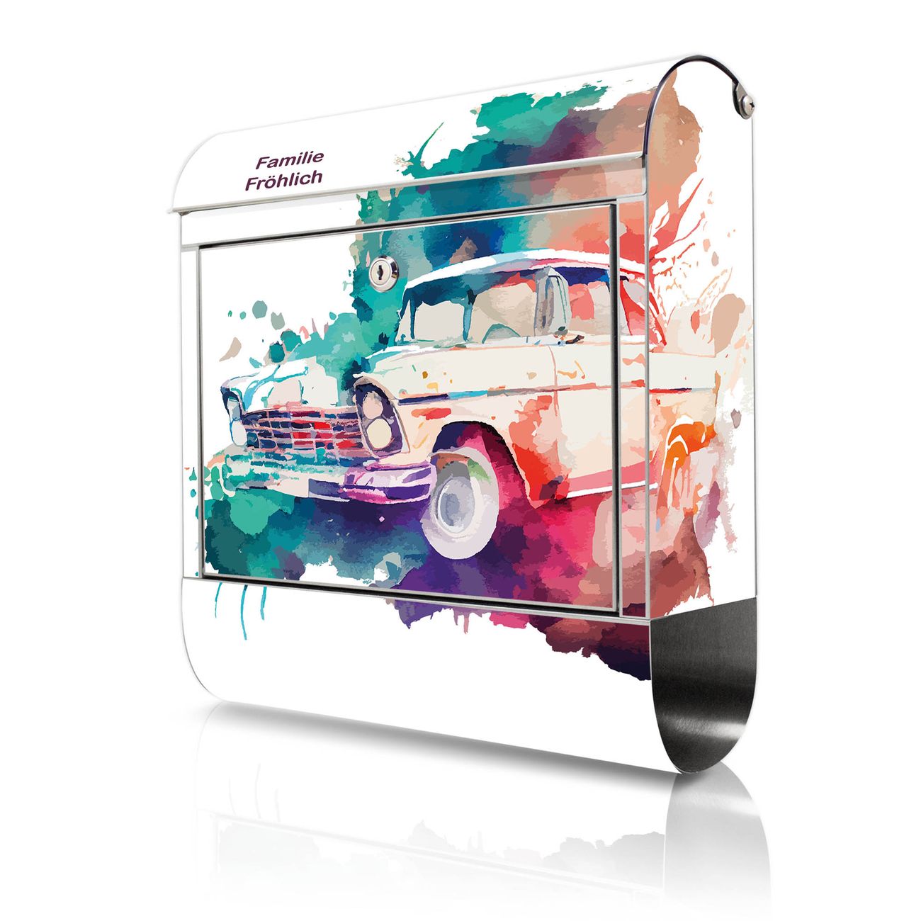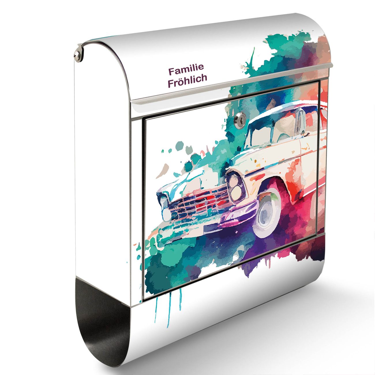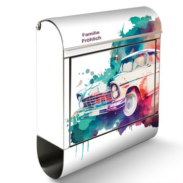 Wandbriefkasten Edelstahl Motiv Retro-Auto Aquarell