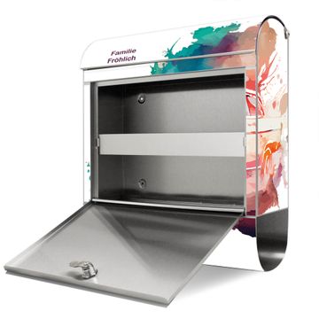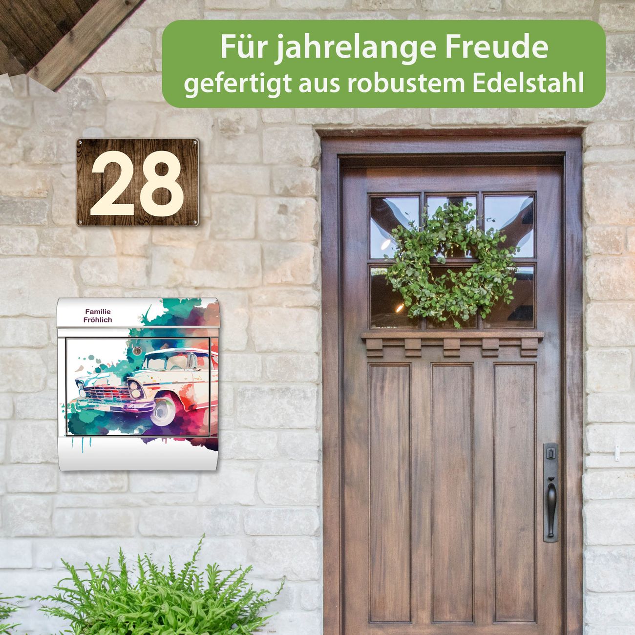 FUNKTION: Der banjado Edelstahl Briefkasten mit Motiv Motiv Retro-Auto Aquarell bietet Ihnen mit seinem Fassungsvermögen genügend Platz auch für große A4 Sendungen. Das integrierte Zeitungsfach eignet sich hervorragend um unkompliziert die Tageszeitung zu fassen. Auf Wunsch können Sie bei uns den passenden Ständer kaufen und so aus dem Wandbriefkasten einen Standbriefkasten machen. DESIGN: Der Motivbriefkasten hat ein sehr ansprechendes und ausgefallenes Design, damit entlocken Sie Ihren Nachbarn und dem Postboten ein Lächeln. Heben Sie Sich ab von der tristen grauen Masse ohne auf Funktionalität zu verzichten. DETAILS: Der Design Briefkasten mit Motiv Motiv Retro-Auto Aquarell besteht aus hochwertigem 18/0 Edelstahl. Das Motiv besteht aus einer wetter- und UV-resistenten Folie, die mit einem Schutzlaminat überzogen ist. Der Briefkasten wird mit Montagematerial und zwei Schlüsseln geliefert. NUTZEN: Sie können diesen Briefkasten sowohl als Wandbriefkasten montieren oder einen passenden Ständer auswählen und als Standbriefkasten einbetonieren. Die Größe bietet genügend Platz für Sendungen aller Art, das hochwertige Edelstahl ist rostfrei und die Motivfolie absolut wetterfest. SCHUTZ: Um Ihre Post optimal vor Witterungseinflüssen wie Starkregen zu schützen, empfehlen wir, den Briefkasten geschützt anzubringen. BANJADO: Ihr Briefkasten wird in Sachsen in einer kleinen Manufaktur von Hand veredelt. Die Motivfolie ist lösungsmittelfrei und schutzlaminiert, dies sorgt für einen langen Halt. Wir legen großen Wert auf die Verbindung von Funktionalität und Design. Sie erhalten Handarbeit aus Sachsen.
