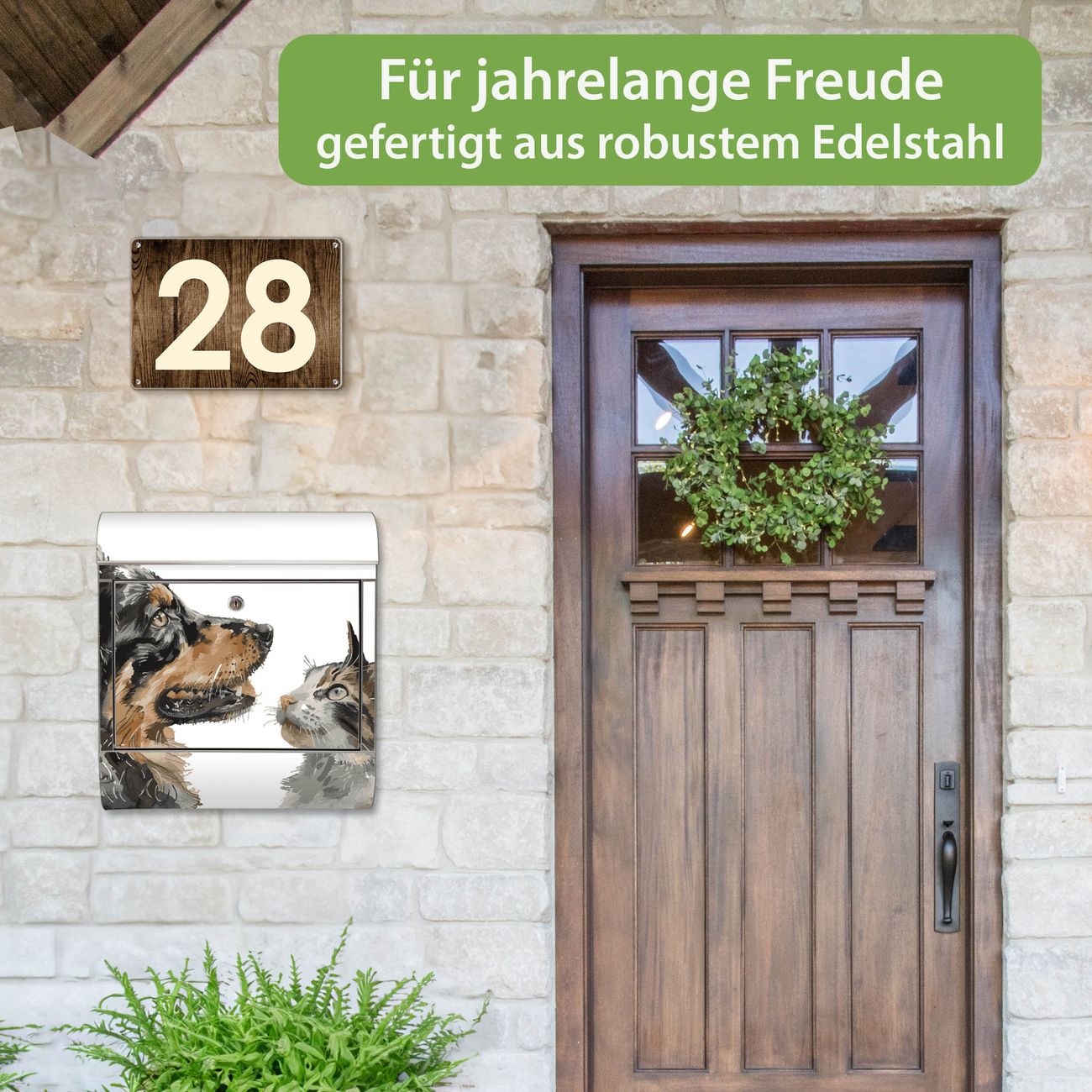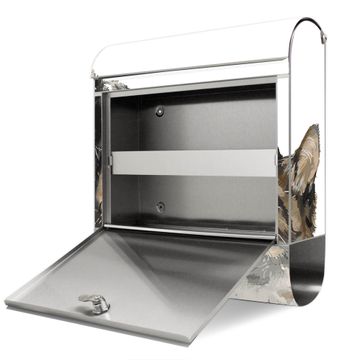 FUNKTION: Der banjado Edelstahl Briefkasten mit Motiv Motiv Tierische Begegnung bietet Ihnen mit seinem Fassungsvermögen genügend Platz auch für große A4 Sendungen. Das integrierte Zeitungsfach eignet sich hervorragend um unkompliziert die Tageszeitung zu fassen. Auf Wunsch können Sie bei uns den passenden Ständer kaufen und so aus dem Wandbriefkasten einen Standbriefkasten machen. DESIGN: Der Motivbriefkasten hat ein sehr ansprechendes und ausgefallenes Design, damit entlocken Sie Ihren Nachbarn und dem Postboten ein Lächeln. Heben Sie Sich ab von der tristen grauen Masse ohne auf Funktionalität zu verzichten. DETAILS: Der Design Briefkasten mit Motiv Motiv Tierische Begegnung besteht aus hochwertigem 18/0 Edelstahl. Das Motiv besteht aus einer wetter- und UV-resistenten Folie, die mit einem Schutzlaminat überzogen ist. Der Briefkasten wird mit Montagematerial und zwei Schlüsseln geliefert. NUTZEN: Sie können diesen Briefkasten sowohl als Wandbriefkasten montieren oder einen passenden Ständer auswählen und als Standbriefkasten einbetonieren. Die Größe bietet genügend Platz für Sendungen aller Art, das hochwertige Edelstahl ist rostfrei und die Motivfolie absolut wetterfest. SCHUTZ: Um Ihre Post optimal vor Witterungseinflüssen wie Starkregen zu schützen, empfehlen wir, den Briefkasten geschützt anzubringen. BANJADO: Ihr Briefkasten wird in Sachsen in einer kleinen Manufaktur von Hand veredelt. Die Motivfolie ist lösungsmittelfrei und schutzlaminiert, dies sorgt für einen langen Halt. Wir legen großen Wert auf die Verbindung von Funktionalität und Design. Sie erhalten Handarbeit aus Sachsen.
