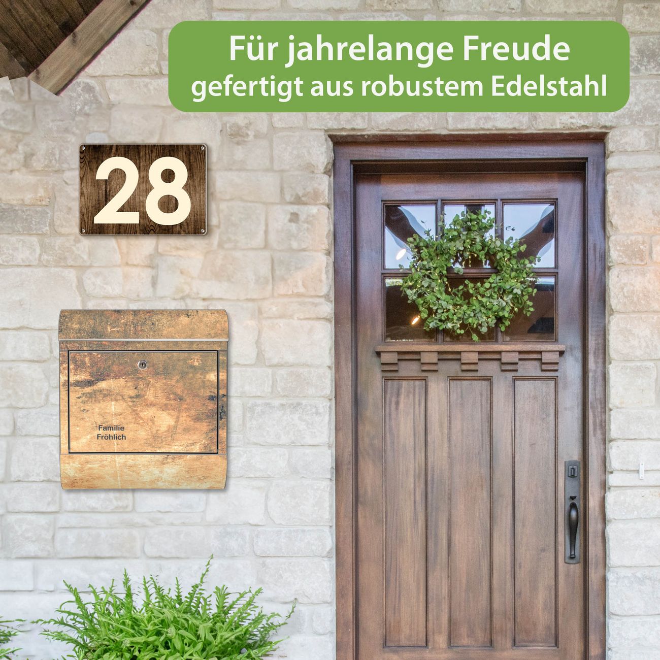 FUNKTION: Der banjado Edelstahl Briefkasten mit Motiv Motiv Verwittertes Holz 2 bietet Ihnen mit seinem Fassungsvermögen genügend Platz auch für große A4 Sendungen. Das integrierte Zeitungsfach eignet sich hervorragend um unkompliziert die Tageszeitung zu fassen. Auf Wunsch können Sie bei uns den passenden Ständer kaufen und so aus dem Wandbriefkasten einen Standbriefkasten machen. DESIGN: Der Motivbriefkasten hat ein sehr ansprechendes und ausgefallenes Design, damit entlocken Sie Ihren Nachbarn und dem Postboten ein Lächeln. Heben Sie Sich ab von der tristen grauen Masse ohne auf Funktionalität zu verzichten. DETAILS: Der Design Briefkasten mit Motiv Motiv Verwittertes Holz 2 besteht aus hochwertigem 18/0 Edelstahl. Das Motiv besteht aus einer wetter- und UV-resistenten Folie, die mit einem Schutzlaminat überzogen ist. Der Briefkasten wird mit Montagematerial und zwei Schlüsseln geliefert. NUTZEN: Sie können diesen Briefkasten sowohl als Wandbriefkasten montieren oder einen passenden Ständer auswählen und als Standbriefkasten einbetonieren. Die Größe bietet genügend Platz für Sendungen aller Art, das hochwertige Edelstahl ist rostfrei und die Motivfolie absolut wetterfest. SCHUTZ: Um Ihre Post optimal vor Witterungseinflüssen wie Starkregen zu schützen, empfehlen wir, den Briefkasten geschützt anzubringen. BANJADO: Ihr Briefkasten wird in Sachsen in einer kleinen Manufaktur von Hand veredelt. Die Motivfolie ist lösungsmittelfrei und schutzlaminiert, dies sorgt für einen langen Halt. Wir legen großen Wert auf die Verbindung von Funktionalität und Design. Sie erhalten Handarbeit aus Sachsen.