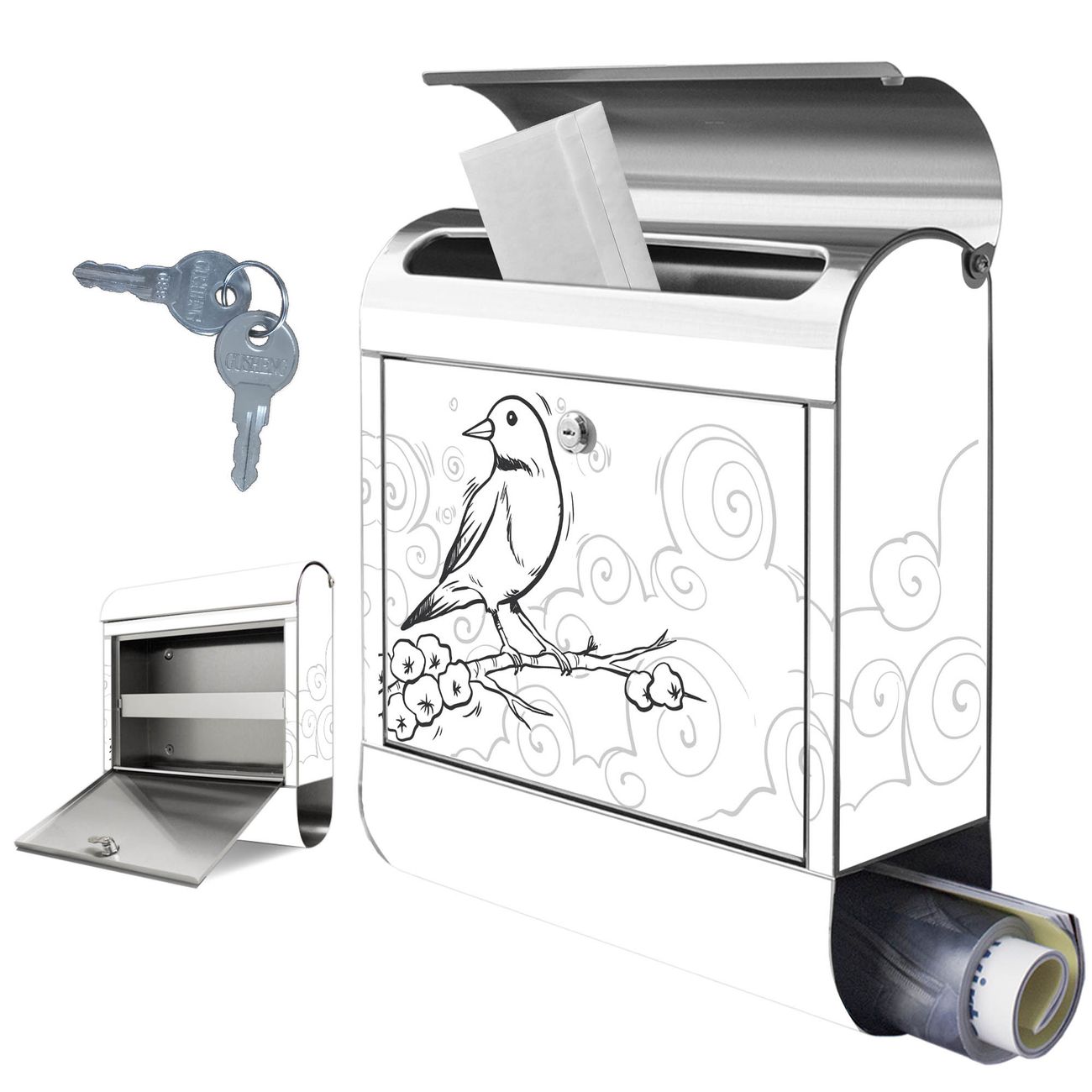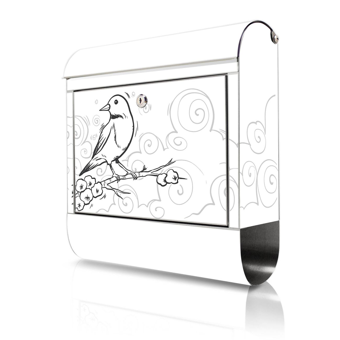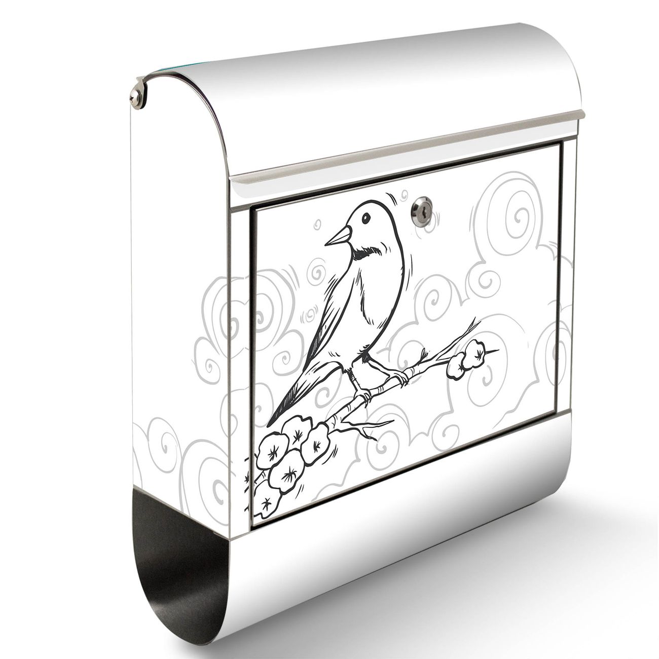 Wandbriefkasten Edelstahl Motiv Vogel auf Blütenzweig