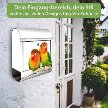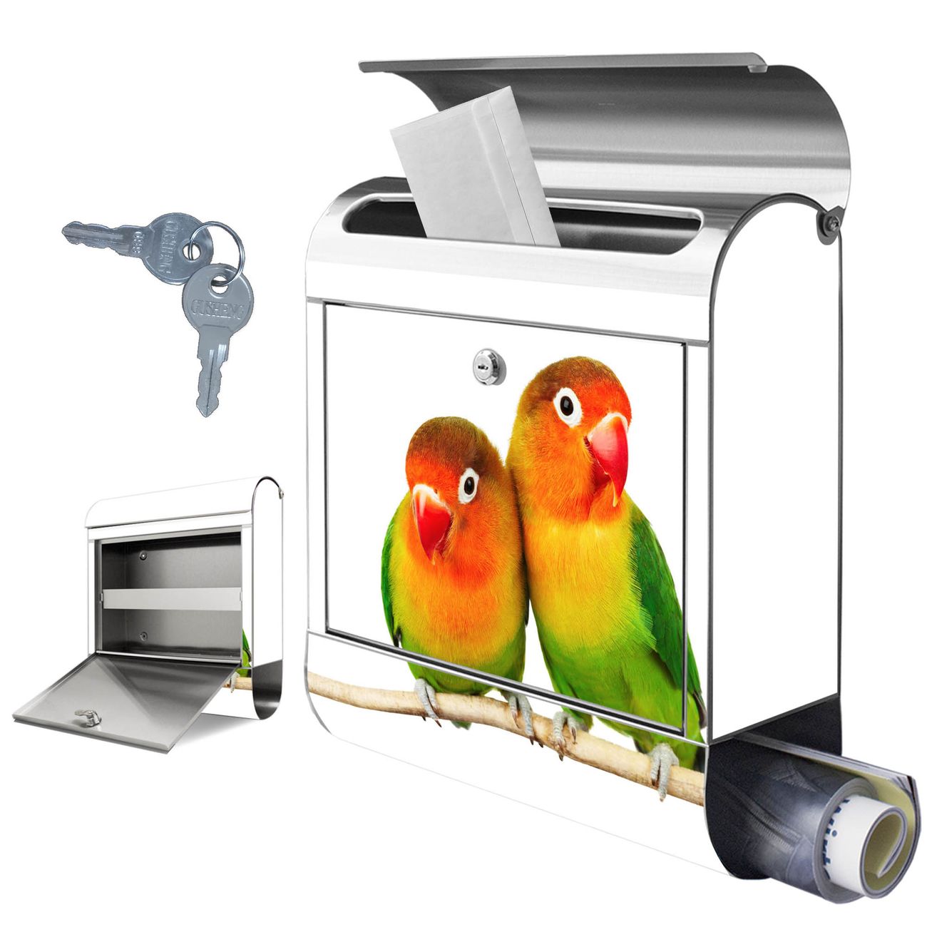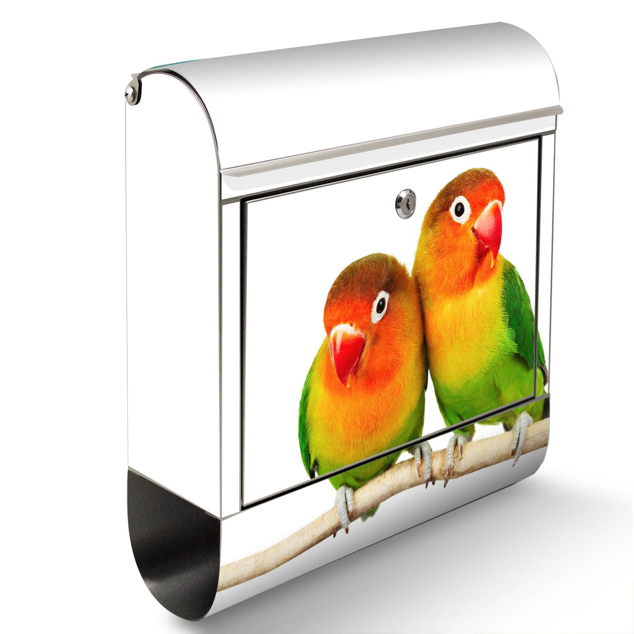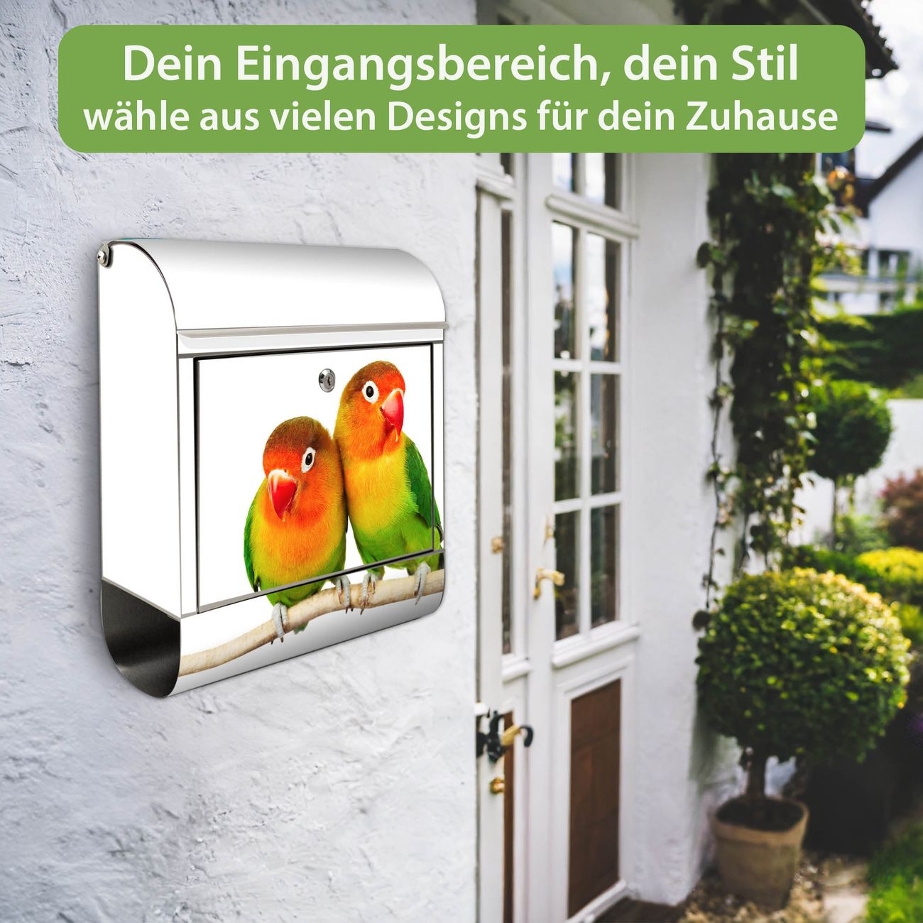 FUNKTION: Der banjado Edelstahl Briefkasten mit Motiv Motiv Papageien bietet Ihnen mit seinem Fassungsvermögen genügend Platz auch für große A4 Sendungen. Das integrierte Zeitungsfach eignet sich hervorragend um unkompliziert die Tageszeitung zu fassen. Auf Wunsch können Sie bei uns den passenden Ständer kaufen und so aus dem Wandbriefkasten einen Standbriefkasten machen. DESIGN: Der Motivbriefkasten hat ein sehr ansprechendes und ausgefallenes Design, damit entlocken Sie Ihren Nachbarn und dem Postboten ein Lächeln. Heben Sie Sich ab von der tristen grauen Masse ohne auf Funktionalität zu verzichten. DETAILS: Der Design Briefkasten mit Motiv Motiv Papageien besteht aus hochwertigem 18/0 Edelstahl. Das Motiv besteht aus einer wetter- und UV-resistenten Folie, die mit einem Schutzlaminat überzogen ist. Der Briefkasten wird mit Montagematerial und zwei Schlüsseln geliefert. NUTZEN: Sie können diesen Briefkasten sowohl als Wandbriefkasten montieren oder einen passenden Ständer auswählen und als Standbriefkasten einbetonieren. Die Größe bietet genügend Platz für Sendungen aller Art, das hochwertige Edelstahl ist rostfrei und die Motivfolie absolut wetterfest. SCHUTZ: Um Ihre Post optimal vor Witterungseinflüssen wie Starkregen zu schützen, empfehlen wir, den Briefkasten geschützt anzubringen. BANJADO: Ihr Briefkasten wird in Sachsen in einer kleinen Manufaktur von Hand veredelt. Die Motivfolie ist lösungsmittelfrei und schutzlaminiert, dies sorgt für einen langen Halt. Wir legen großen Wert auf die Verbindung von Funktionalität und Design. Sie erhalten Handarbeit aus Sachsen.