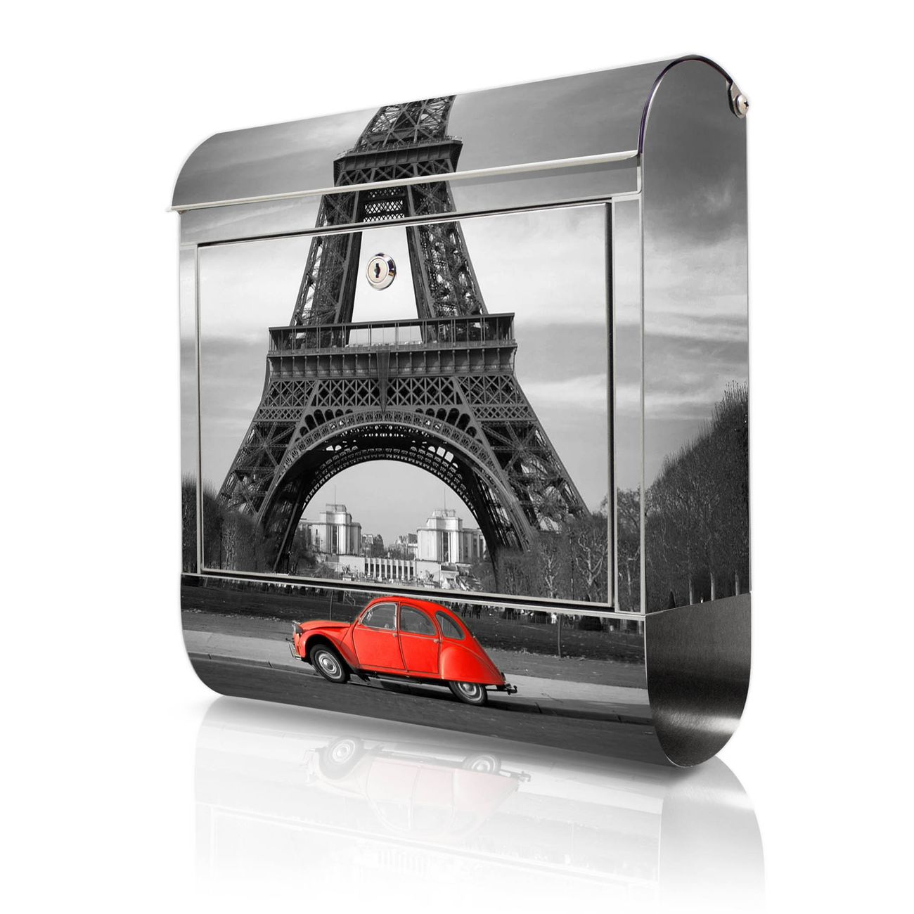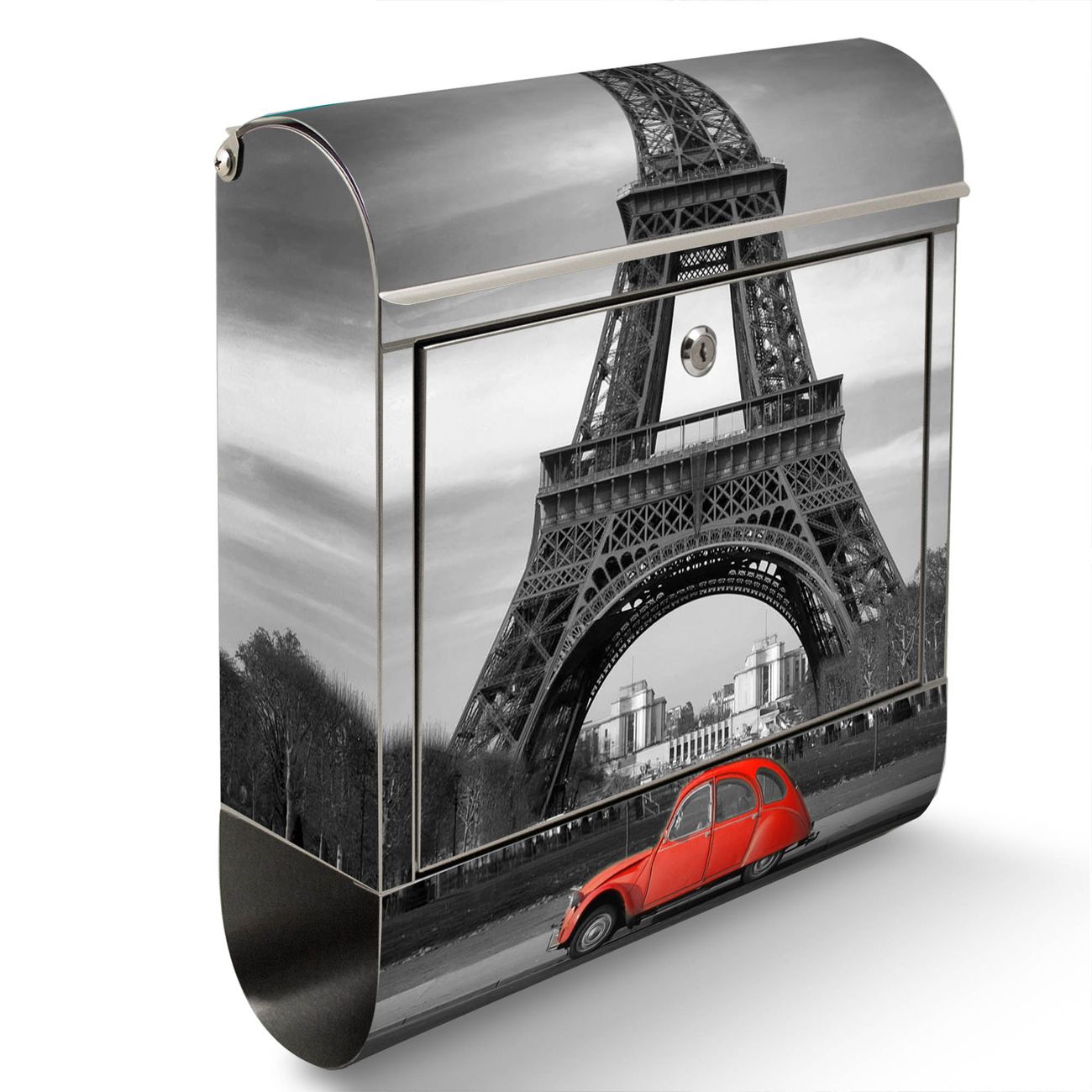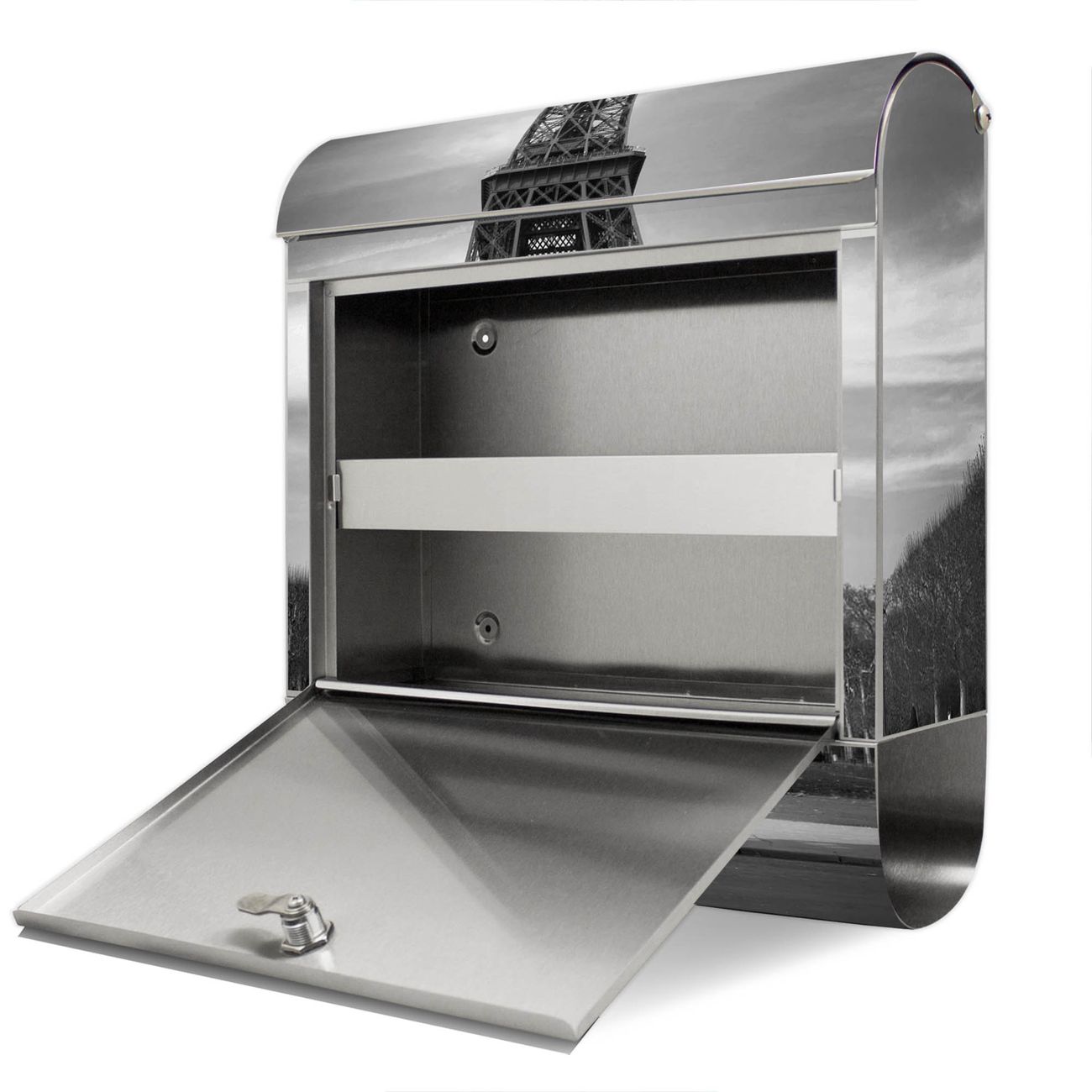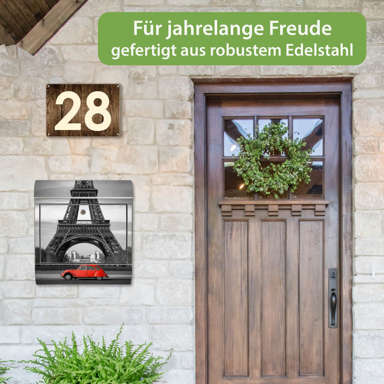 FUNKTION: Der banjado Edelstahl Briefkasten mit Motiv Motiv Paris bietet Ihnen mit seinem Fassungsvermögen genügend Platz auch für große A4 Sendungen. Das integrierte Zeitungsfach eignet sich hervorragend um unkompliziert die Tageszeitung zu fassen. Auf Wunsch können Sie bei uns den passenden Ständer kaufen und so aus dem Wandbriefkasten einen Standbriefkasten machen. DESIGN: Der Motivbriefkasten hat ein sehr ansprechendes und ausgefallenes Design, damit entlocken Sie Ihren Nachbarn und dem Postboten ein Lächeln. Heben Sie Sich ab von der tristen grauen Masse ohne auf Funktionalität zu verzichten. DETAILS: Der Design Briefkasten mit Motiv Motiv Paris besteht aus hochwertigem 18/0 Edelstahl. Das Motiv besteht aus einer wetter- und UV-resistenten Folie, die mit einem Schutzlaminat überzogen ist. Der Briefkasten wird mit Montagematerial und zwei Schlüsseln geliefert. NUTZEN: Sie können diesen Briefkasten sowohl als Wandbriefkasten montieren oder einen passenden Ständer auswählen und als Standbriefkasten einbetonieren. Die Größe bietet genügend Platz für Sendungen aller Art, das hochwertige Edelstahl ist rostfrei und die Motivfolie absolut wetterfest. SCHUTZ: Um Ihre Post optimal vor Witterungseinflüssen wie Starkregen zu schützen, empfehlen wir, den Briefkasten geschützt anzubringen. BANJADO: Ihr Briefkasten wird in Sachsen in einer kleinen Manufaktur von Hand veredelt. Die Motivfolie ist lösungsmittelfrei und schutzlaminiert, dies sorgt für einen langen Halt. Wir legen großen Wert auf die Verbindung von Funktionalität und Design. Sie erhalten Handarbeit aus Sachsen.