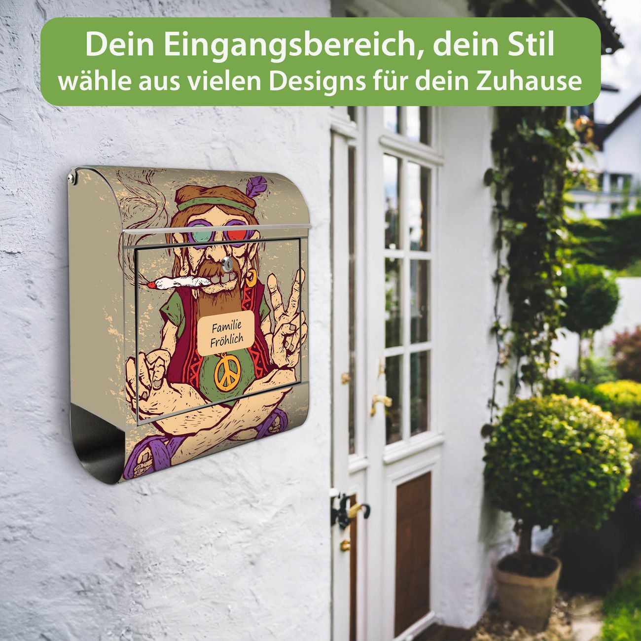 FUNKTION: Der banjado Edelstahl Briefkasten mit Motiv Motiv Peace bietet Ihnen mit seinem Fassungsvermögen genügend Platz auch für große A4 Sendungen. Das integrierte Zeitungsfach eignet sich hervorragend um unkompliziert die Tageszeitung zu fassen. Auf Wunsch können Sie bei uns den passenden Ständer kaufen und so aus dem Wandbriefkasten einen Standbriefkasten machen. DESIGN: Der Motivbriefkasten hat ein sehr ansprechendes und ausgefallenes Design, damit entlocken Sie Ihren Nachbarn und dem Postboten ein Lächeln. Heben Sie Sich ab von der tristen grauen Masse ohne auf Funktionalität zu verzichten. DETAILS: Der Design Briefkasten mit Motiv Motiv Peace besteht aus hochwertigem 18/0 Edelstahl. Das Motiv besteht aus einer wetter- und UV-resistenten Folie, die mit einem Schutzlaminat überzogen ist. Der Briefkasten wird mit Montagematerial und zwei Schlüsseln geliefert. NUTZEN: Sie können diesen Briefkasten sowohl als Wandbriefkasten montieren oder einen passenden Ständer auswählen und als Standbriefkasten einbetonieren. Die Größe bietet genügend Platz für Sendungen aller Art, das hochwertige Edelstahl ist rostfrei und die Motivfolie absolut wetterfest. SCHUTZ: Um Ihre Post optimal vor Witterungseinflüssen wie Starkregen zu schützen, empfehlen wir, den Briefkasten geschützt anzubringen. BANJADO: Ihr Briefkasten wird in Sachsen in einer kleinen Manufaktur von Hand veredelt. Die Motivfolie ist lösungsmittelfrei und schutzlaminiert, dies sorgt für einen langen Halt. Wir legen großen Wert auf die Verbindung von Funktionalität und Design. Sie erhalten Handarbeit aus Sachsen.
