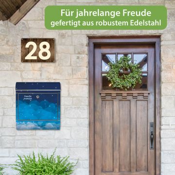 FUNKTION: Der banjado Edelstahl Briefkasten mit Motiv Motiv Sternenhimmel 2 bietet Ihnen mit seinem Fassungsvermögen genügend Platz auch für große A4 Sendungen. Das integrierte Zeitungsfach eignet sich hervorragend um unkompliziert die Tageszeitung zu fassen. Auf Wunsch können Sie bei uns den passenden Ständer kaufen und so aus dem Wandbriefkasten einen Standbriefkasten machen. DESIGN: Der Motivbriefkasten hat ein sehr ansprechendes und ausgefallenes Design, damit entlocken Sie Ihren Nachbarn und dem Postboten ein Lächeln. Heben Sie Sich ab von der tristen grauen Masse ohne auf Funktionalität zu verzichten. DETAILS: Der Design Briefkasten mit Motiv Motiv Sternenhimmel 2 besteht aus hochwertigem 18/0 Edelstahl. Das Motiv besteht aus einer wetter- und UV-resistenten Folie, die mit einem Schutzlaminat überzogen ist. Der Briefkasten wird mit Montagematerial und zwei Schlüsseln geliefert. NUTZEN: Sie können diesen Briefkasten sowohl als Wandbriefkasten montieren oder einen passenden Ständer auswählen und als Standbriefkasten einbetonieren. Die Größe bietet genügend Platz für Sendungen aller Art, das hochwertige Edelstahl ist rostfrei und die Motivfolie absolut wetterfest. SCHUTZ: Um Ihre Post optimal vor Witterungseinflüssen wie Starkregen zu schützen, empfehlen wir, den Briefkasten geschützt anzubringen. BANJADO: Ihr Briefkasten wird in Sachsen in einer kleinen Manufaktur von Hand veredelt. Die Motivfolie ist lösungsmittelfrei und schutzlaminiert, dies sorgt für einen langen Halt. Wir legen großen Wert auf die Verbindung von Funktionalität und Design. Sie erhalten Handarbeit aus Sachsen.