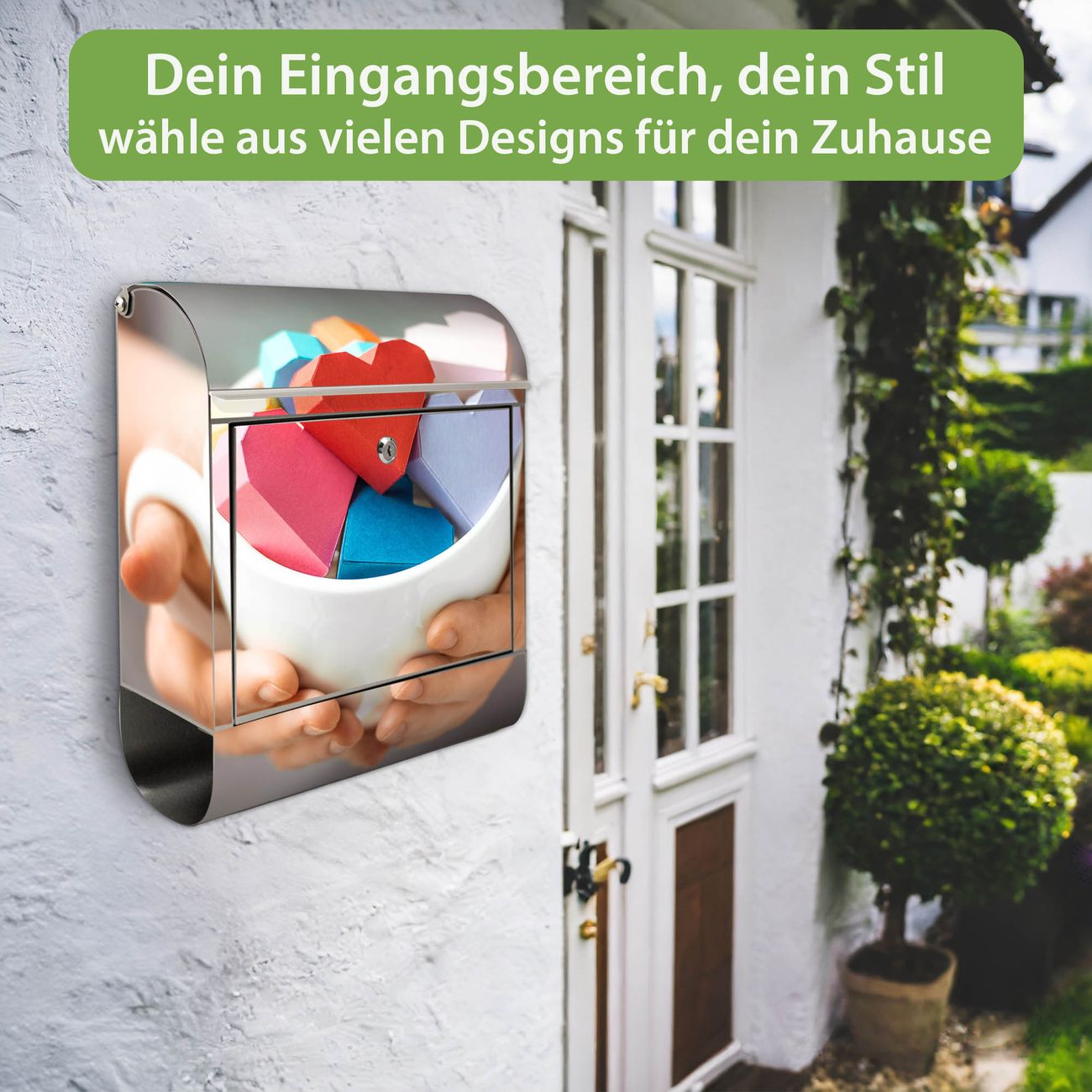Wandbriefkasten Edelstahl Motiv Tasse voller Herzen