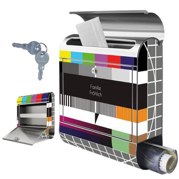 FUNKTION: Der banjado Edelstahl Briefkasten mit Motiv Motiv Testbild bietet Ihnen mit seinem Fassungsvermögen genügend Platz auch für große A4 Sendungen. Das integrierte Zeitungsfach eignet sich hervorragend um unkompliziert die Tageszeitung zu fassen. Auf Wunsch können Sie bei uns den passenden Ständer kaufen und so aus dem Wandbriefkasten einen Standbriefkasten machen. DESIGN: Der Motivbriefkasten hat ein sehr ansprechendes und ausgefallenes Design, damit entlocken Sie Ihren Nachbarn und dem Postboten ein Lächeln. Heben Sie Sich ab von der tristen grauen Masse ohne auf Funktionalität zu verzichten. DETAILS: Der Design Briefkasten mit Motiv Motiv Testbild besteht aus hochwertigem 18/0 Edelstahl. Das Motiv besteht aus einer wetter- und UV-resistenten Folie, die mit einem Schutzlaminat überzogen ist. Der Briefkasten wird mit Montagematerial und zwei Schlüsseln geliefert. NUTZEN: Sie können diesen Briefkasten sowohl als Wandbriefkasten montieren oder einen passenden Ständer auswählen und als Standbriefkasten einbetonieren. Die Größe bietet genügend Platz für Sendungen aller Art, das hochwertige Edelstahl ist rostfrei und die Motivfolie absolut wetterfest. SCHUTZ: Um Ihre Post optimal vor Witterungseinflüssen wie Starkregen zu schützen, empfehlen wir, den Briefkasten geschützt anzubringen. BANJADO: Ihr Briefkasten wird in Sachsen in einer kleinen Manufaktur von Hand veredelt. Die Motivfolie ist lösungsmittelfrei und schutzlaminiert, dies sorgt für einen langen Halt. Wir legen großen Wert auf die Verbindung von Funktionalität und Design. Sie erhalten Handarbeit aus Sachsen.